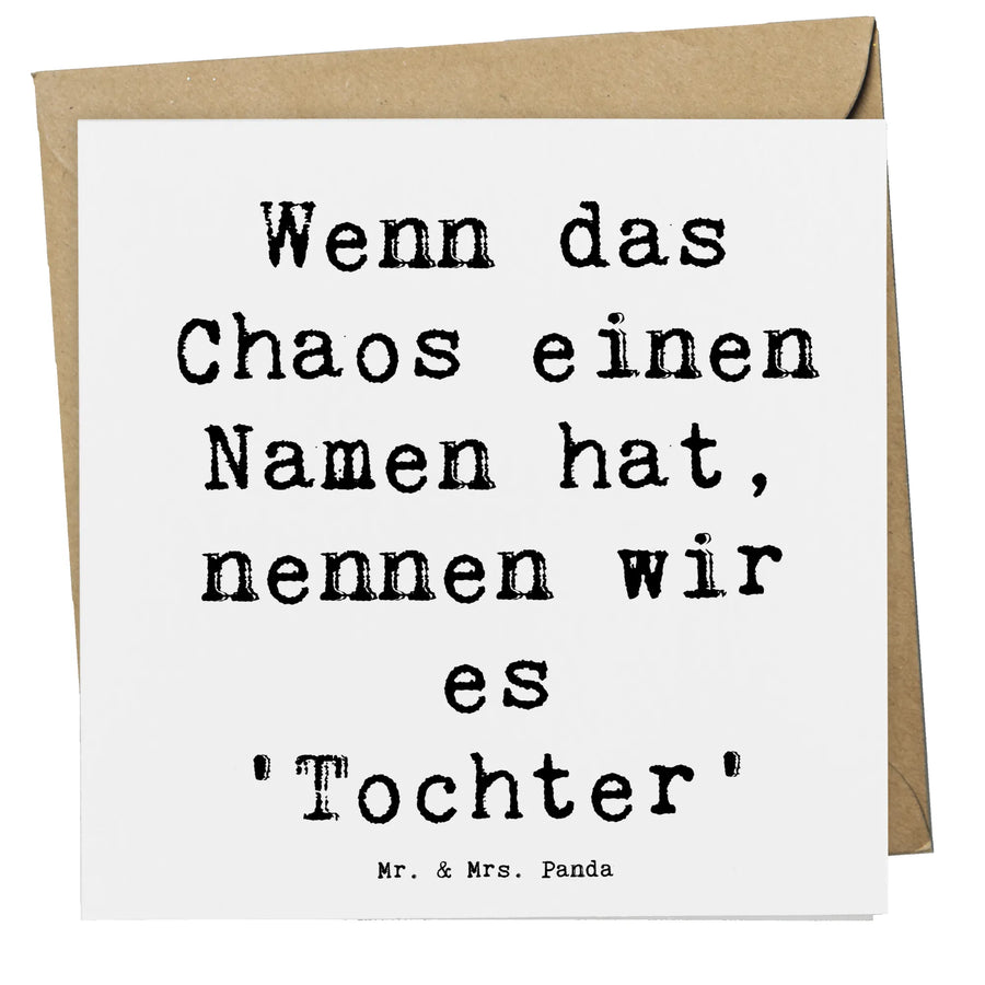 Die Deluxe Karte "Tochter" aus der Reihe Familie & Verwandte von Mr. & Mrs. Panda ist das perfekte Geschenk, um deine Liebe und Wertschätzung für deine Tochter zum Ausdruck zu bringen. Diese wunderschöne, hochwertige Klappkarte ist auf 300 Gramm Karton gedruckt und besticht durch ihre edle Optik. Die Vorderseite ziert ein liebevolles Motiv mit dem Spruch "Wenn das Chaos einen Namen hat, nennen wir es 'Tochter'". Dieser Spruch spricht die Herzen der Eltern an, denn Töchter bringen nicht nur Freude und Spaß in unser Leben, sondern sind auch eine Quelle des Stolzes und der Inspiration.