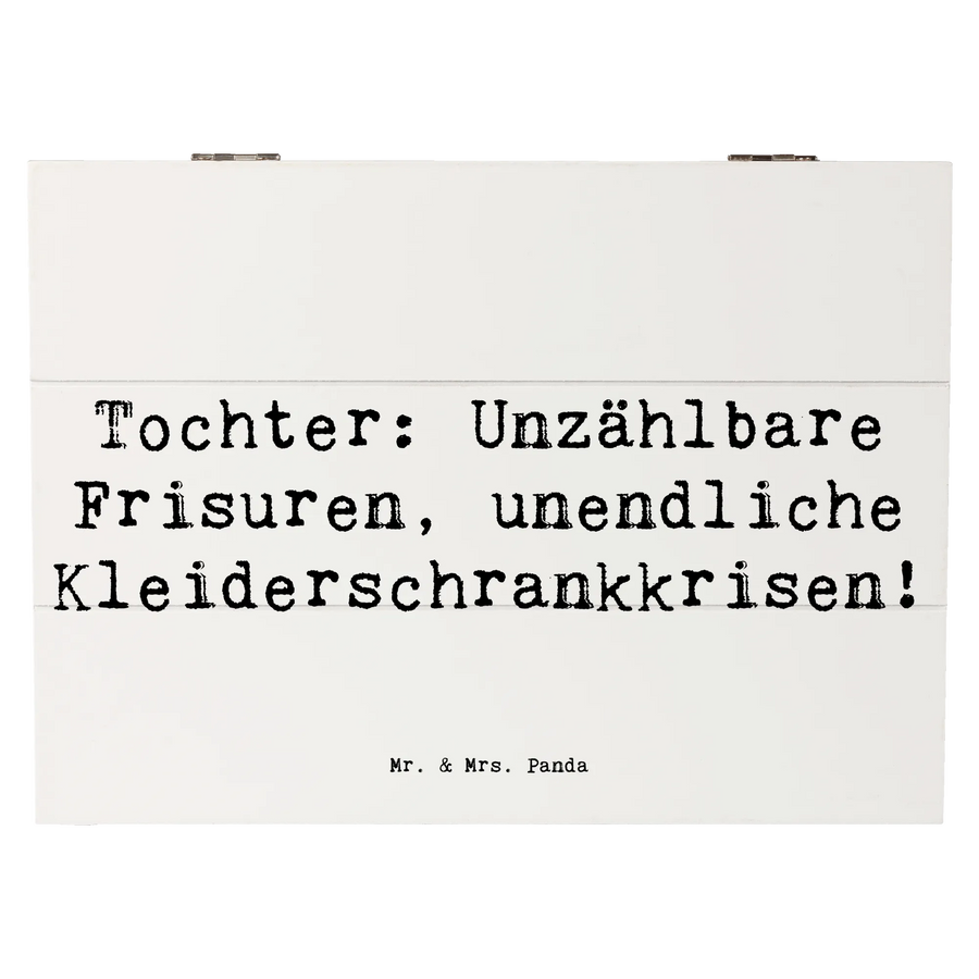Die wunderschöne Holzkiste von Mr. & Mrs. Panda ist das perfekte Geschenk für Deine Tochter! Diese zauberhafte Erinnerungskiste, bedruckt mit dem liebevollen Spruch "Tochter: Unzählbare Frisuren, unendliche Kleiderschrankkrisen!", bringt nicht nur Freude, sondern ist auch ein stilvoller Aufbewahrungsort für all Deine Schätze.