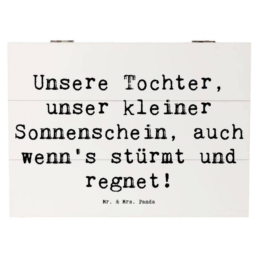 Suchst du nach dem perfekten Geschenk für deine geliebte Tochter? Die wunderschöne Holzkiste von Mr. & Mrs. Panda ist die ideale Wahl! Mit einem charmanten Motiv, das ausdrückt: 'Unsere Tochter, unser kleiner Sonnenschein, auch wenn's stürmt und regnet!', ist diese Kiste nicht nur ein Blickfang, sondern auch ein wertvoller Aufbewahrungsort für die besonderen Erinnerungen deiner kleinen Prinzessin. Egal ob für Geburtstage, Kommunion, Konfirmation oder einfach nur so - diese Erinnerungskiste wird Herzen höherschlagen lassen!
