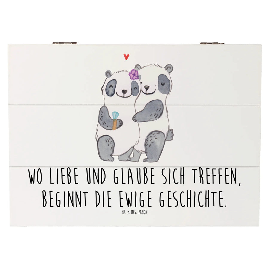 Suchst du nach dem perfekten Geschenk für eine kirchliche Trauung? Unsere wunderschöne Holzkiste von Mr. & Mrs. Panda ist genau das Richtige! Mit dem zauberhaften Spruch "Wo Liebe und Glaube sich treffen, beginnt die ewige Geschichte." wird jede Erinnerung zu etwas ganz Besonderem.