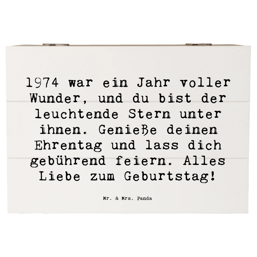 Entdecke die wunderschöne Holzkiste "1974 Geburtstag" von Mr. & Mrs. Panda! Diese besondere Erinnerungskiste ist mehr als nur eine schlichte Aufbewahrungsbox – sie erzählt Geschichten und bewahrt wundervolle Erlebnisse.
