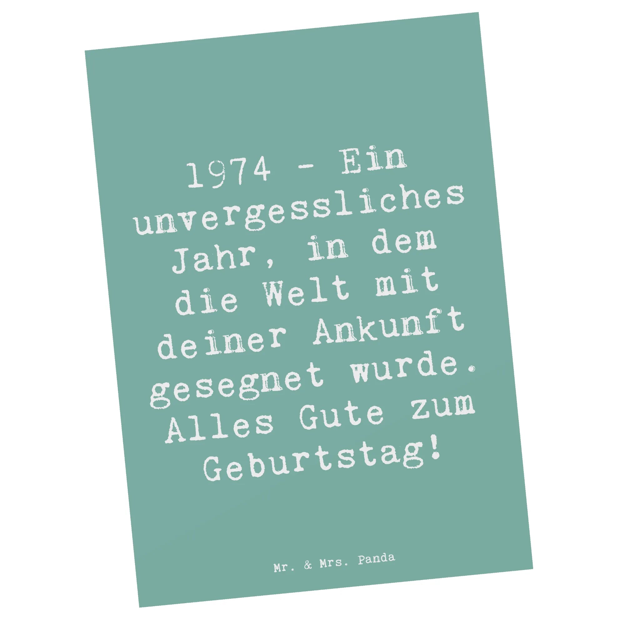 Die perfekte Postkarte für alle, die 1974 geboren wurden! Diese liebevoll gestaltete Karte aus der besonderen Kollektion "Geburtstag Geburtsjahr" von Mr. & Mrs. Panda ist eine wunderbare Art, einem besonderen Menschen zum Geburtstag zu gratulieren.