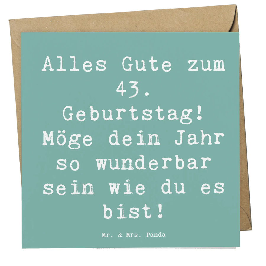 Die Deluxe Karte zum 43. Geburtstag von Mr. & Mrs. Panda ist das perfekte Geschenk für alle, die diesen besonderen Tag gebührend feiern möchten! Mit einem charmanten Slogan "Alles Gute zum 43. Geburtstag! Möge dein Jahr so wunderbar sein wie du es bist!" eignet sich diese Karte ideal für Geburtstagsgrüße, Glückwünsche und Einladungen. Sie vermittelt Freude und Lebensfreude und wird sicherlich das Herz des Empfängers erwärmen.