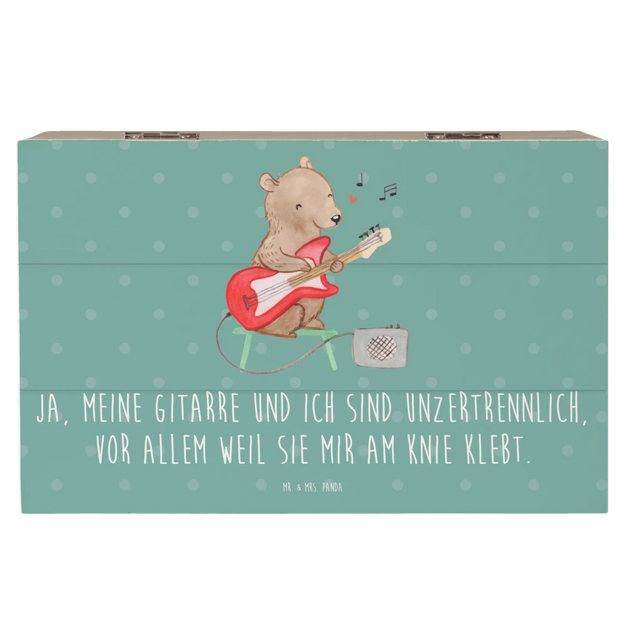 Die wunderschöne Holzkiste von Mr. & Mrs. Panda ist mehr als nur eine Aufbewahrungsbox – sie ist ein magischer Ort für all deine Schätze! Mit ihrem wunderschönen Motiv einer Gitarre und dem witzigen Spruch 'Ja, meine Gitarre und ich sind unzertrennlich, vor allem weil sie mir am Knie klebt' bringt sie Freude und einen Hauch von Musik in dein Leben.
