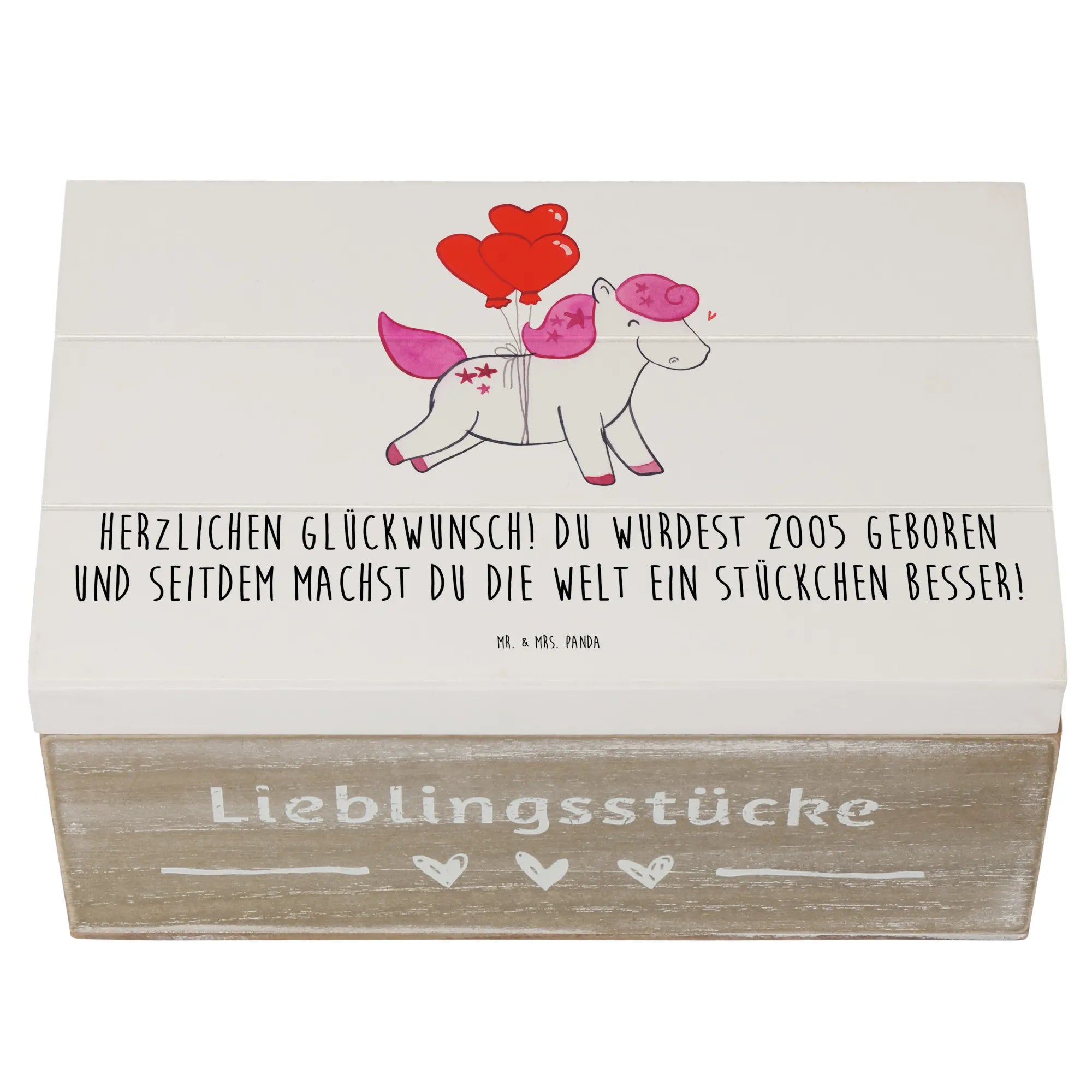 Die wunderschöne Holzkiste von Mr. & Mrs. Panda ist das perfekte Geschenk für alle, die 2005 geboren wurden und ihren Geburtstag gebührend feiern möchten! Mit dem liebevoll gestalteten Motiv "Herzlichen Glückwunsch! Du wurdest 2005 geboren und seitdem machst du die Welt ein Stückchen besser!" wird diese Kiste nicht nur zu einem tollen Blickfang, sondern auch zu einem unvergesslichen Erinnerungsstück.