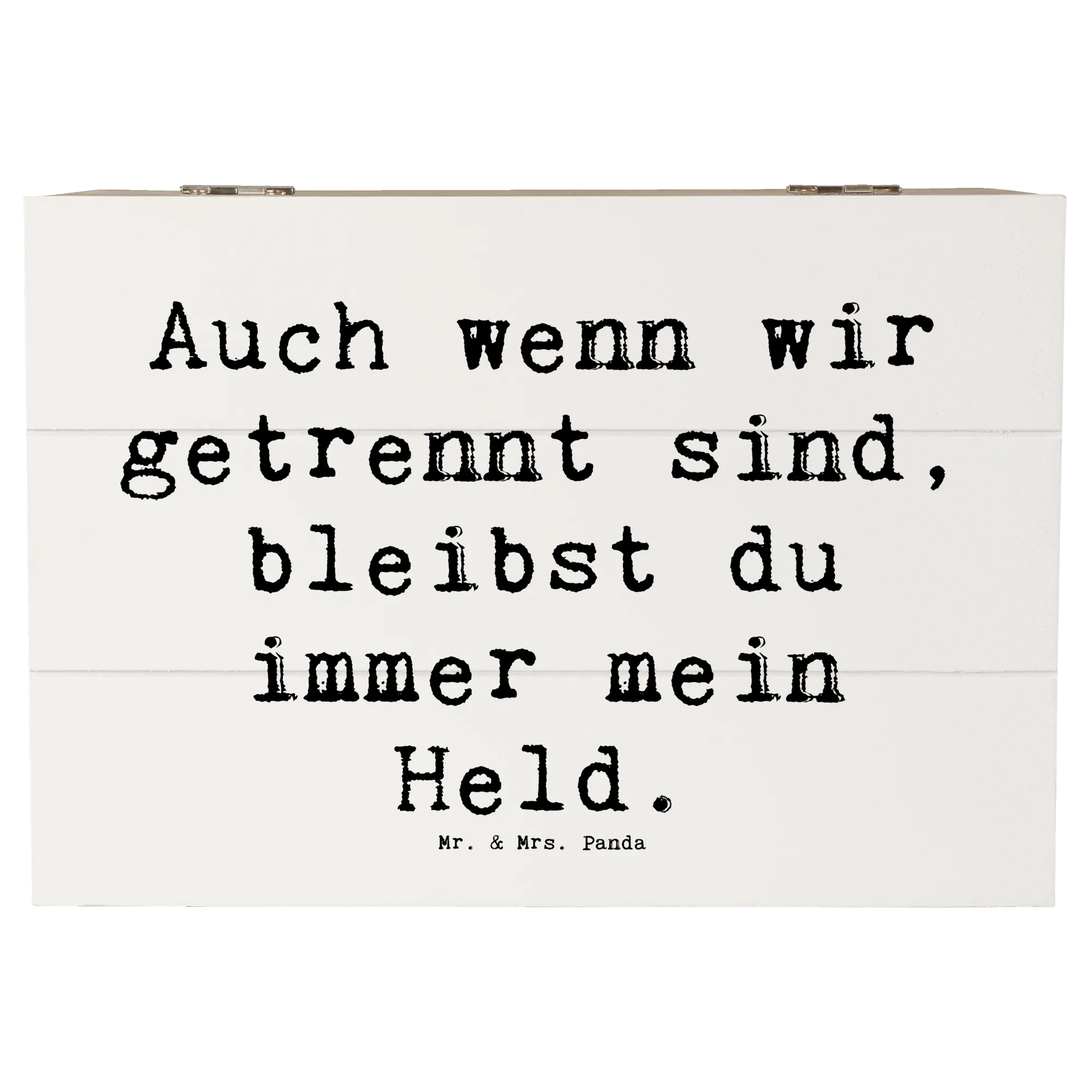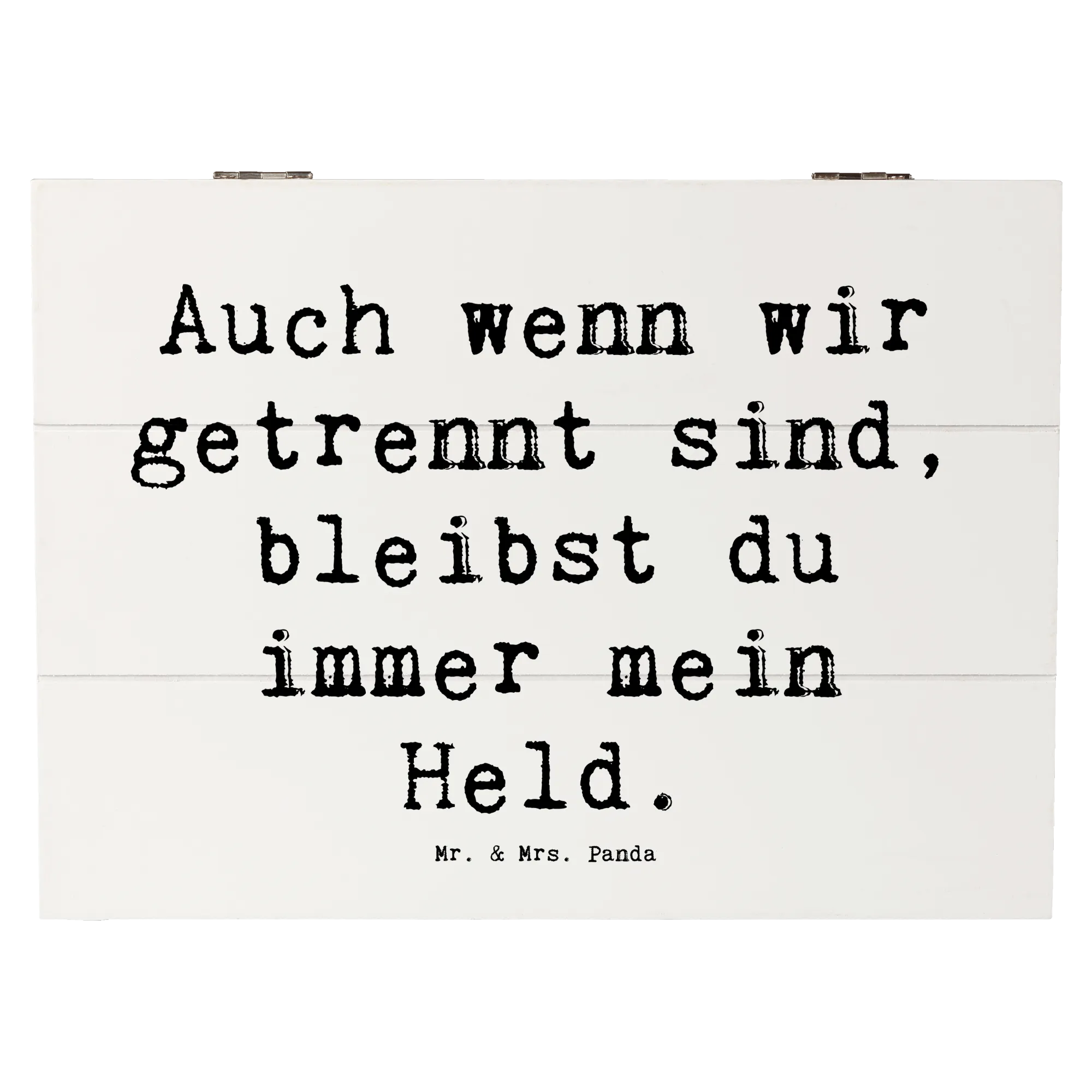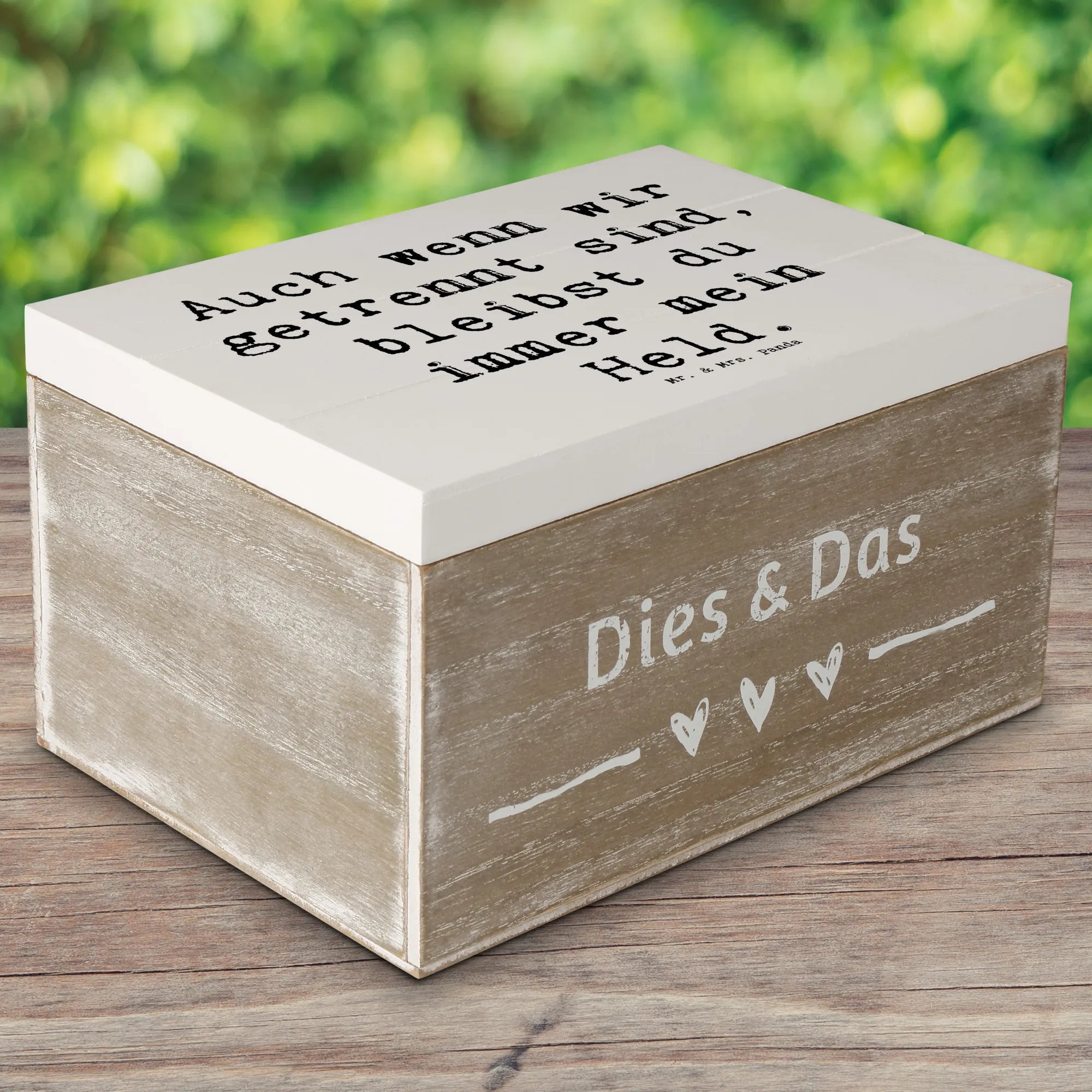 Sie kann als Erinnerungskiste, Schatzkiste oder Aufbewahrungsbox genutzt werden und bietet Platz für wertvolle Erinnerungen, Fotos oder kleine Schätze. Die Kiste ist nicht nur stabil und praktisch, sondern auch ein wunderschöner Hingucker. Die Botschaft "Auch wenn wir getrennt sind, bleibst du immer mein Held." wird Herzen berühren und Gedanken und Erinnerungen an wunderschöne Momente lebendig halten.