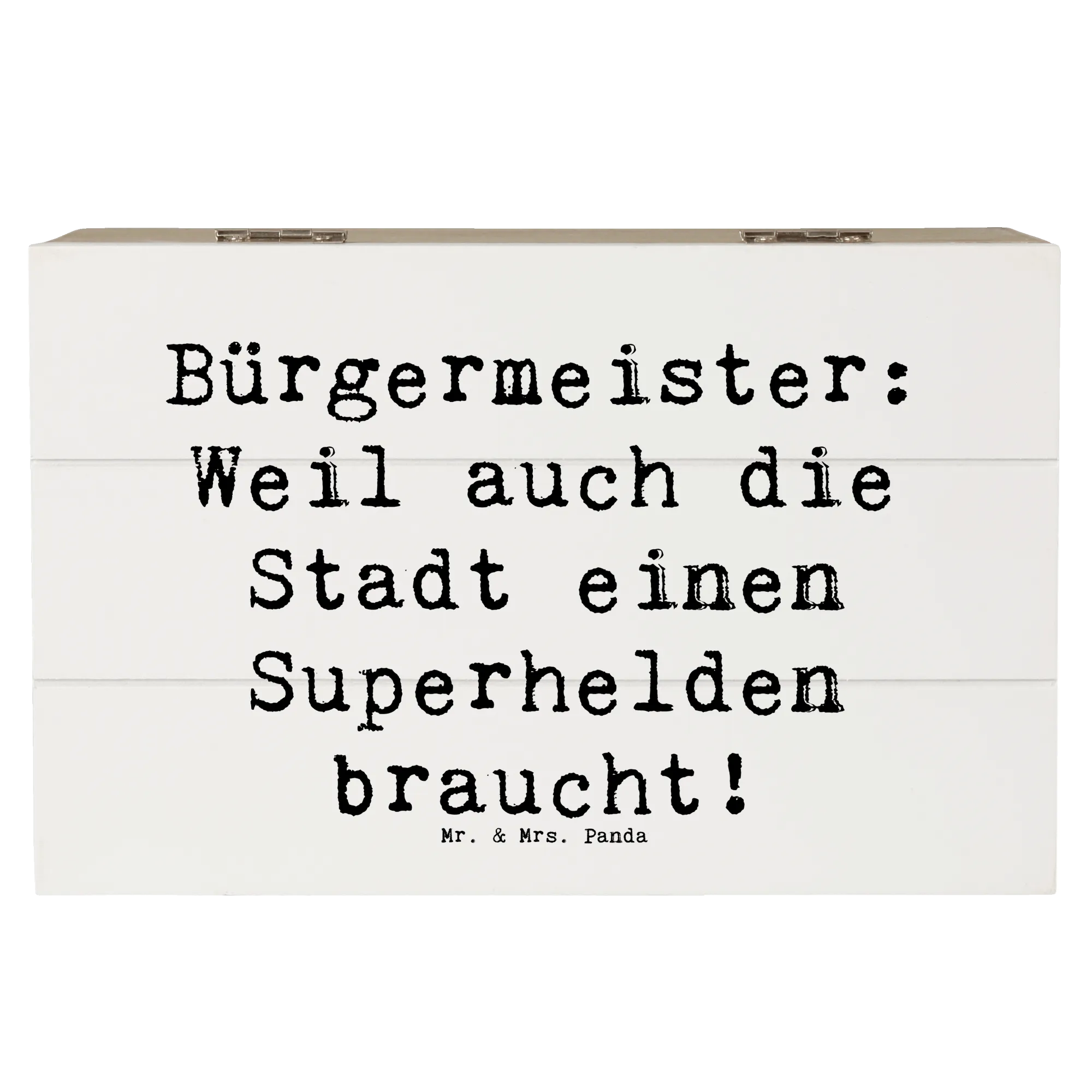 Entdecke die zauberhafte Holzkiste von Mr. & Mrs. Panda, die mit einem einzigartigen Motiv des Bürgermeisters verziert ist: 'Weil auch die Stadt einen Superhelden braucht!' Diese wunderschöne Erinnerungskiste ist nicht nur ein Augenfang, sondern auch ein praktisches Aufbewahrungsaccessoire.