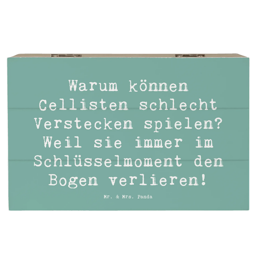 Entdecke die perfekte Holzkiste von Mr. & Mrs. Panda im einzigartigen Cello-Design! Diese wunderschöne Kiste mit dem Spruch "Warum können Cellisten schlecht Verstecken spielen? Weil sie immer im Schlüsselmoment den Bogen verlieren!" bringt nicht nur ein Lächeln auf die Lippen, sondern ist auch das ideale Geschenk für Musikliebhaber und Cellisten.