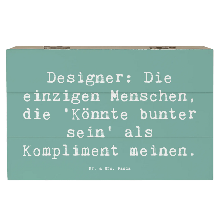 Die wunderschöne Holzkiste von Mr. & Mrs. Panda ist der perfekte Begleiter für kreative Köpfe und Alltagshelden! Ob als schicke Aufbewahrungsbox oder als individuelle Geschenkbox, diese Kiste überzeugt durch ihr einzigartiges Design im Berufemotiv 'Designer'. Mit einem charmanten Spruch, der besagt: 'Designer: Die einzigen Menschen, die "Könnte bunter sein" als Kompliment meinen', drücken wir Wertschätzung für all die kreativen Geister aus, die uns täglich mit ihrem Talent inspirieren.