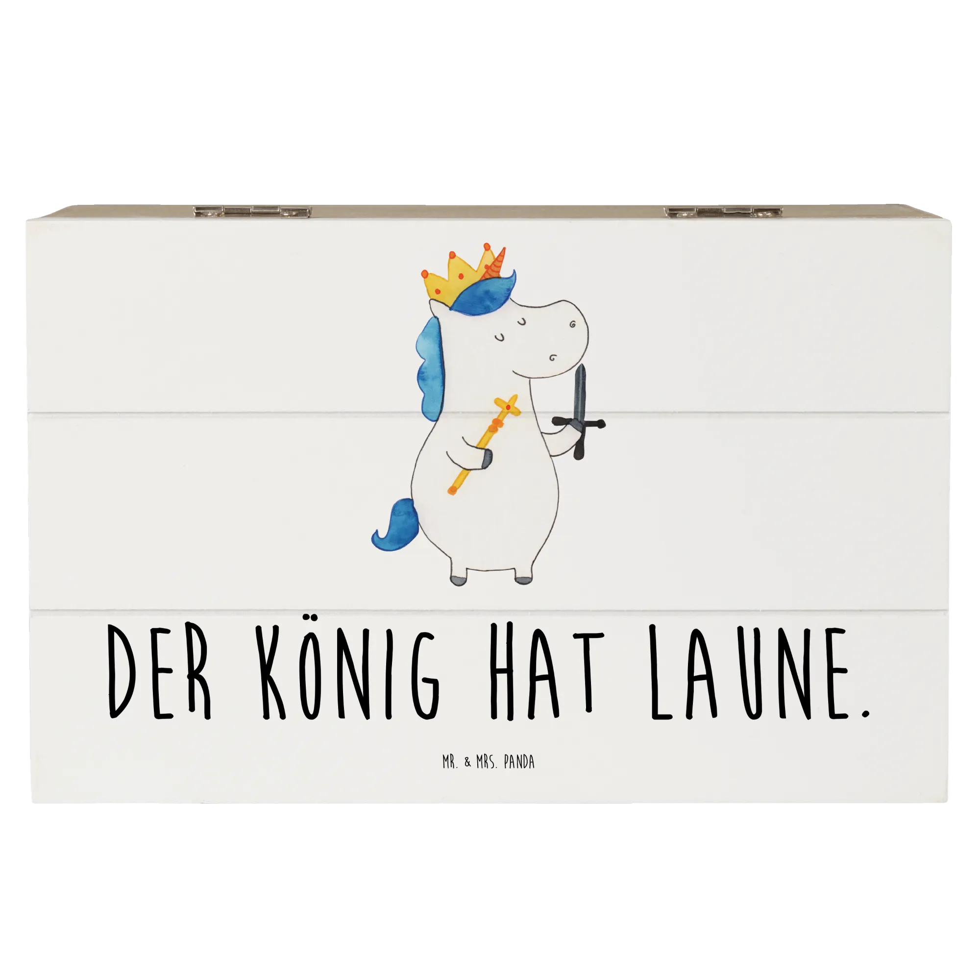 Das süße Einhorn, das stolz mit einer Krone und einem Schwert posiert, wird nicht nur Kinderherzen höher schlagen lassen, sondern bringt auch ein Lächeln in die Gesichter der Erwachsenen. Bei Mr. & Mrs. Panda legen wir großen Wert auf Qualität – die Holzkiste ist aus robuster Holzfaser gefertigt und kann dank der Einschlagscharniere mühelos geöffnet und geschlossen werden. Damit ist sie ideal für die tägliche Nutzung, ohne dabei schnell abzunutzen.