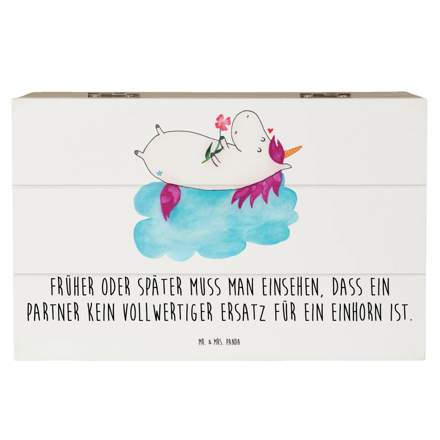 Die wunderschöne Holzkiste von Mr. & Mrs. Panda ist die perfekte Aufbewahrungsbox für all deine kostbaren Erinnerungen. Bedruckt mit dem zauberhaften Motiv "Einhorn verliebt auf Wolke" und dem witzigen Slogan "Früher oder später muss man einsehen, dass ein Partner kein vollwertiger Ersatz für ein Einhorn ist", bringt diese Kiste jedem, der sie sieht, ein Lächeln ins Gesicht.