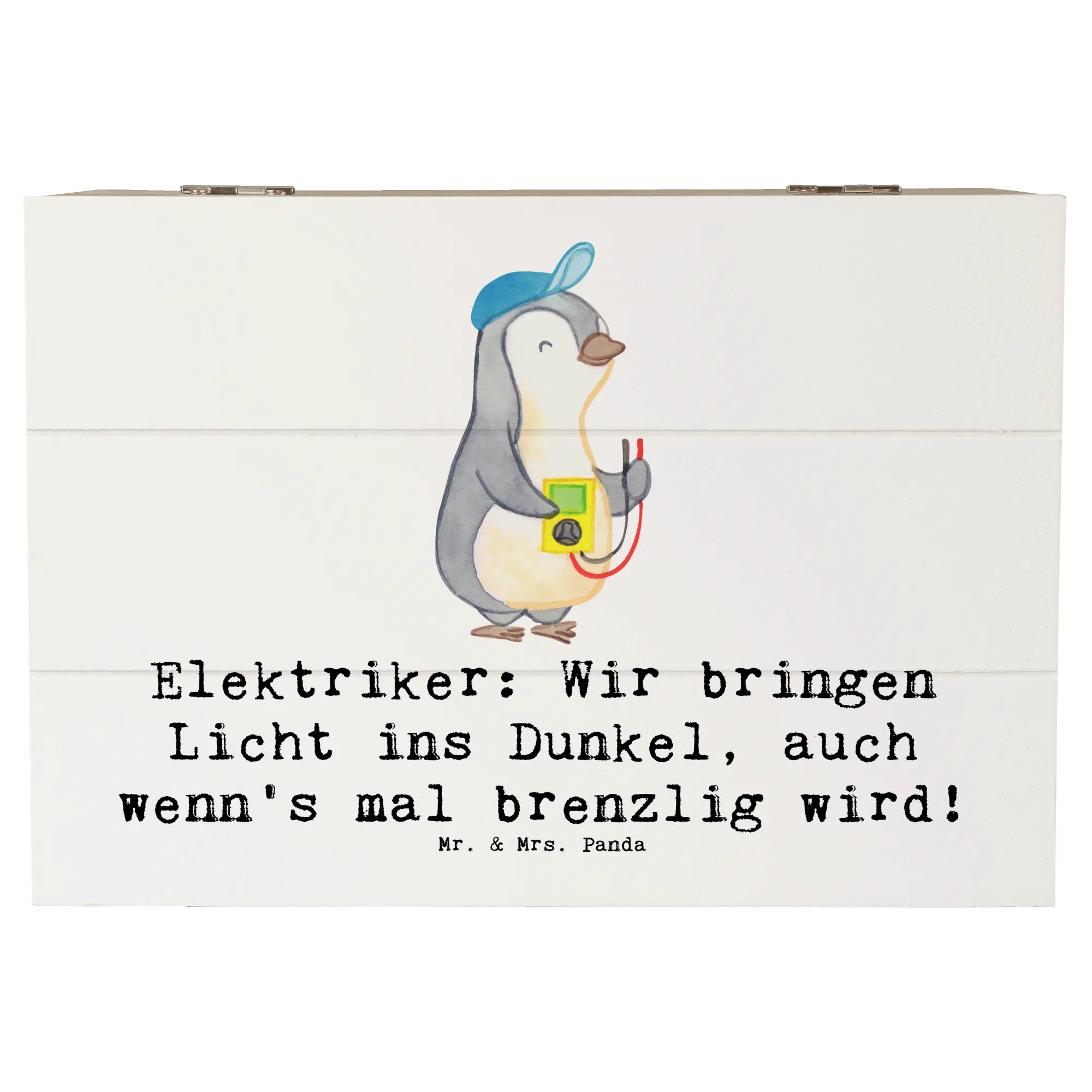 Die Holzkiste "Elektriker: Wir bringen Licht ins Dunkel, auch wenn's mal brenzlig wird!" von Mr. & Mrs. Panda ist der perfekte Begleiter für alle, die das Handwerk lieben und schätzen.