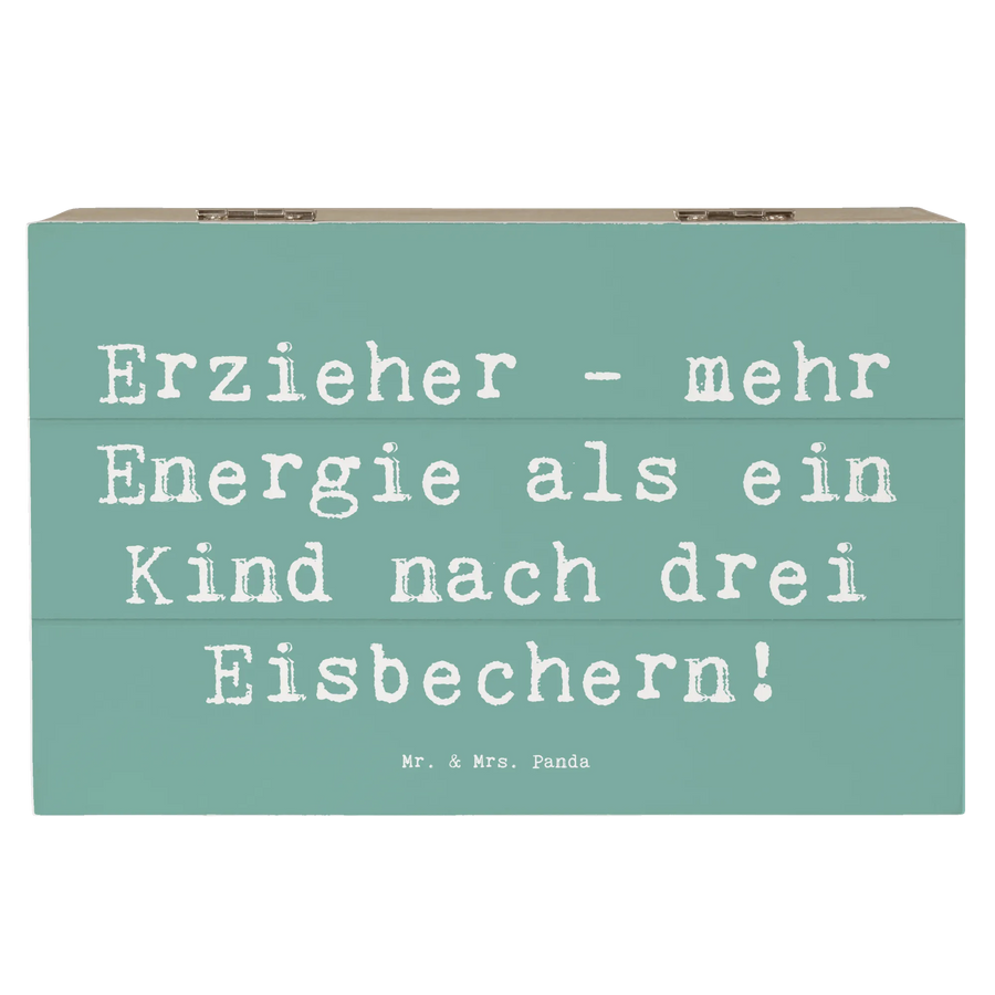 Die wunderschöne Holzkiste von Mr. & Mrs. Panda mit dem liebevollen Motiv „Erzieher - mehr Energie als ein Kind nach drei Eisbechern!“ ist das perfekte Geschenk für Erzieher und Pädagogen. Besonders zu festlichen Anlässen wie dem Abschluss, der Konfirmation oder einfach als Dankeschön für die harte Arbeit, macht sich diese Schatzkiste bestens.
