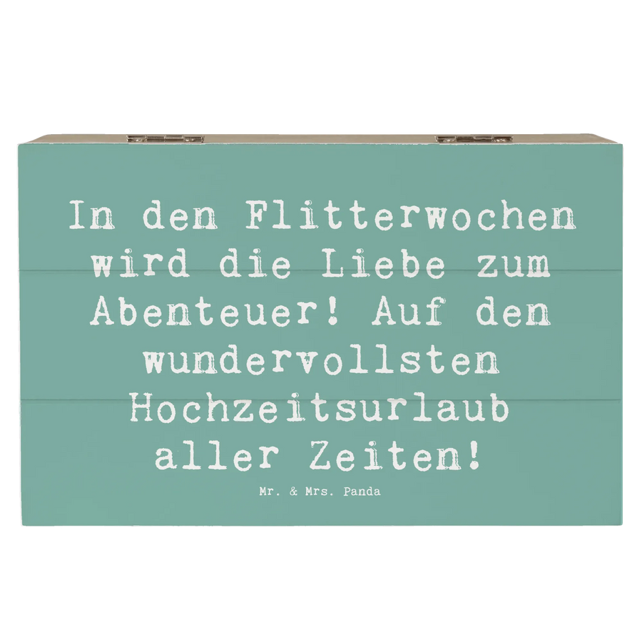 Die wunderschöne Holzkiste von Mr. & Mrs. Panda ist das perfekte Geschenk für frisch verheiratete Paare und solche, die es bald werden! Diese zauberhafte Erinnerungskiste mit dem Motto "In den Flitterwochen wird die Liebe zum Abenteuer! Auf den wundervollsten Hochzeitsurlaub aller Zeiten!" lässt sich hervorragend nutzen, um die schönsten Momente der Hochzeitsreise zu bewahren.
