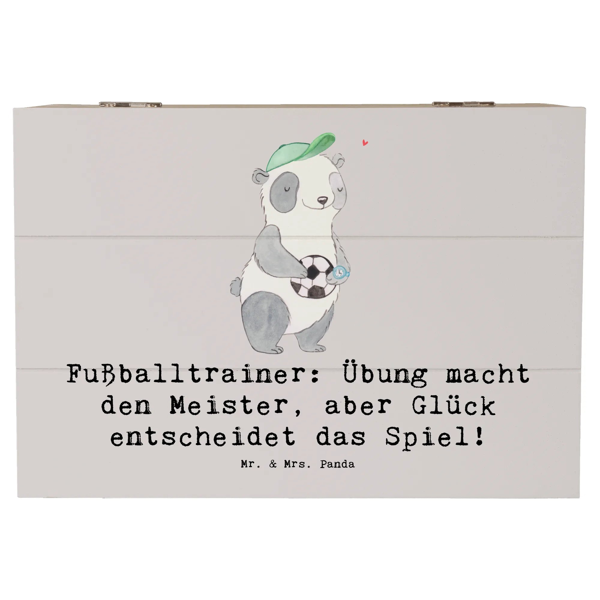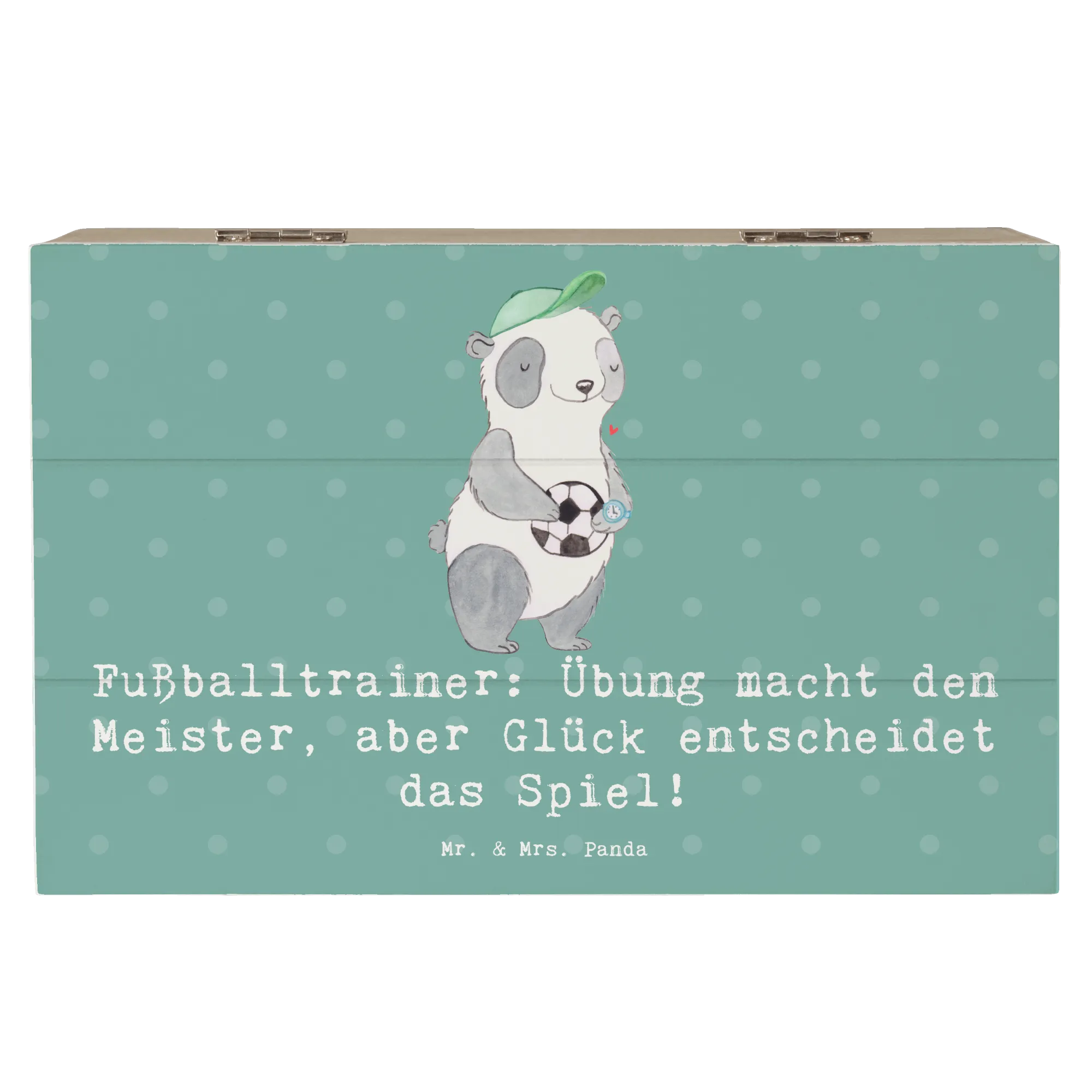 Die wunderschöne Holzkiste von Mr. & Mrs. Panda mit dem Motiv "Fußballtrainer: Übung macht den Meister, aber Glück entscheidet das Spiel!" ist das perfekte Geschenk für jeden Fußballtrainer. Egal ob zum Geburtstag, zur Verabschiedung oder einfach als kleine Aufmerksamkeit zwischendurch - diese Schatzkiste wird sicherlich für Freude sorgen.