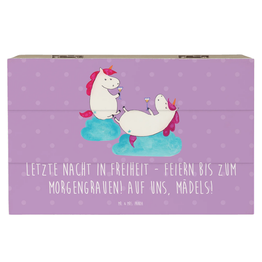 Mach den JGA unvergesslich mit dieser süßen Holzkiste von Mr. & Mrs. Panda. Bedruckt mit dem lustigen Spruch „Letzte Nacht in Freiheit - Feiern bis zum Morgengrauen! Auf uns, Mädels!“ ist sie das perfekte Erinnerungsstück für Braut und Freundinnen. Ideal, um Fotos, kleine Geschenke oder Erinnerungsstücke sicher aufzubewahren.