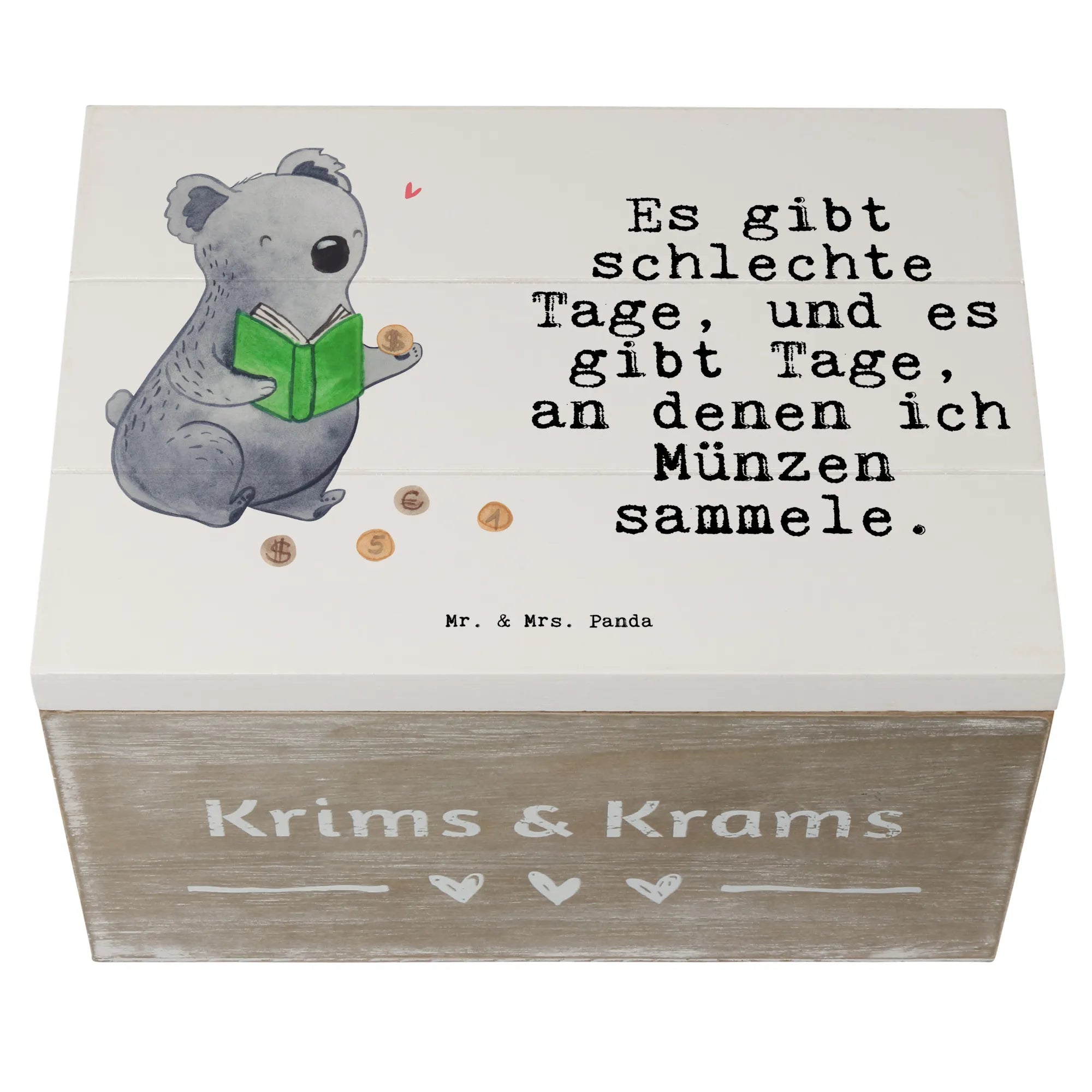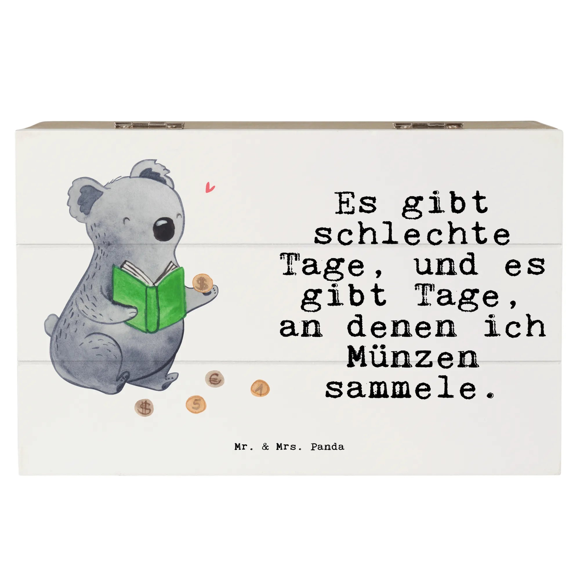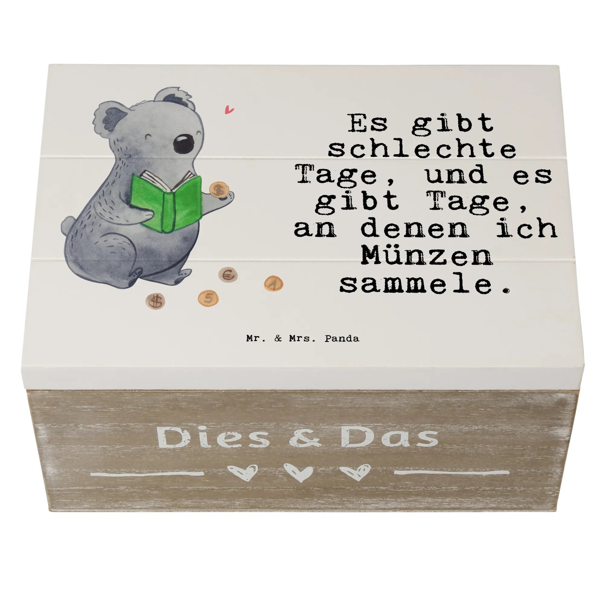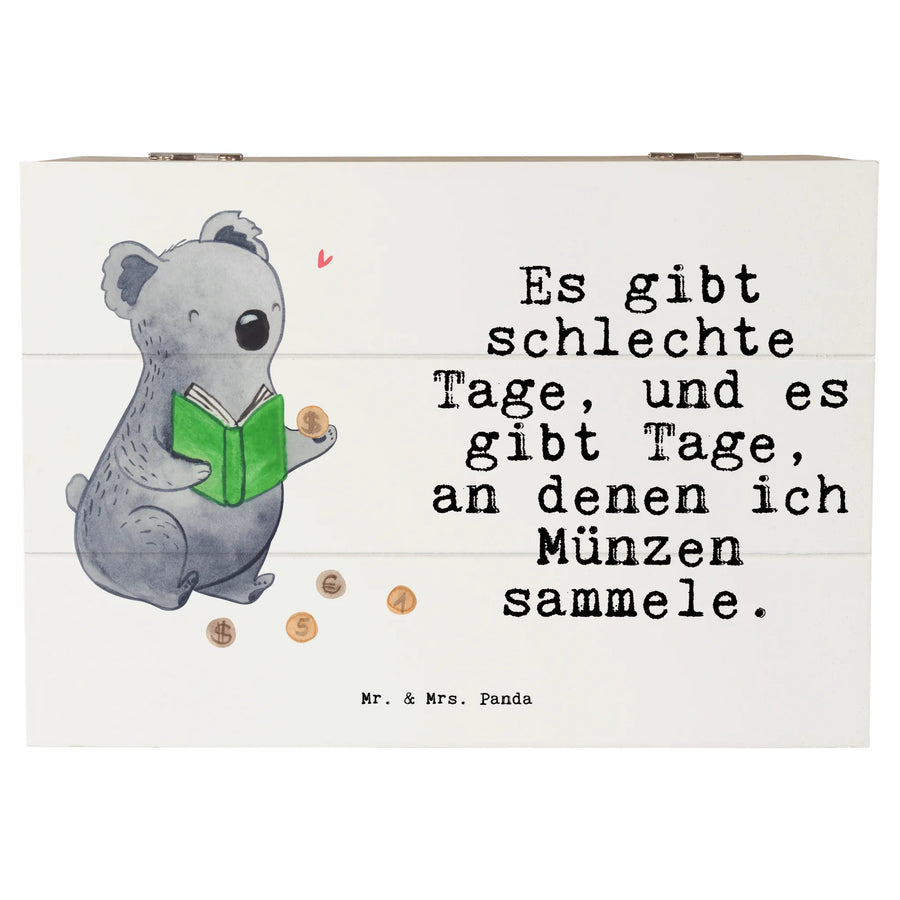 Die Holzkiste von Mr. & Mrs. Panda ist das perfekte Geschenk für alle Münzsammler und Hobby-Liebhaber. Mit ihrem bezaubernden Motiv, einem süßen Koala, der begeistert seine Münzsammlung betrachtet, bringt diese Kiste nicht nur Freude, sondern auch Ordnung in deine Schätze. Der liebevolle Spruch 'Es gibt schlechte Tage, und es gibt Tage, an denen ich Münzen sammele.' erinnert jeden Sammler daran, wie entspannend und befriedigend das Hobby ist.