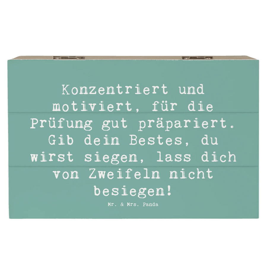 Die wunderschöne Holzkiste von Mr. & Mrs. Panda ist das perfekte Geschenk für alle, die kurz vor wichtigen Prüfungen stehen und einen kleinen Motivationsschub brauchen. Mit dem liebevollen Spruch "Konzentriert und motiviert, für die Prüfung gut präpariert. Gib dein Bestes, du wirst siegen, lass dich von Zweifeln nicht besiegen!" ermutigt diese Erinnerungskiste dazu, die eigenen Träume zu verwirklichen. Egal ob für Schüler, Studenten oder sogar für das eigene Kind – diese spezielle Kiste bietet Platz für Erinnerungen, Fotos oder kleine Schätze, die an die Zeit des Lernens erinnern.
