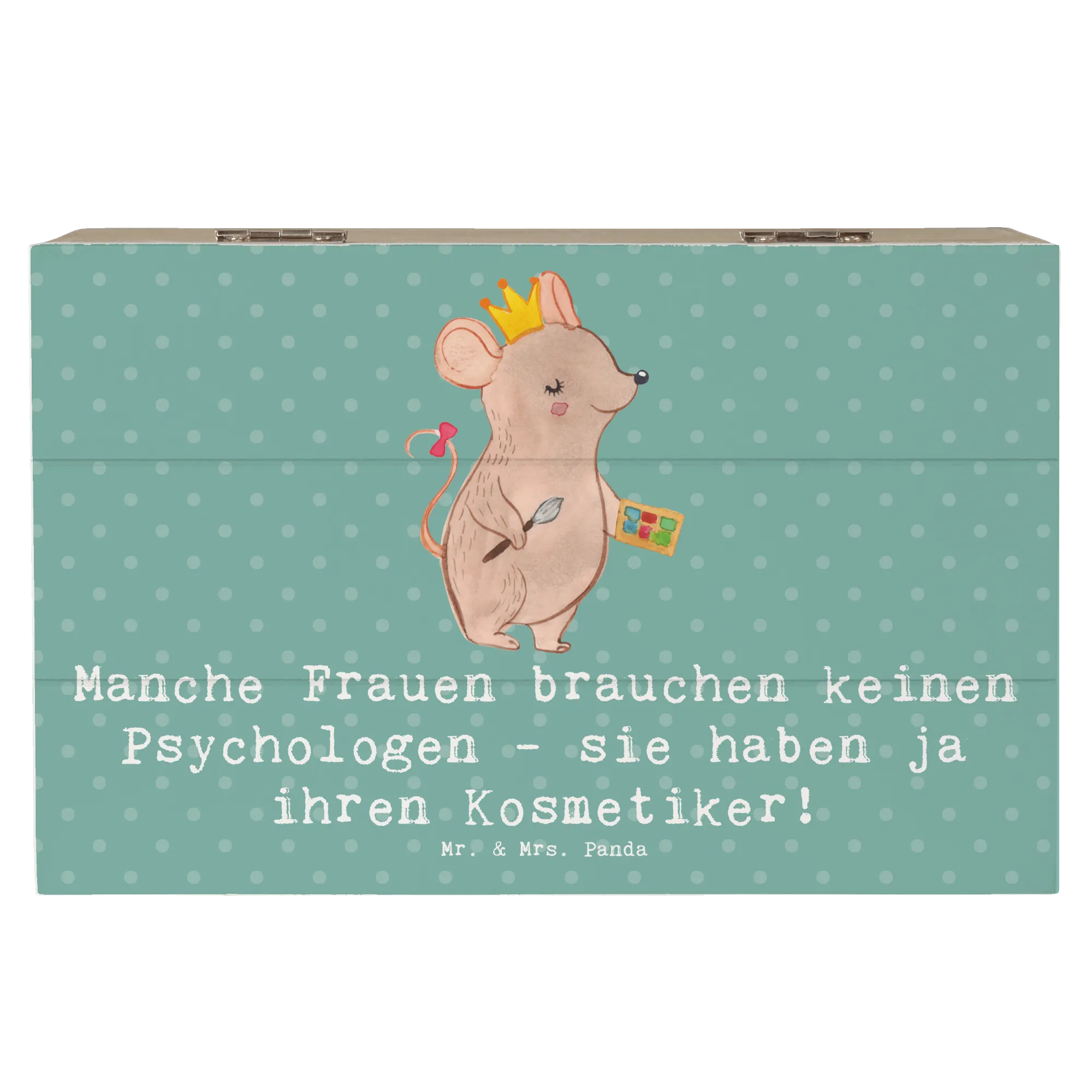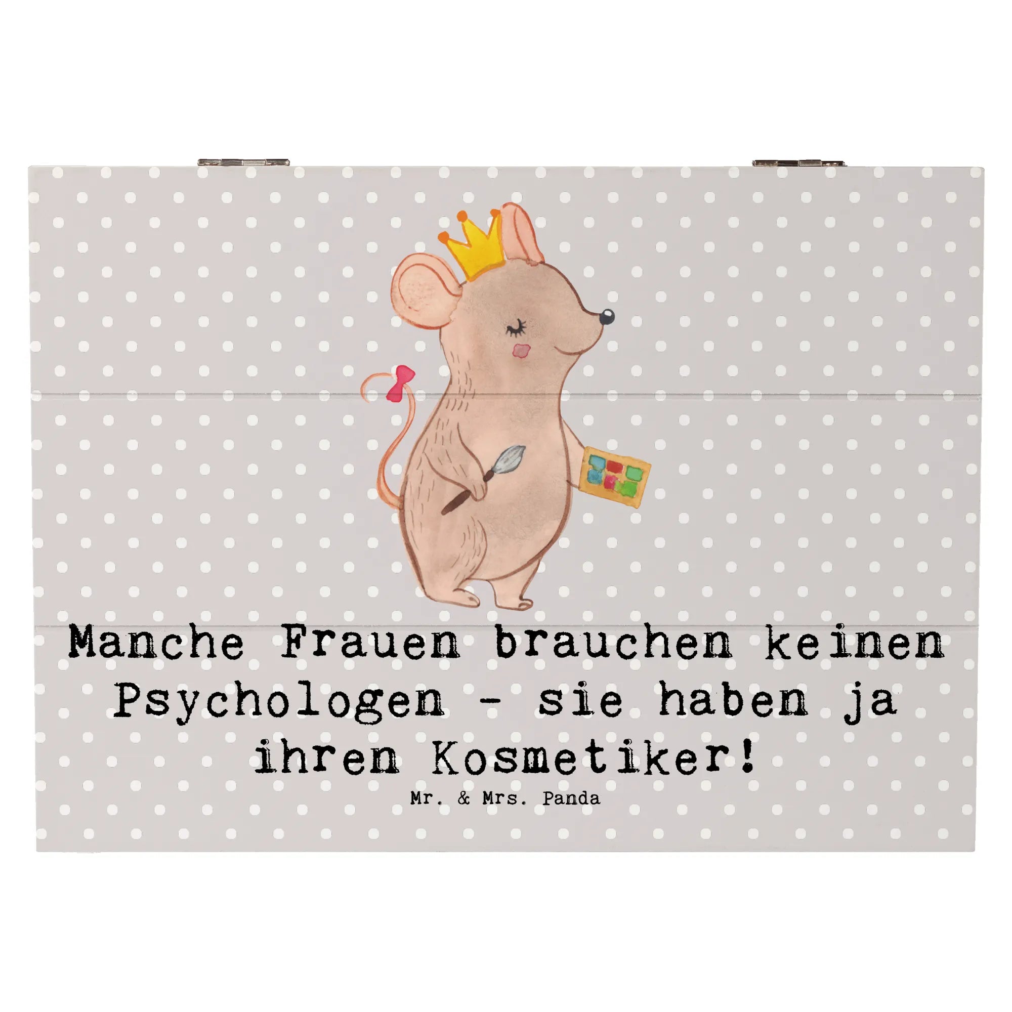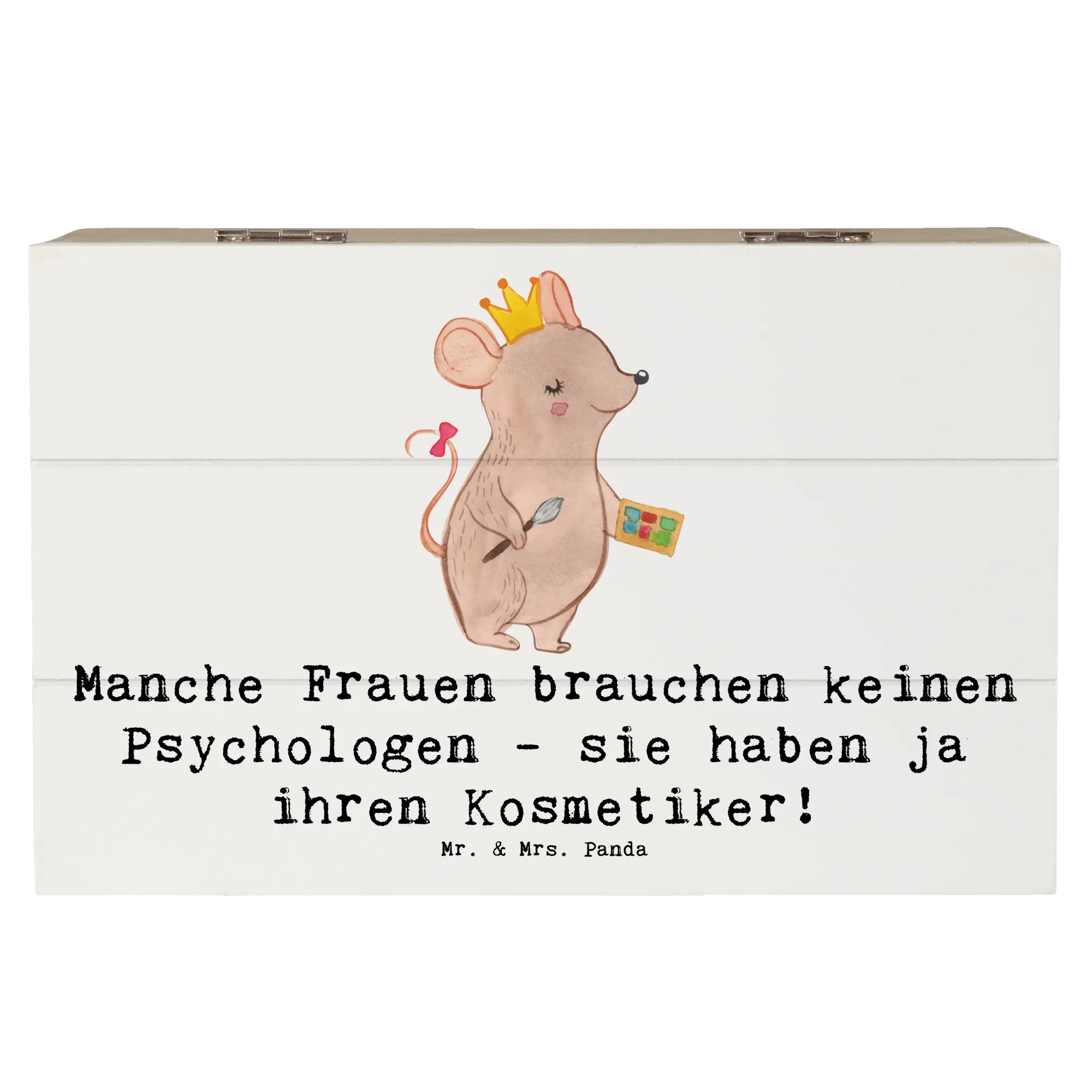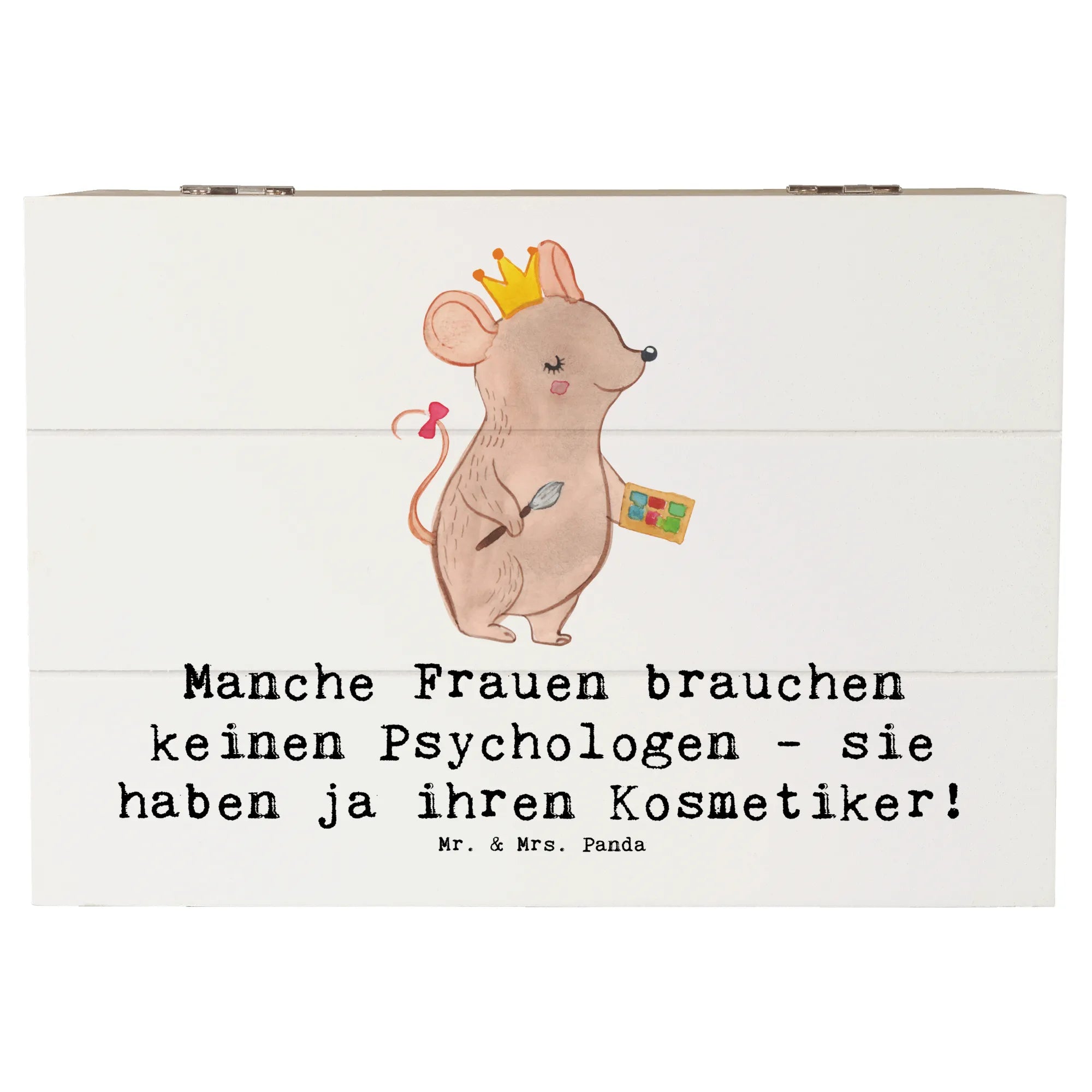 Die wunderschöne Holzkiste von Mr. & Mrs. Panda ist das perfekte Geschenk für jeden Kosmetiker und all jene, die die Schönheit lieben! Mit dem liebevoll designten Motiv 'Manche Frauen brauchen keinen Psychologen - sie haben ja ihren Kosmetiker!' ist diese Kiste nicht nur ein echter Hingucker, sondern auch ein Ausdruck von Wertschätzung für die Kunst der Schönheitspflege.