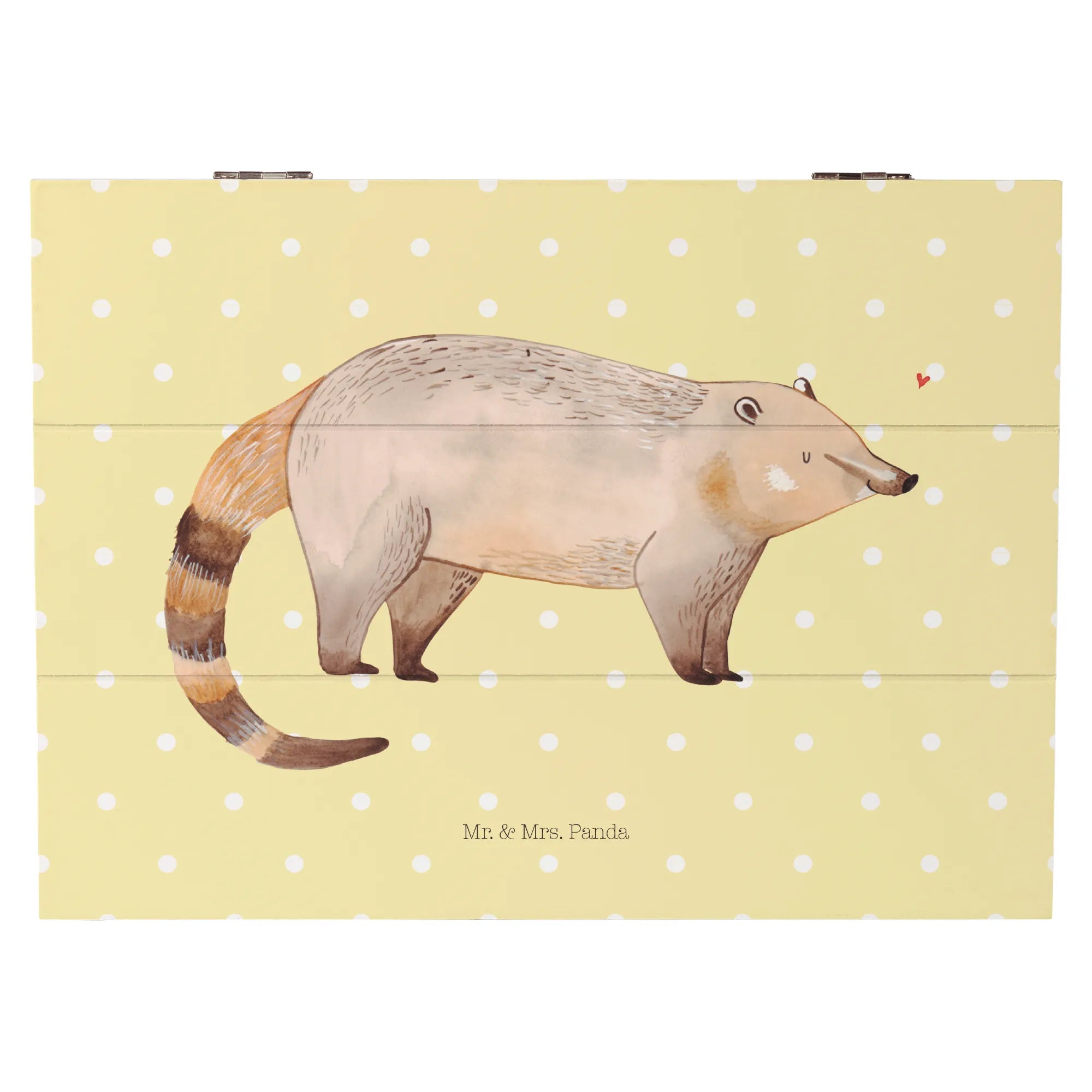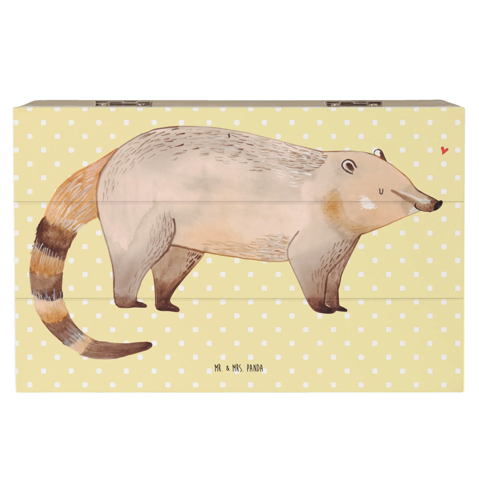 Die wunderschöne Holzkiste von Mr. & Mrs. Panda mit dem liebevollen Nasenbär-Motiv aus der beliebten Kollektion Small World ist der perfekte Aufbewahrungsort für all deine Schätze! In sanften Brauntönen strahlt der Nasenbär Freude und Wärme aus, begleitet von einem süßen Herzen, das über seinem Kopf schwebt.