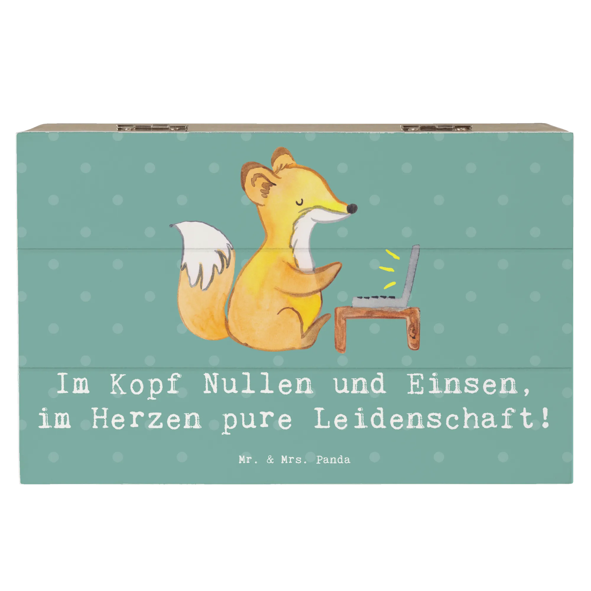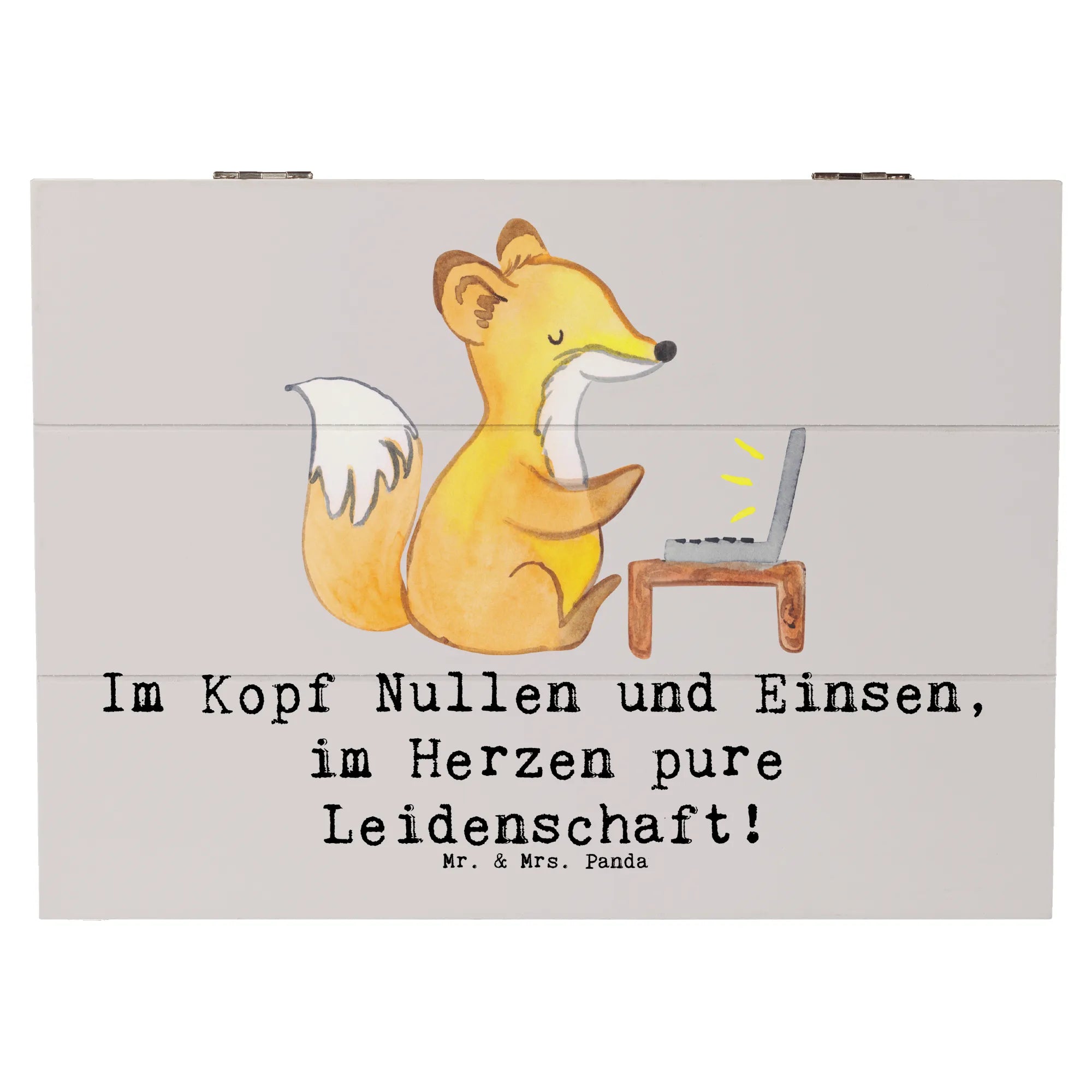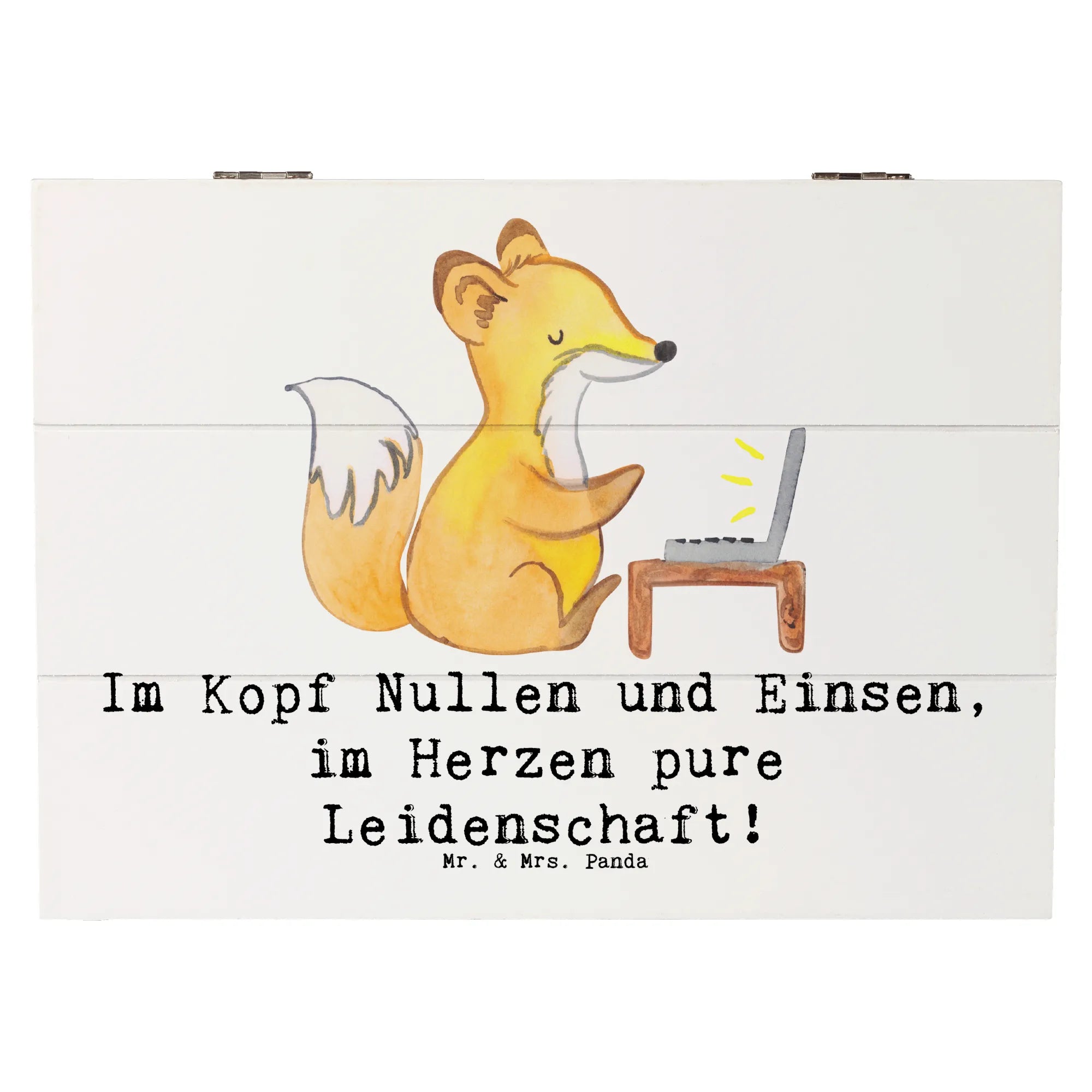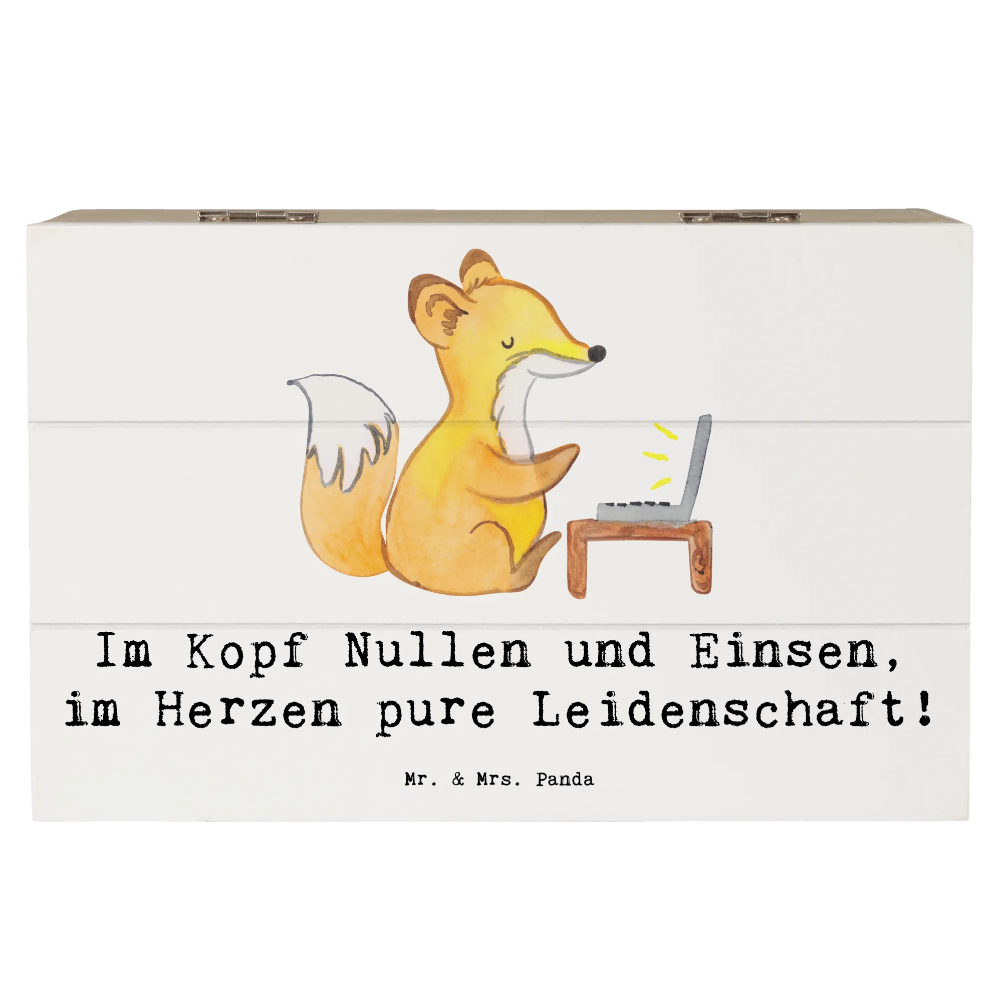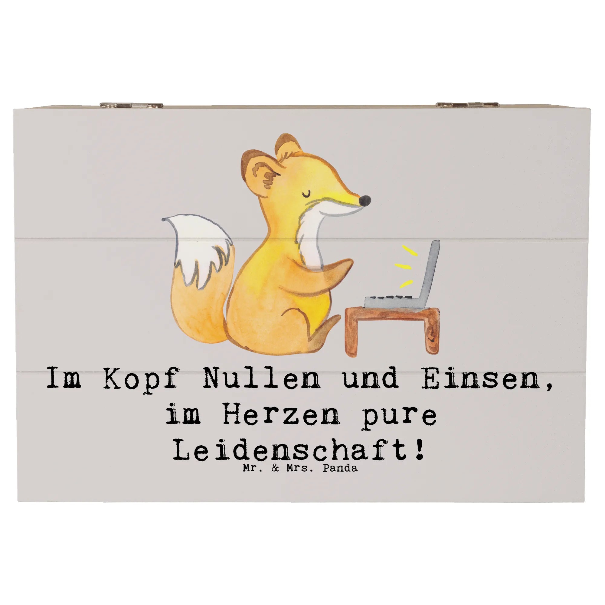 Unsere Holzkiste aus der Berufe-Kollektion von Mr. & Mrs. Panda ist die liebevoll gestaltete Geschenkidee für alle, die in Nullen und Einsen denken und mit Leidenschaft digitale Welten bauen. Das handgezeichnete Aquarellmotiv und der Spruch „Im Kopf Nullen und Einsen, im Herzen pure Leidenschaft!” machen die Kiste zu einer persönlichen Erinnerungskiste und stilvollen Aufbewahrungsbox.