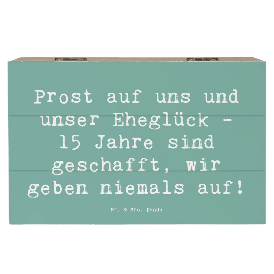 Entdecke die perfekte Holzkiste von Mr. & Mrs. Panda für den 15. Hochzeitstag! Diese zauberhafte Erinnerungskiste, bedruckt mit dem liebevollen Spruch 'Prost auf uns und unser Eheglück - 15 Jahre sind geschafft, wir geben niemals auf!', ist das ideale Geschenk für jedes Brautpaar, das seine Liebe feiern möchte.