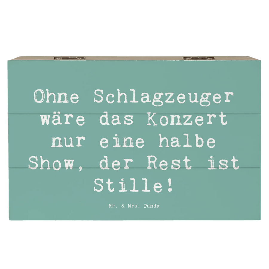 Die wunderschöne Holzkiste von Mr. & Mrs. Panda ist das perfekte Geschenk für jeden Musikliebhaber. Bedruckt mit dem kraftvollen Motiv eines Schlagzeugs und dem Spruch "Ohne Schlagzeuger wäre das Konzert nur eine halbe Show, der Rest ist Stille!" bietet diese Kiste nicht nur eine praktische Aufbewahrungsmöglichkeit, sondern auch eine stilvolle Dekoration für jedes Zuhause.