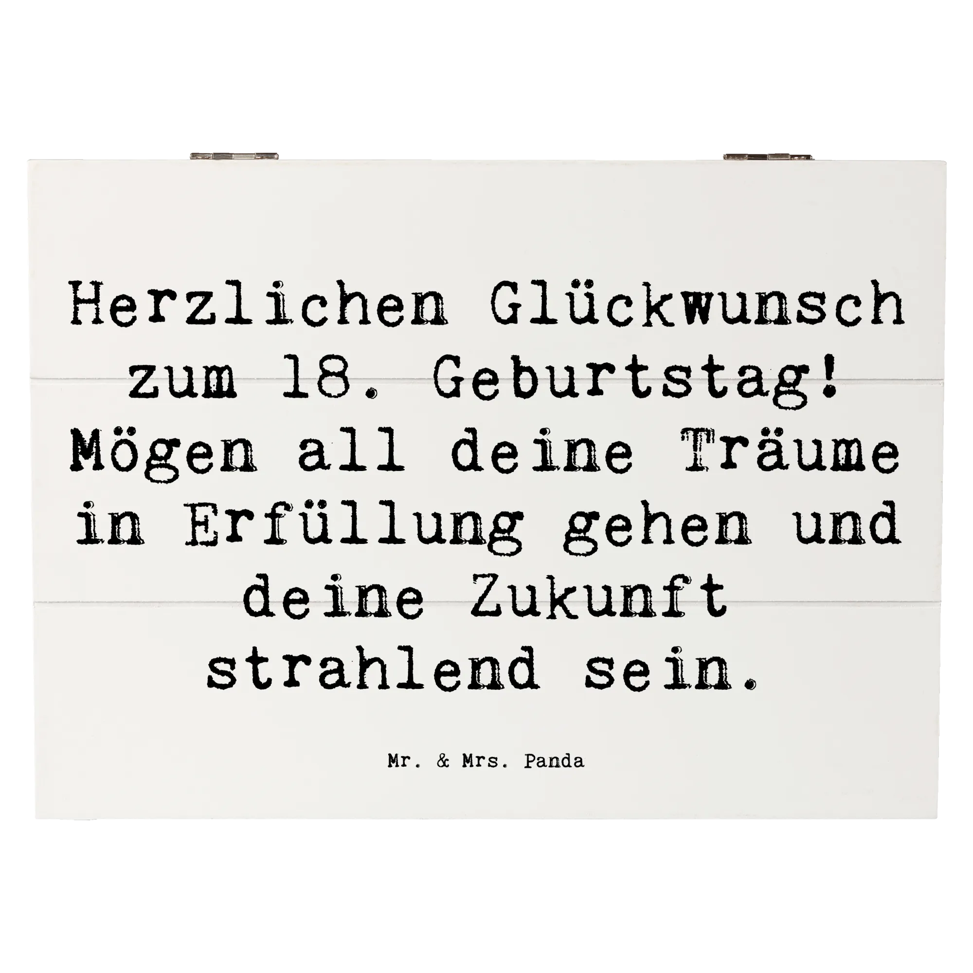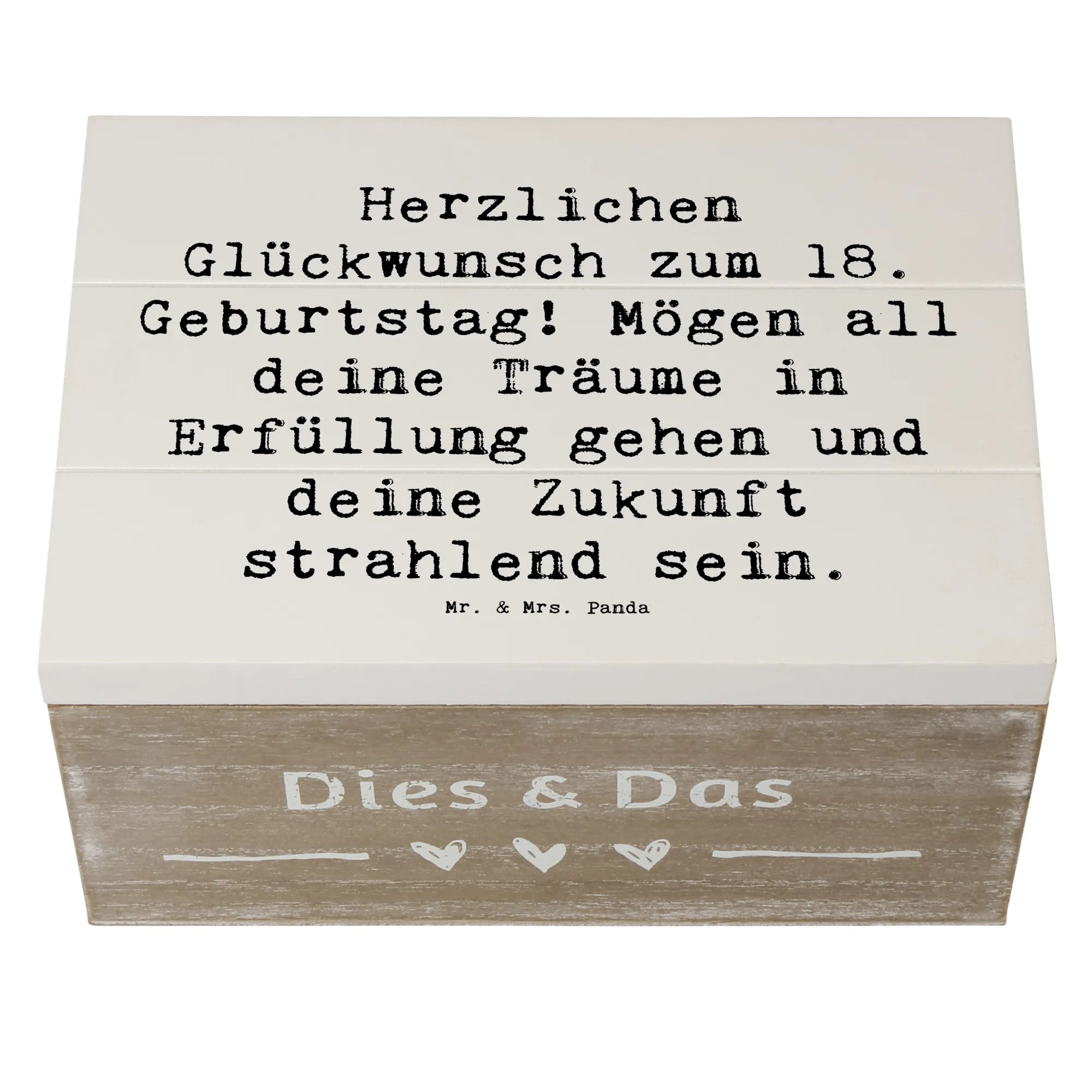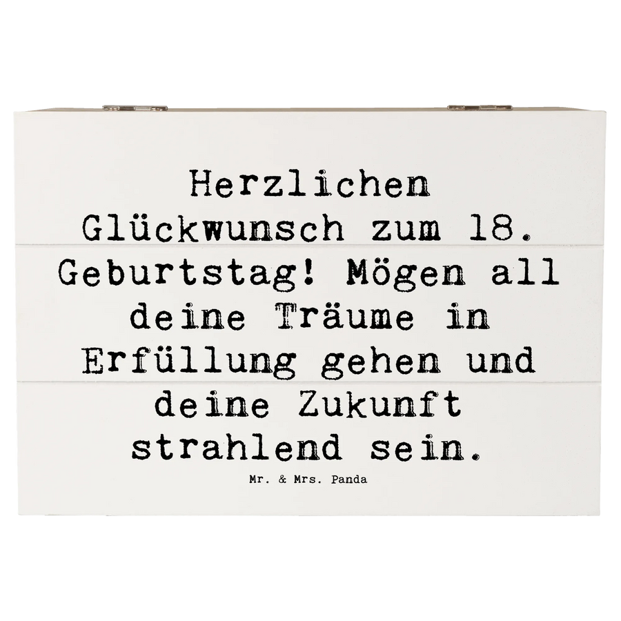 Die wunderschöne Holzkiste von Mr. & Mrs. Panda ist das perfekte Geschenk zum 18. Geburtstag! Mit dem liebevoll handgezeichneten Motiv und dem herzlichen Slogan "Herzlichen Glückwunsch zum 18. Geburtstag! Mögen all deine Träume in Erfüllung gehen und deine Zukunft strahlend sein." verkörpert diese Erinnerungskiste alles, was diesen besonderen Tag ausmacht. Egal, ob du sie als Aufbewahrungsort für Schätze, Erinnerungen oder als einzigartige Geschenkbox nutzt, diese Kiste wird für immer in Erinnerung bleiben.