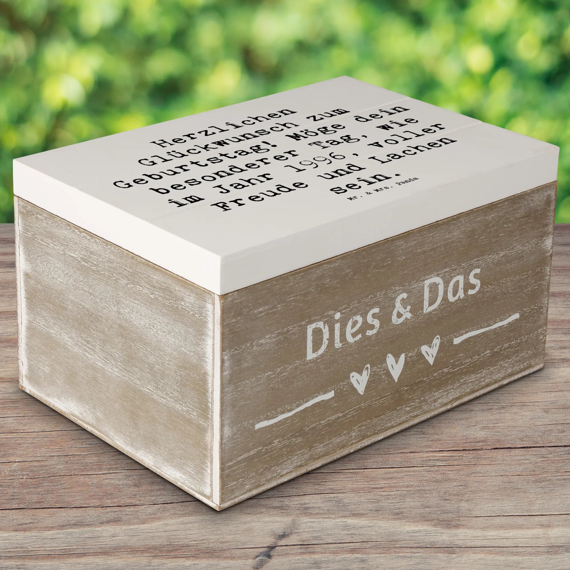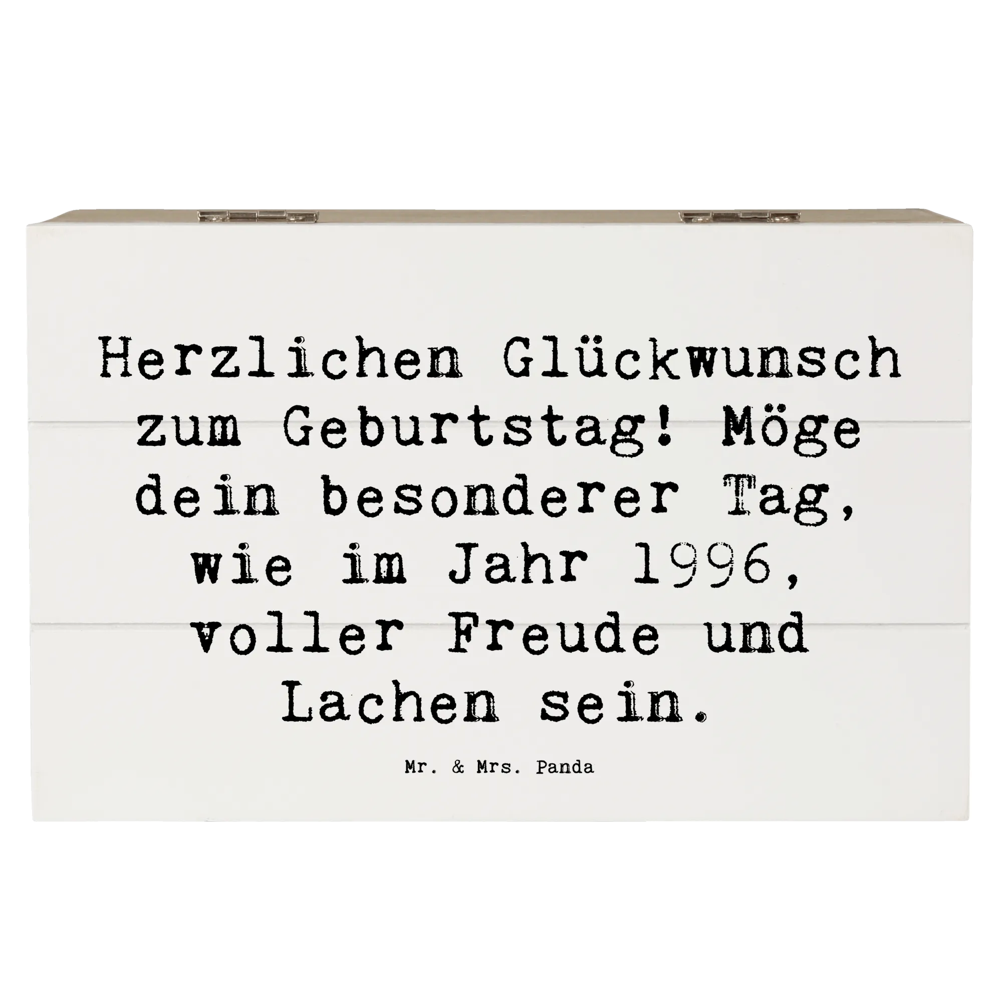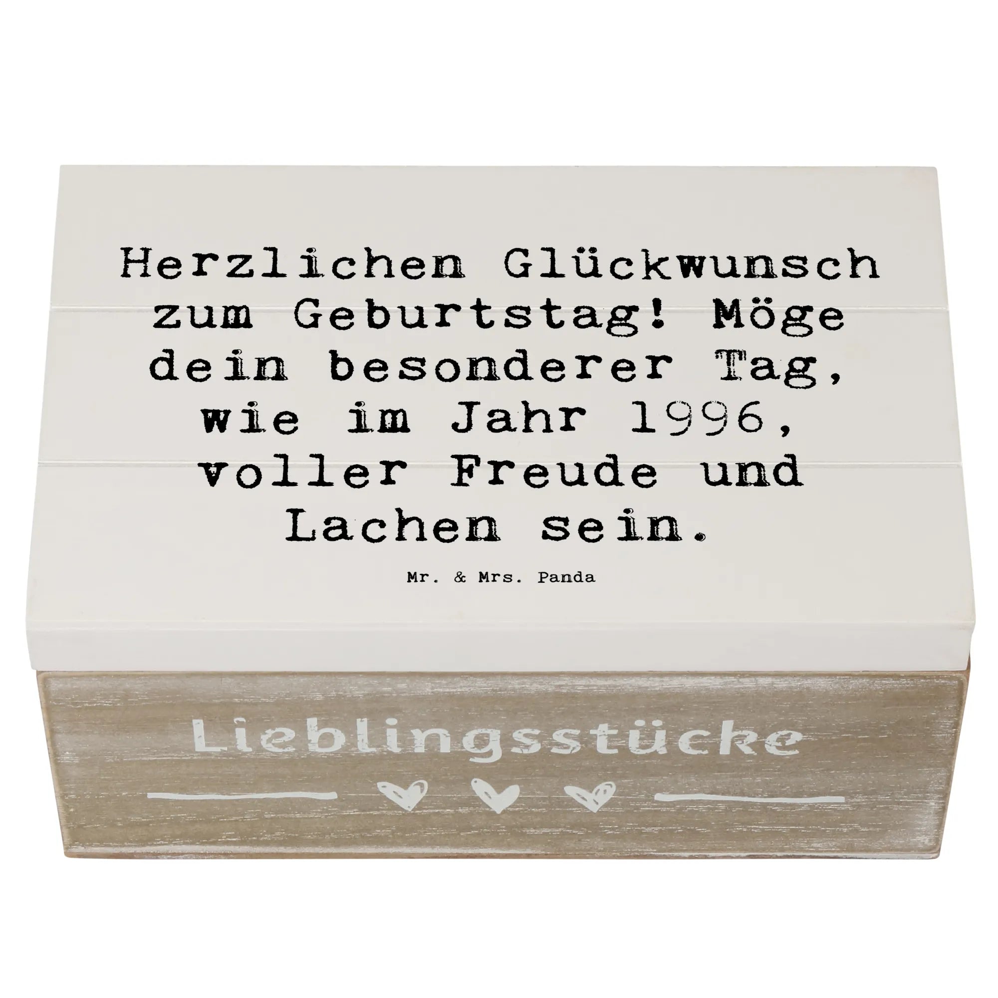 Bist du auf der Suche nach einem ganz besonderen Geschenk für einen lieben Menschen, der 1996 geboren wurde? Unsere zauberhafte Holzkiste von Mr. & Mrs. Panda ist genau das Richtige!