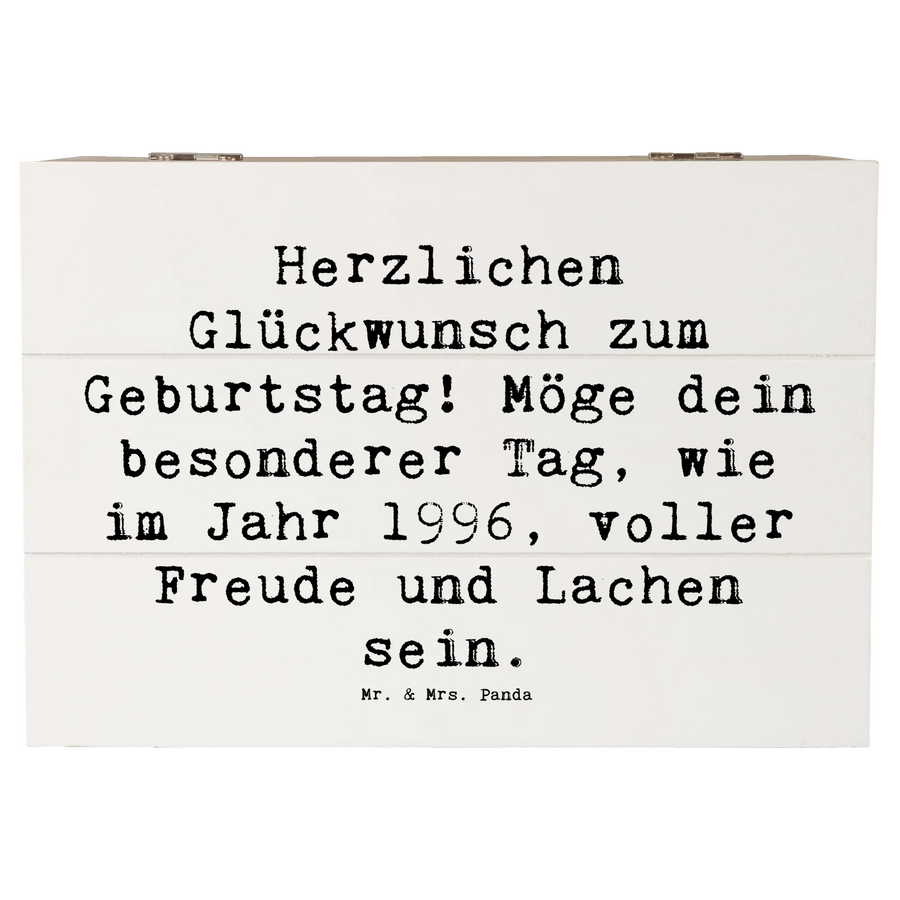 Entdecke die zauberhafte Holzkiste von Mr. & Mrs. Panda, die perfekt für Geburtstagsjubiläen ist! Diese schöne Holzkiste mit dem Motiv "1996 Geburtstag" ist nicht nur ein praktischer Aufbewahrungsort für all die kleinen Schätze und Erinnerungen deines Lebens, sondern auch ein wunderbares Geschenk für jeden, der in diesem besonderen Jahr das Licht der Welt erblickt hat.