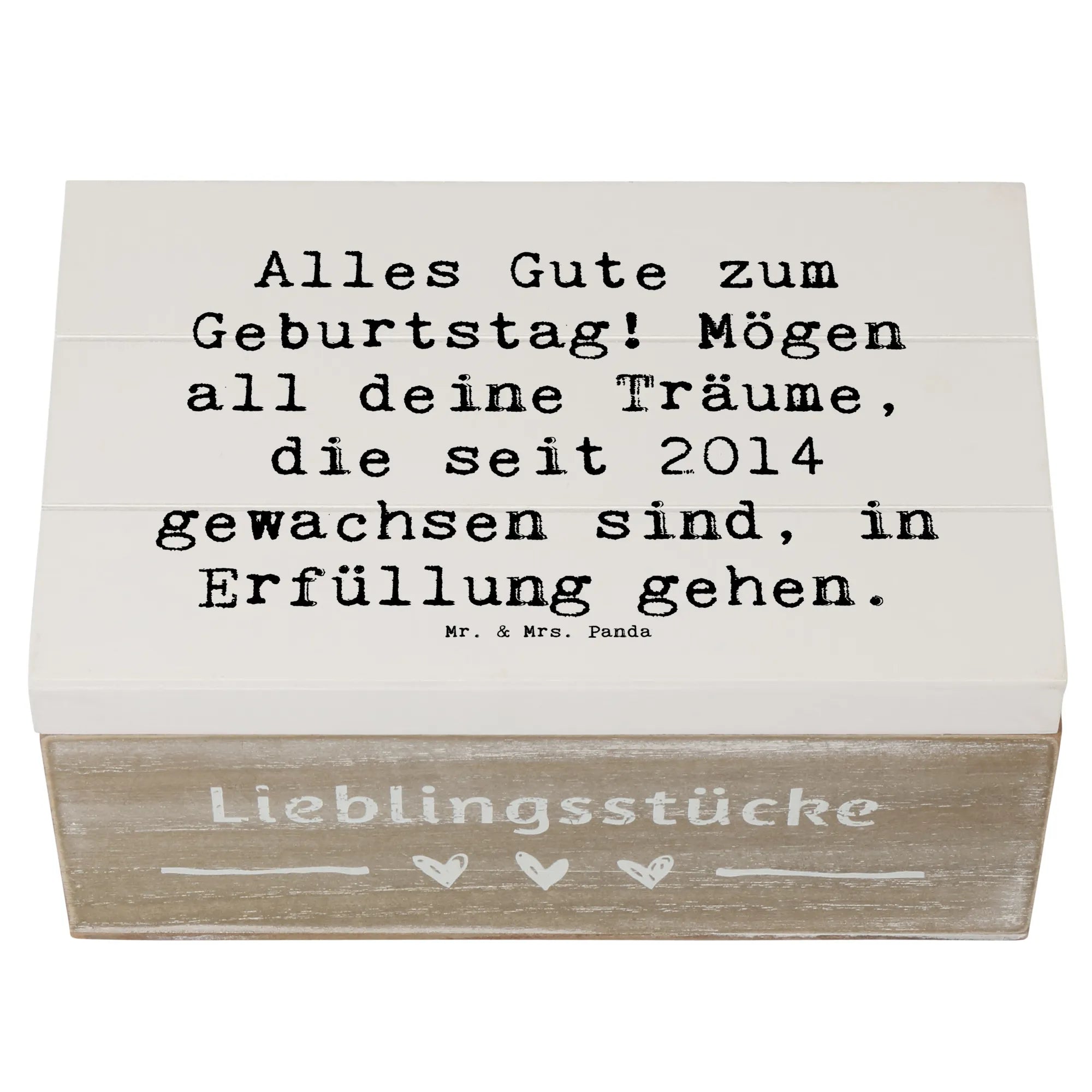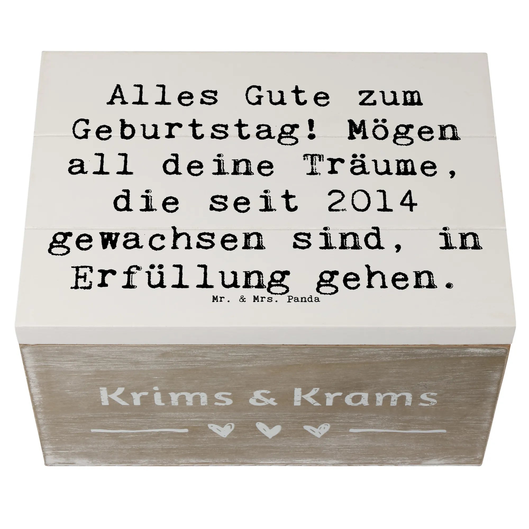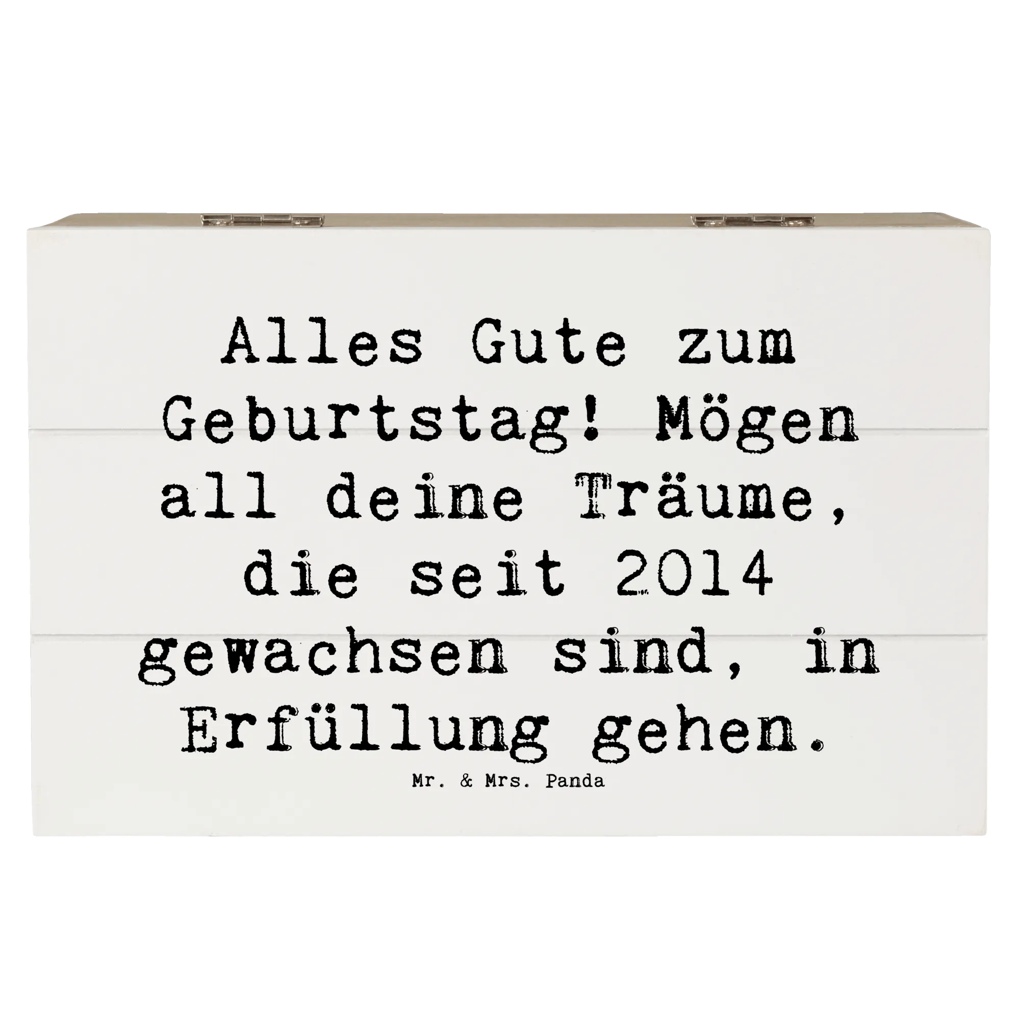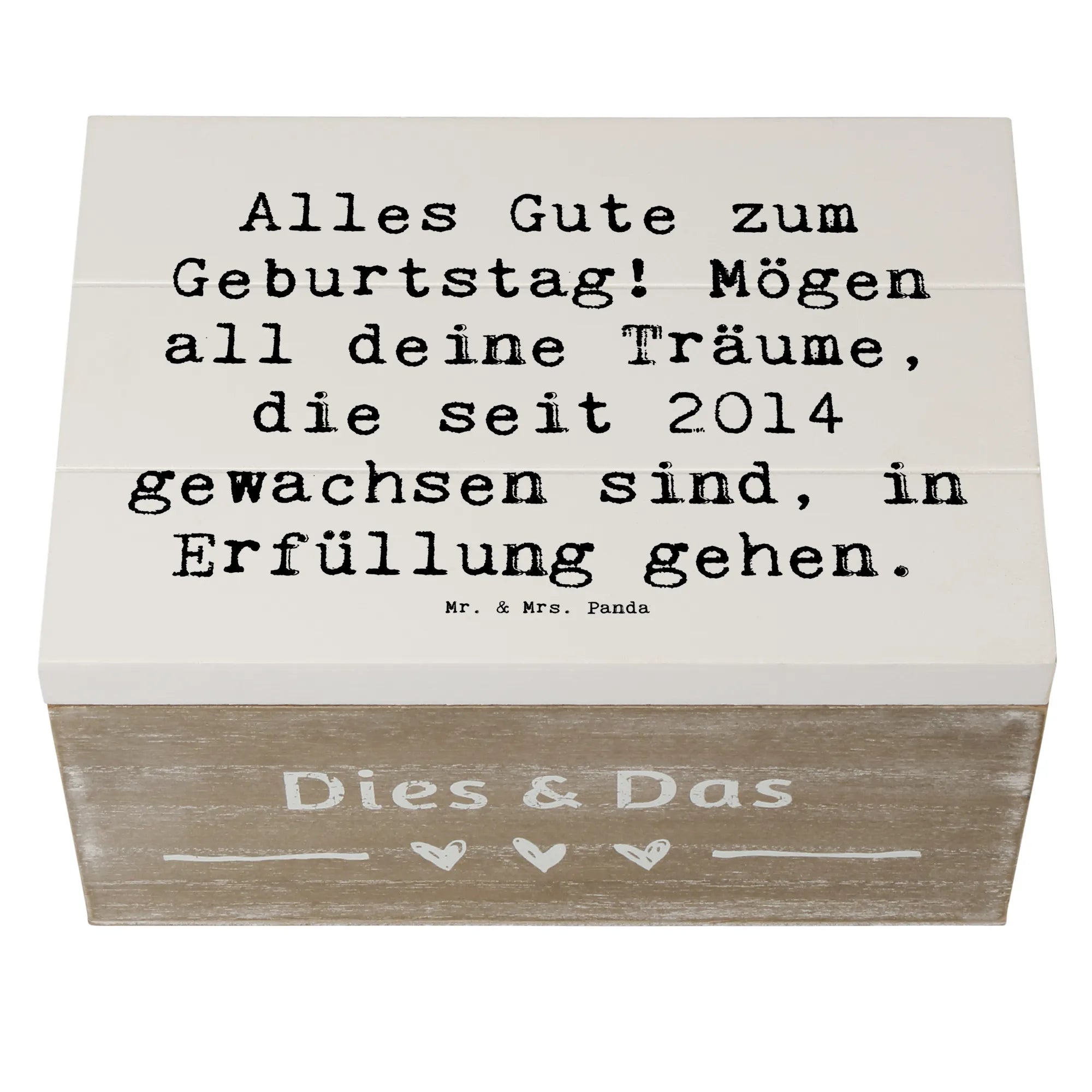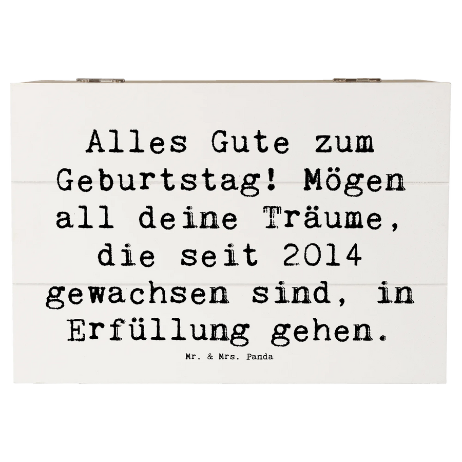 Diese wunderschöne Holzkiste von Mr. & Mrs. Panda ist das perfekte Geschenk für jeden, der 2014 geboren wurde oder einen besonderen Geburtstag feiern möchte! Mit einem liebevollen Spruch - "Alles Gute zum Geburtstag! Mögen all deine Träume, die seit 2014 gewachsen sind, in Erfüllung gehen." - wird diese Kiste zu einem einzigartigen Erinnerungsstück.