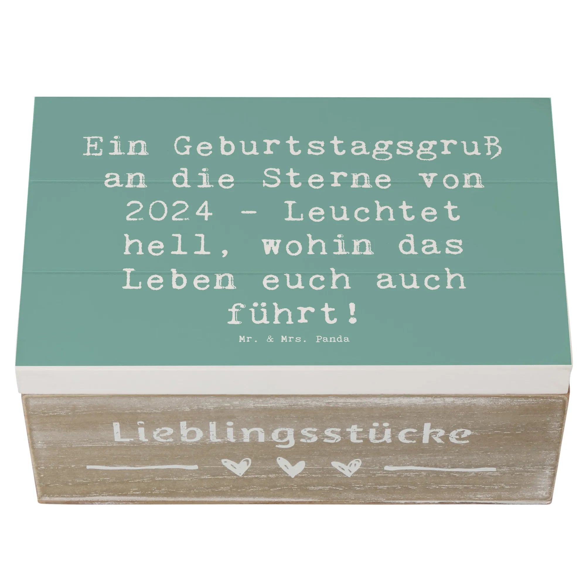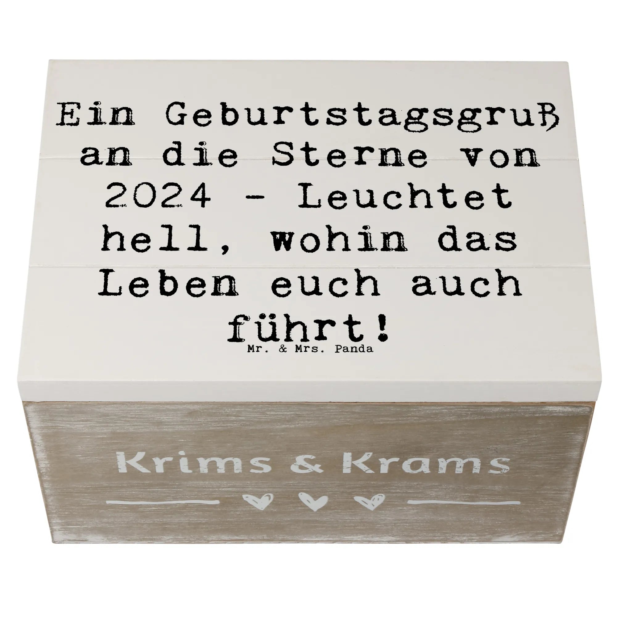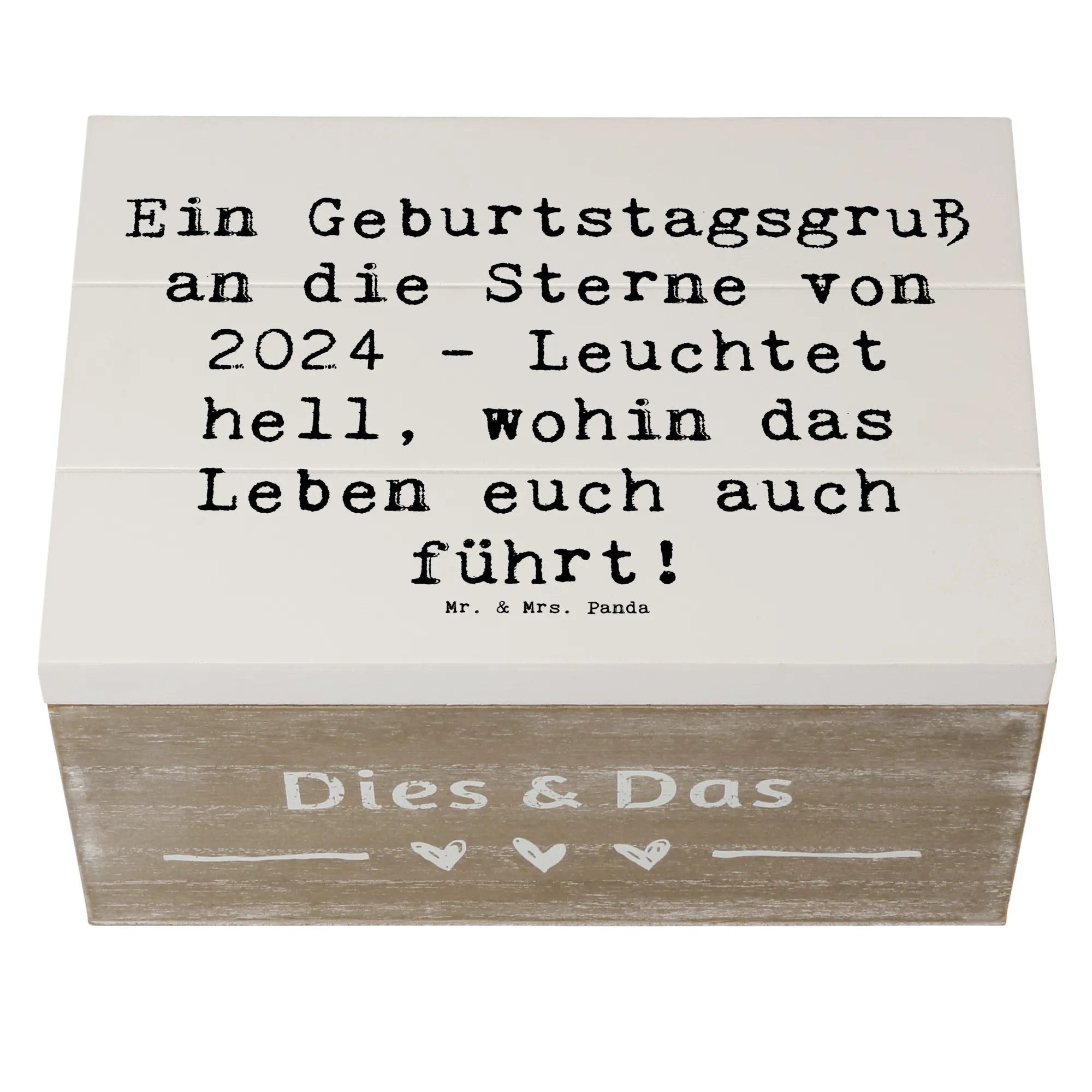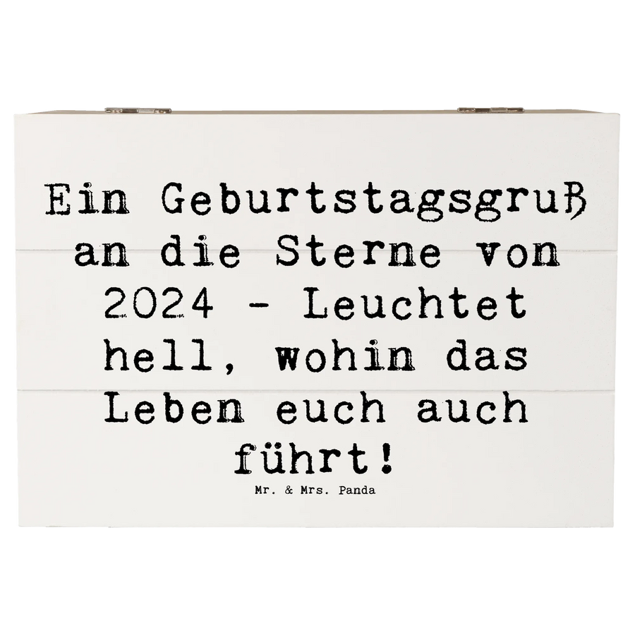 Die Holzkiste von Mr. & Mrs. Panda ist das perfekte Geschenk für jeden Geburtstag im Jahr 2024! Mit ihrem liebevollen Design und dem Spruch 'Ein Geburtstagsgruß an die Sterne von 2024 - Leuchtet hell, wohin das Leben euch auch führt!' bringt diese Kiste Freude und gute Wünsche in jedes Zuhause.