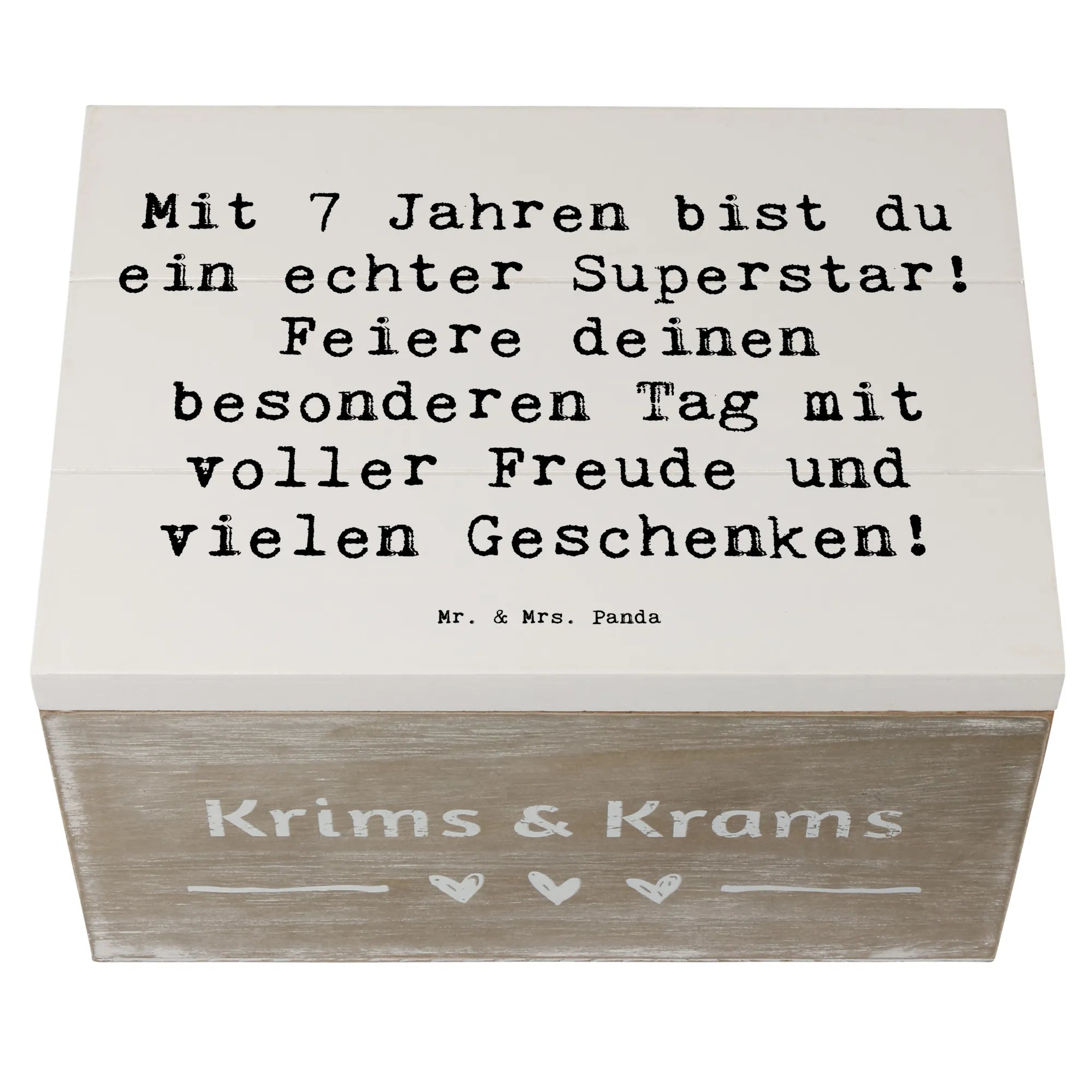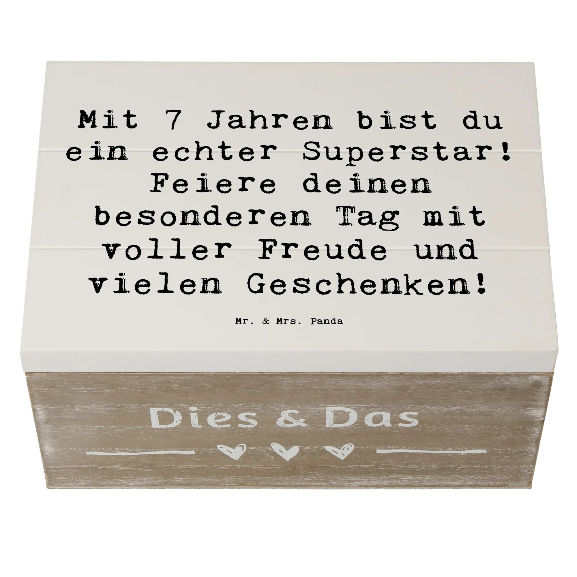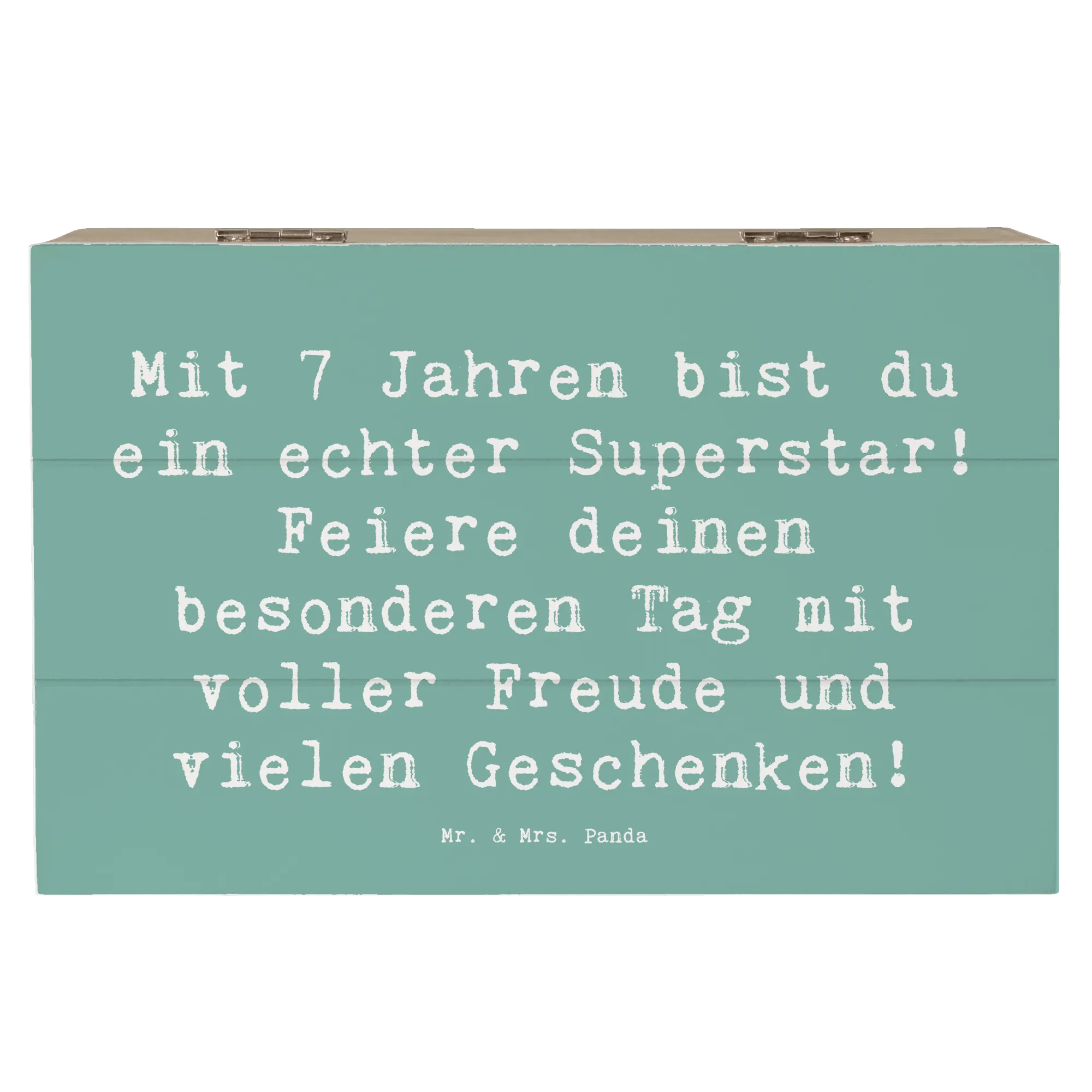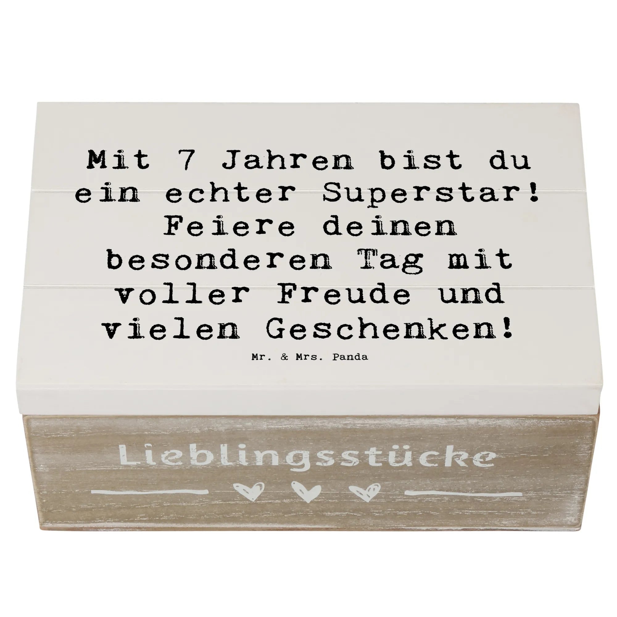 Die wunderschöne Holzkiste von Mr. & Mrs. Panda ist das perfekte Geschenk zum 7. Geburtstag! Mit dem liebevollen Slogan "Mit 7 Jahren bist du ein echter Superstar! Feiere deinen besonderen Tag mit voller Freude und vielen Geschenken!" ist diese Kiste nicht nur ein Stauraum für all die besonderen Schätze, die dein Kind an diesen unvergesslichen Tagen sammelt, sondern auch eine ganz besondere Erinnerungskiste.