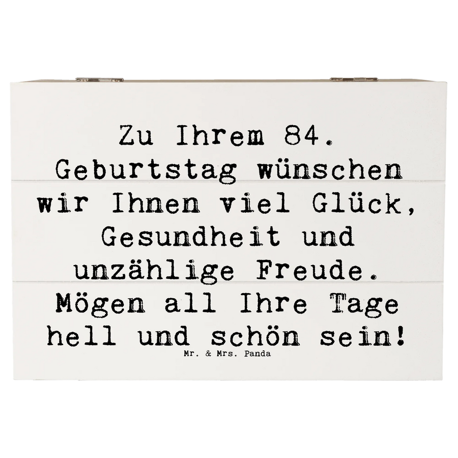 Schenke mit der wundervollen Holzkiste von Mr. & Mrs. Panda ein Stück Glück! Diese einzigartige Schatzkiste ist das perfekte Geschenk zum 84. Geburtstag. Gedruckt mit dem liebevollen Slogan: "Zu Ihrem 84. Geburtstag wünschen wir Ihnen viel Glück, Gesundheit und unzählige Freude. Mögen all Ihre Tage hell und schön sein!" ist sie nicht nur schön, sondern auch ein echter Hingucker.