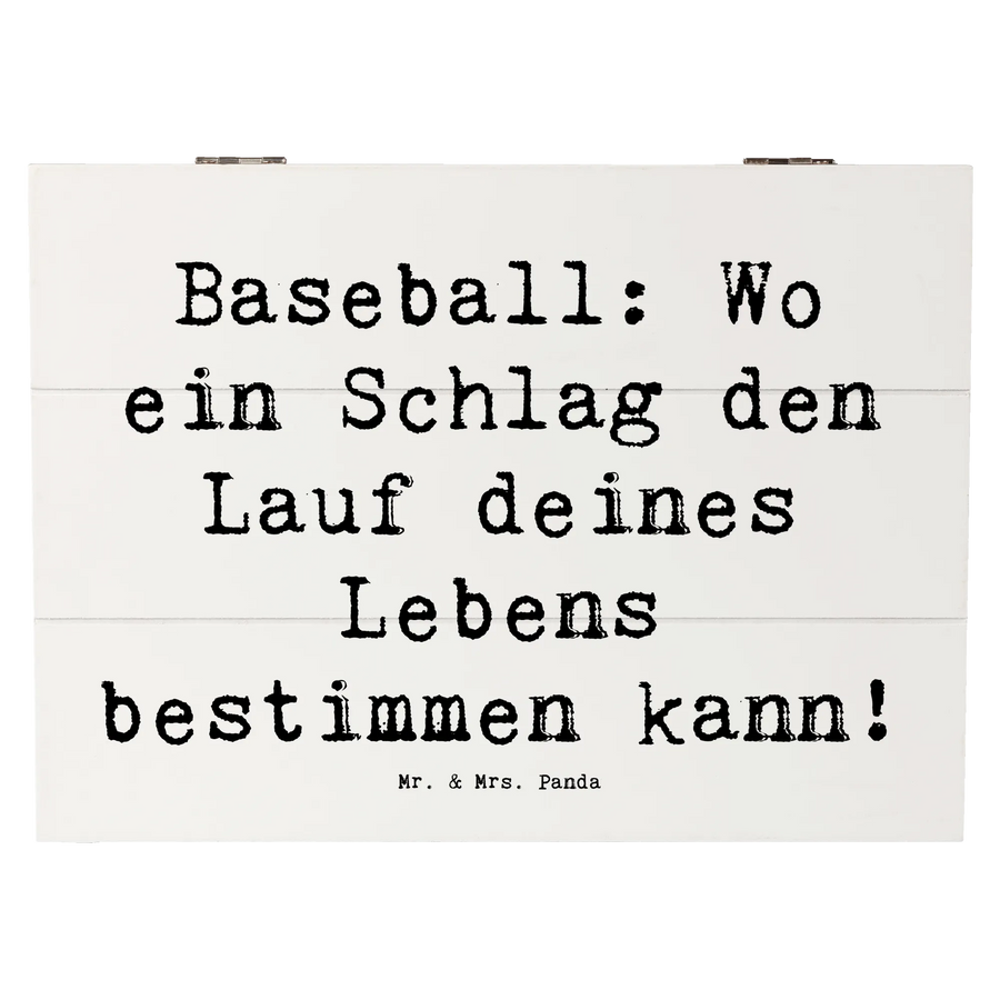 Suchst Du ein persönliches und gleichzeitig praktisches Geschenk für einen Baseball-Spieler oder -Fan? Unsere Holzkiste von Mr. & Mrs. Panda kombiniert Geschenkbox, Schatztruhe und Aufbewahrungsbox in einem. Bedruckt ist sie mit dem inspirierenden Spruch „Baseball: Wo ein Schlag den Lauf deines Lebens bestimmen kann!“ – ideal für Spieler, Trainer und Fans.