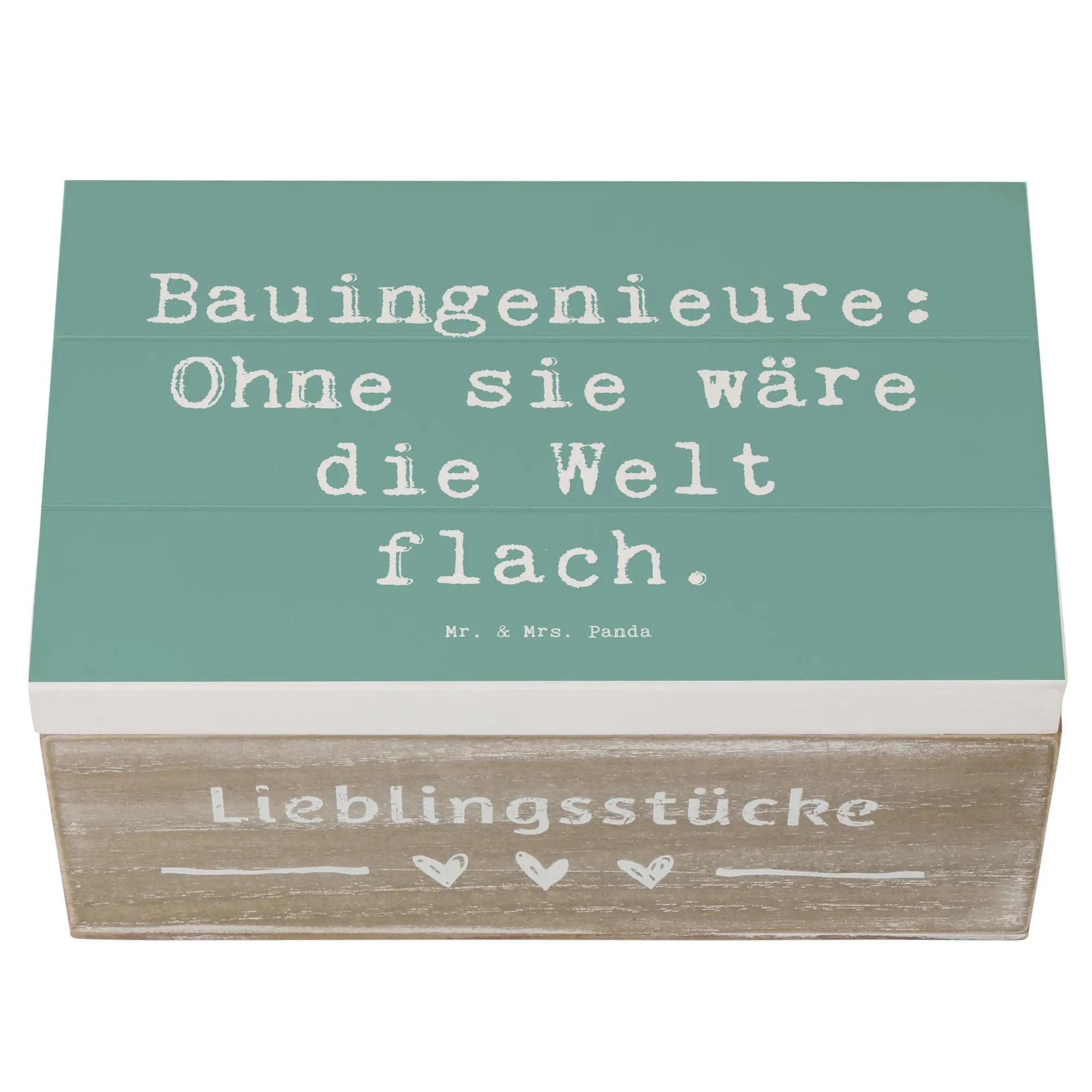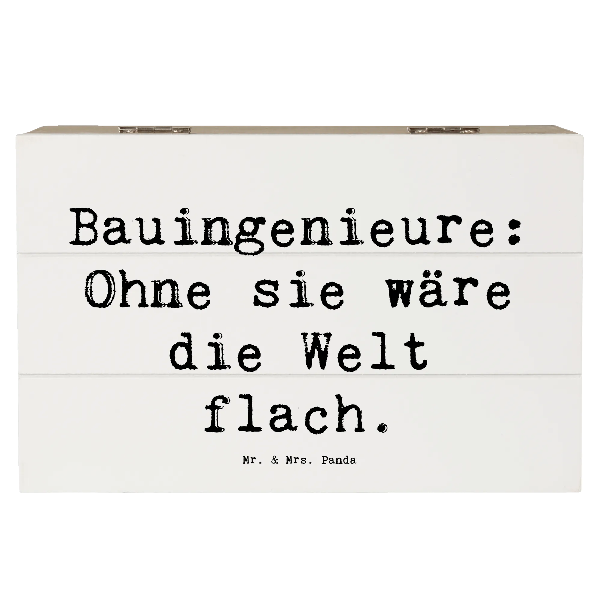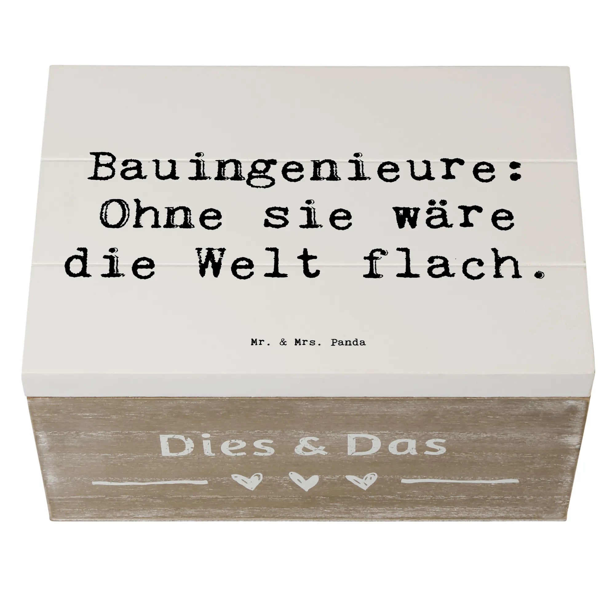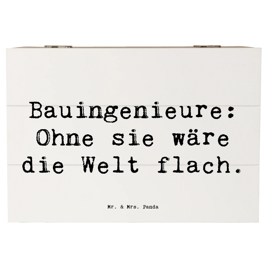 Entdecke die charmante Holzkiste "Bauingenieur" aus der Berufe-Kollektion von Mr. & Mrs. Panda! Diese wunderschöne Kiste ist nicht nur ein Blickfang, sondern auch der perfekte Ort, um all deine wertvollen Erinnerungen, Schätze und wichtigen Dokumente sicher aufzubewahren. Mit einem liebevollen, handgezeichneten Motiv, das den Beruf des Bauingenieurs feiert und dem Spruch "Bauingenieure: Ohne sie wäre die Welt flach.", zaubert sie jedem ein Lächeln ins Gesicht.