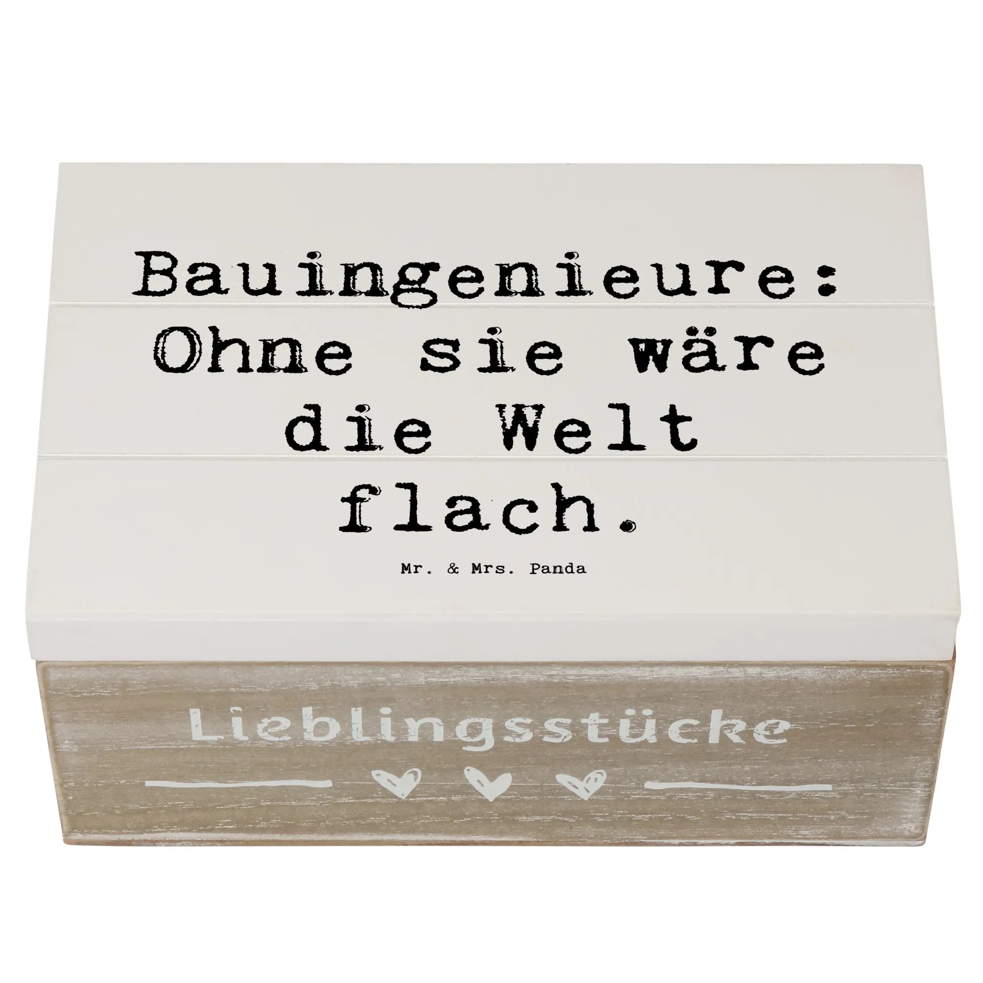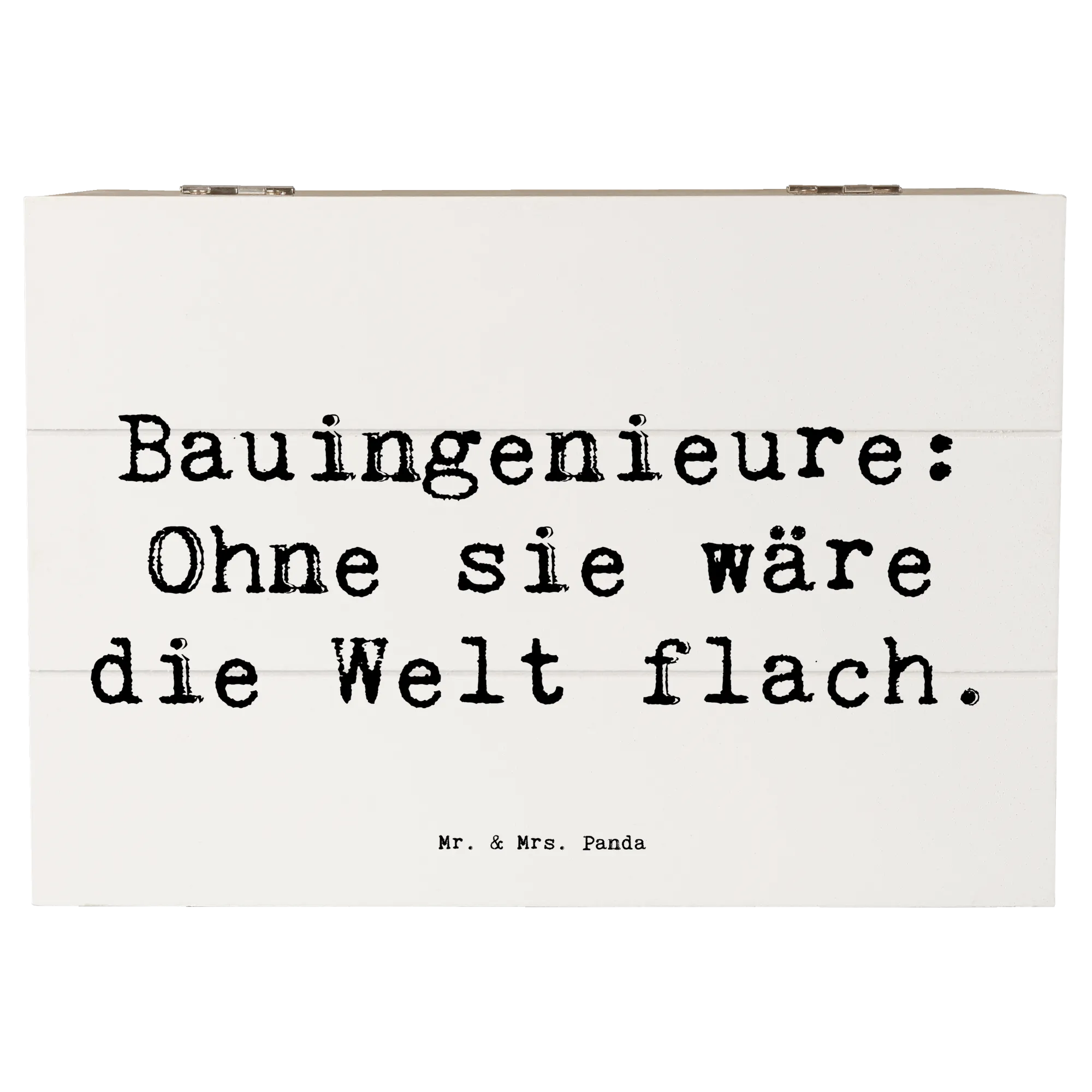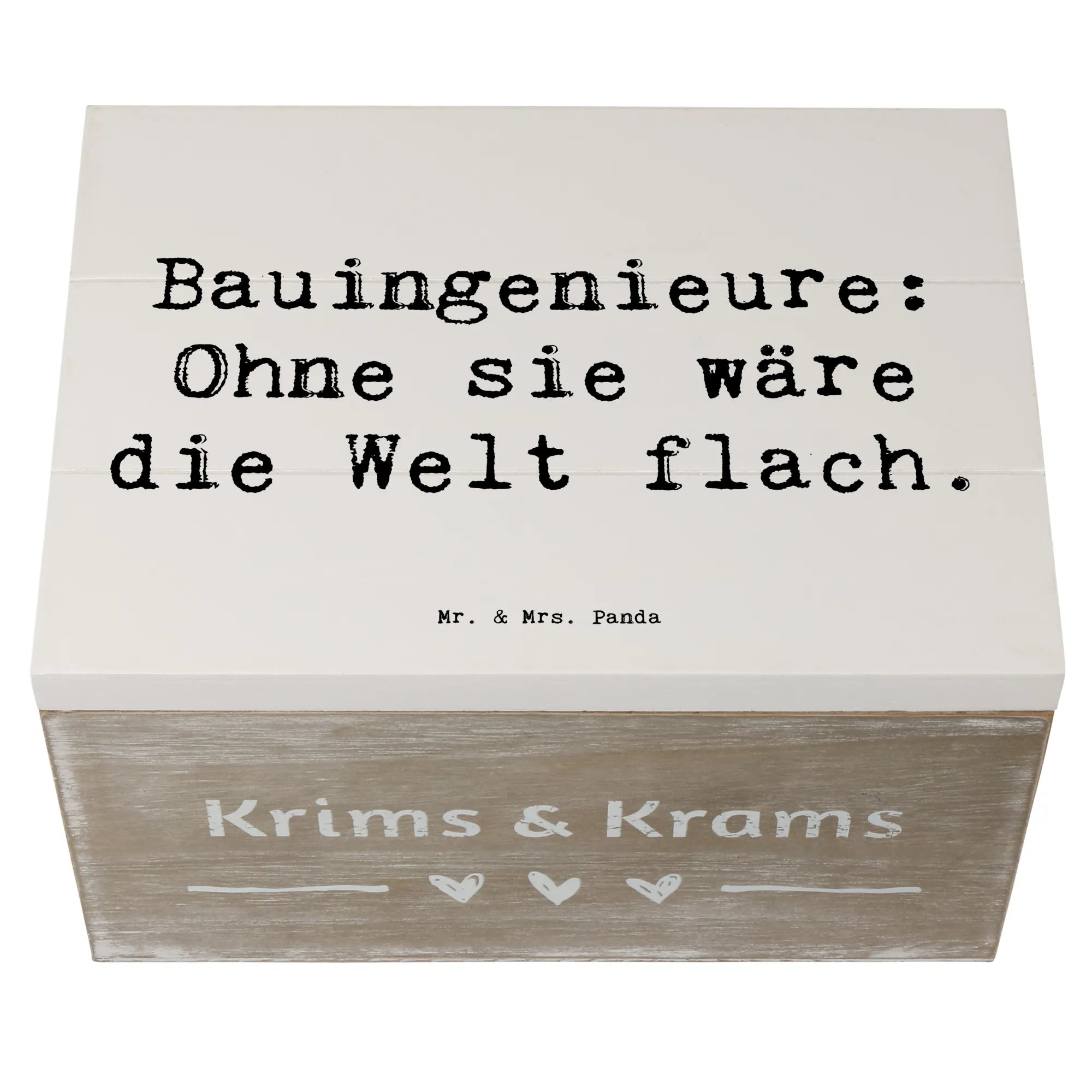 Entdecke die charmante Holzkiste "Bauingenieur" aus der Berufe-Kollektion von Mr. & Mrs. Panda! Diese wunderschöne Kiste ist nicht nur ein Blickfang, sondern auch der perfekte Ort, um all deine wertvollen Erinnerungen, Schätze und wichtigen Dokumente sicher aufzubewahren. Mit einem liebevollen, handgezeichneten Motiv, das den Beruf des Bauingenieurs feiert und dem Spruch "Bauingenieure: Ohne sie wäre die Welt flach.", zaubert sie jedem ein Lächeln ins Gesicht.