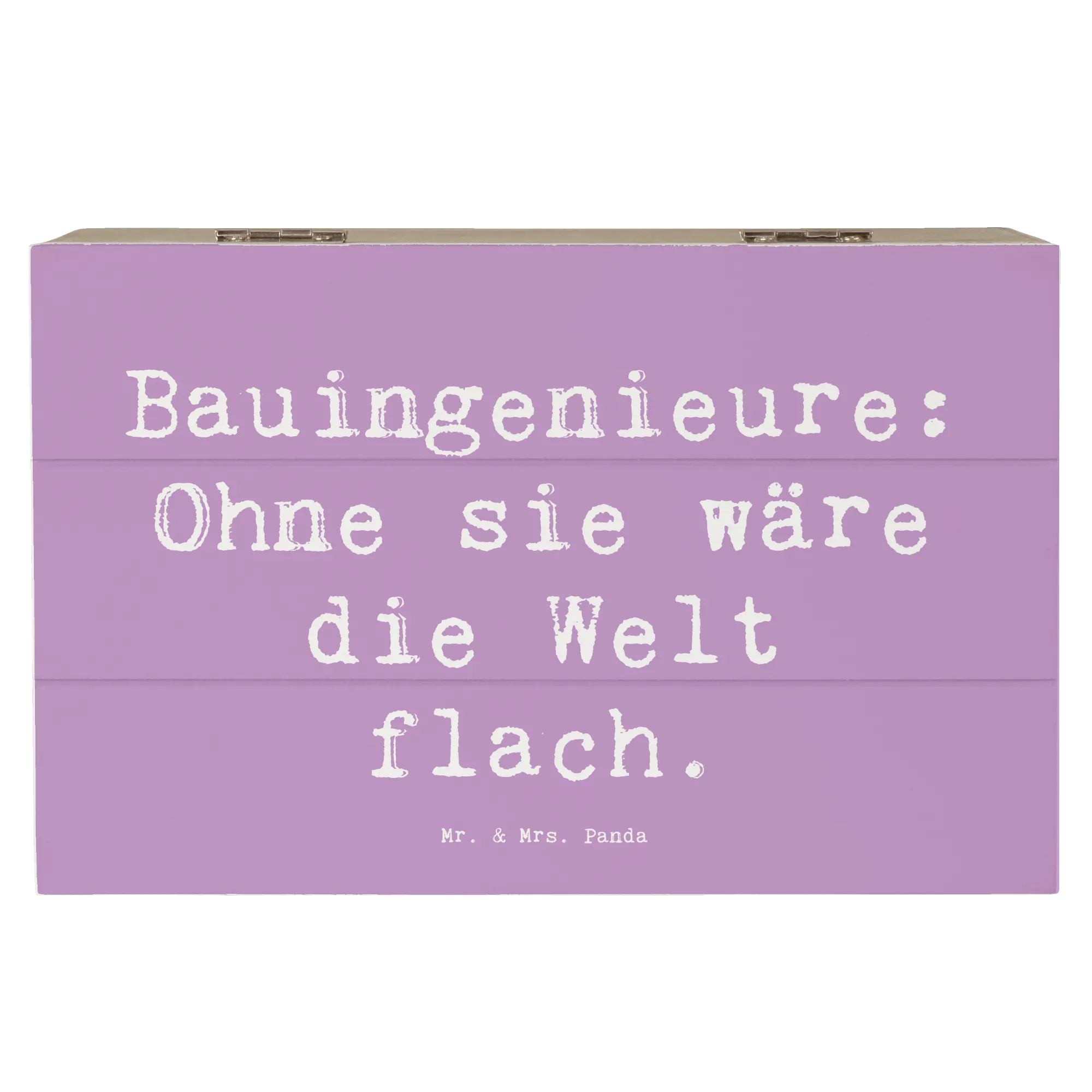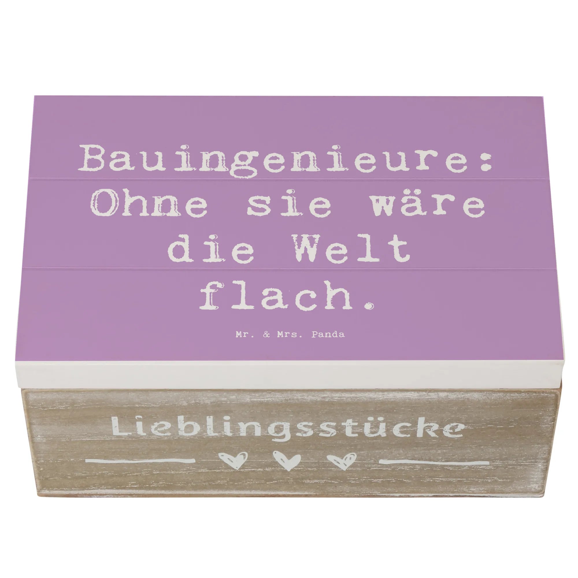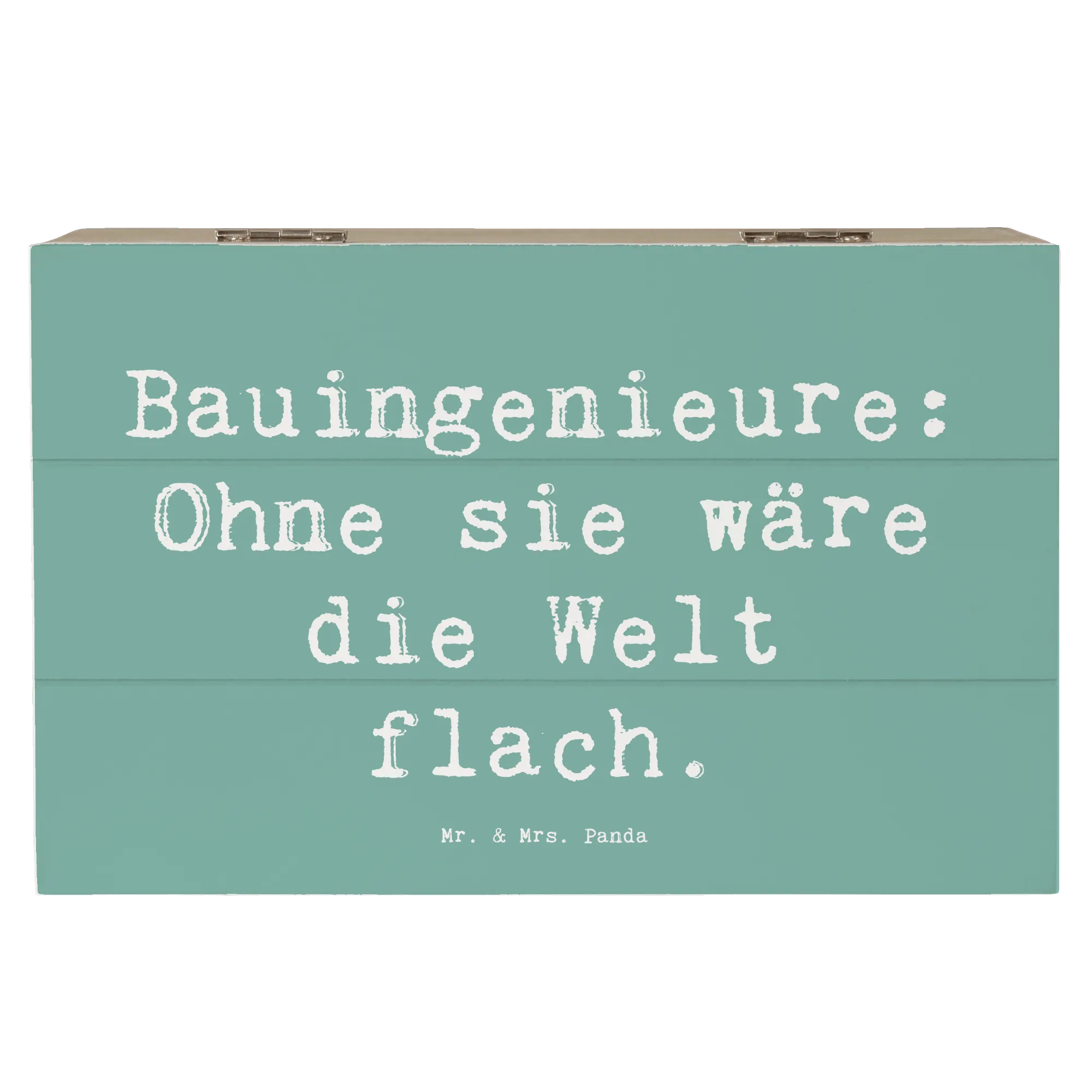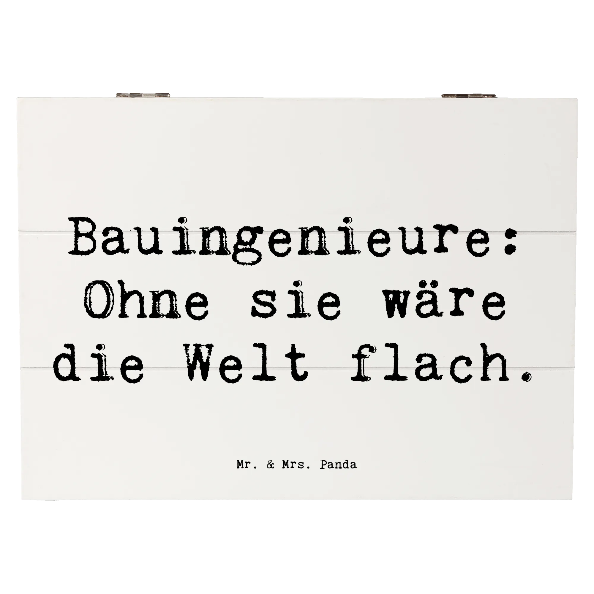 Entdecke die charmante Holzkiste "Bauingenieur" aus der Berufe-Kollektion von Mr. & Mrs. Panda! Diese wunderschöne Kiste ist nicht nur ein Blickfang, sondern auch der perfekte Ort, um all deine wertvollen Erinnerungen, Schätze und wichtigen Dokumente sicher aufzubewahren. Mit einem liebevollen, handgezeichneten Motiv, das den Beruf des Bauingenieurs feiert und dem Spruch "Bauingenieure: Ohne sie wäre die Welt flach.", zaubert sie jedem ein Lächeln ins Gesicht.