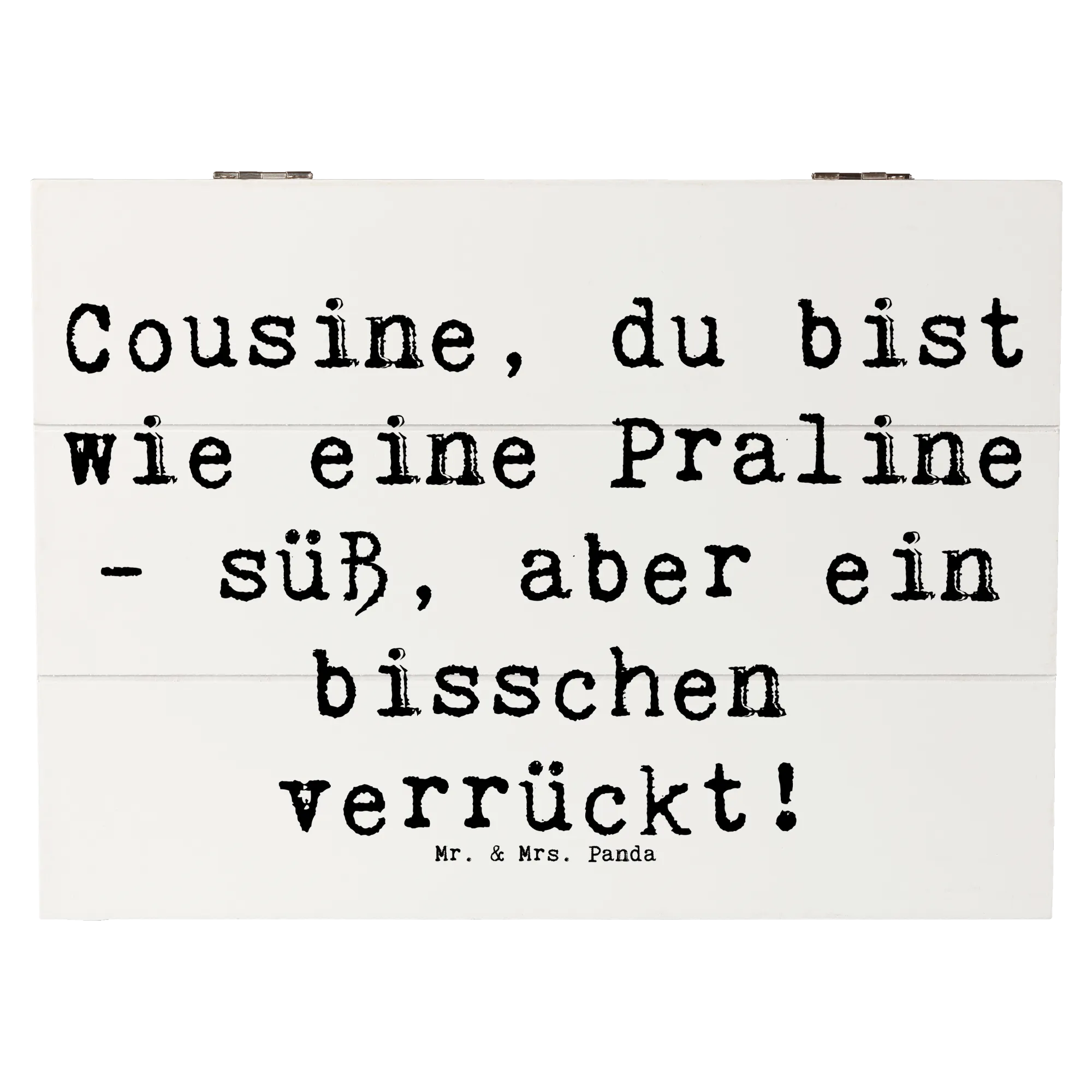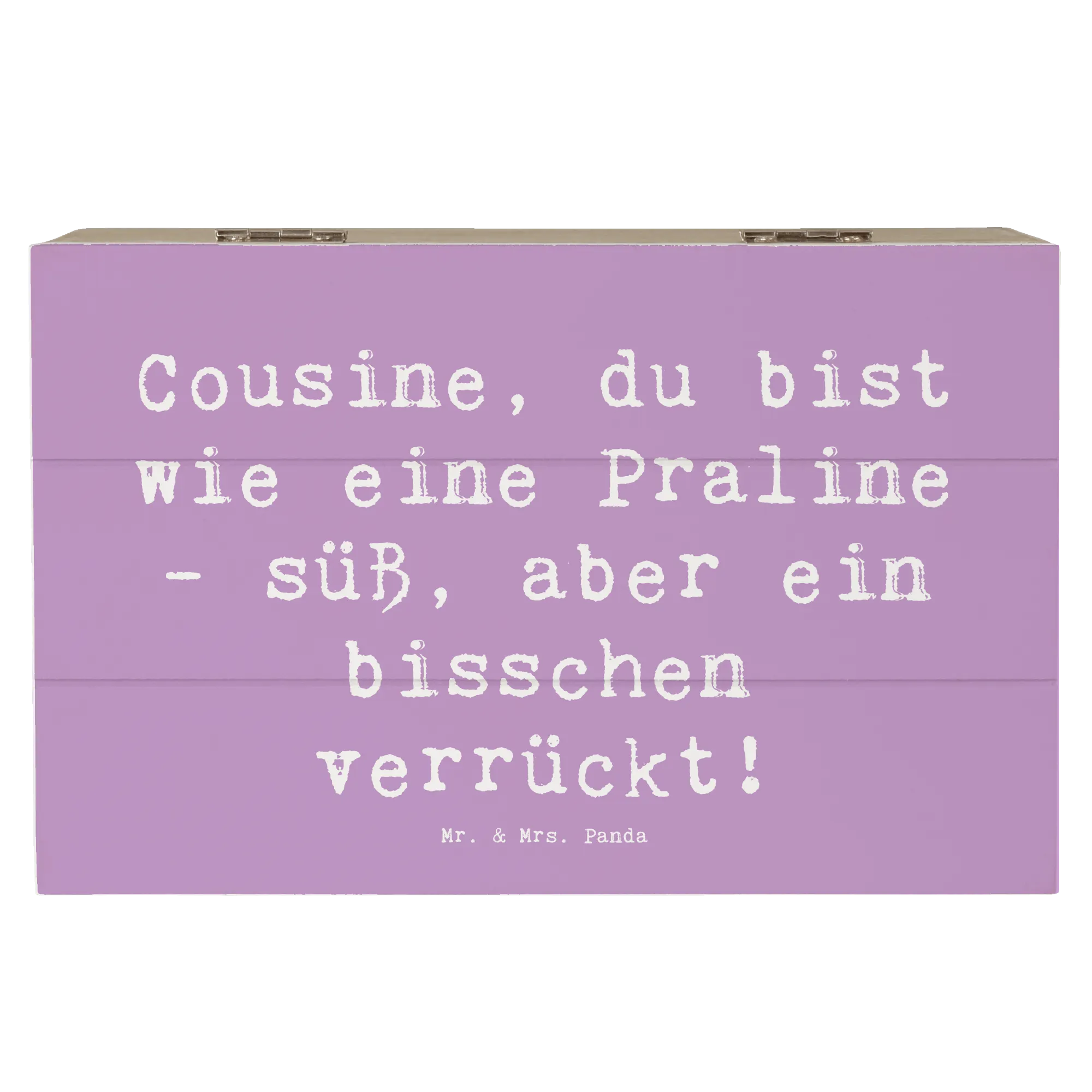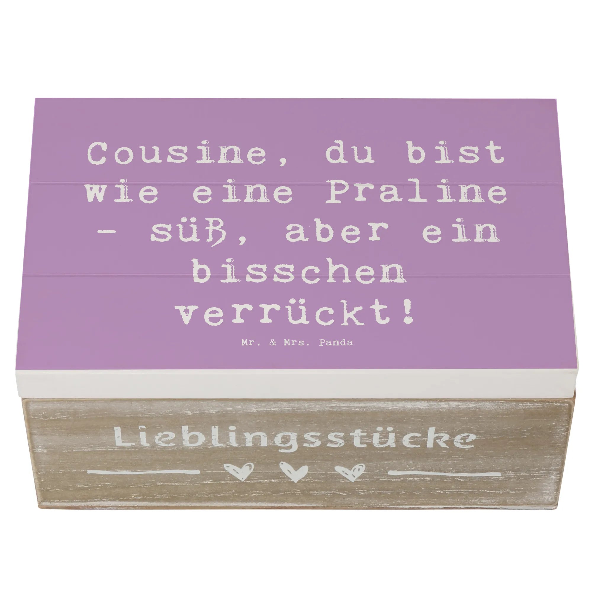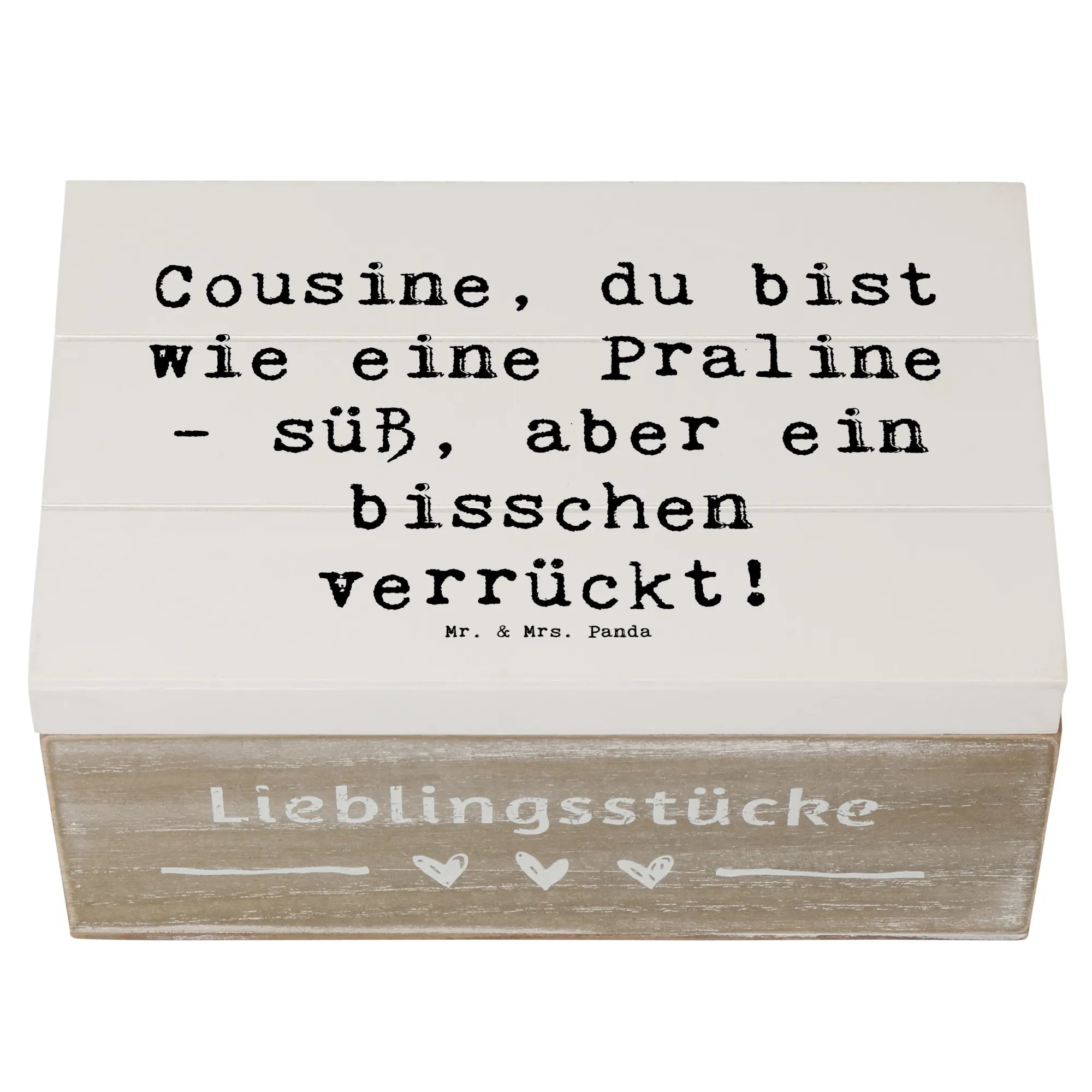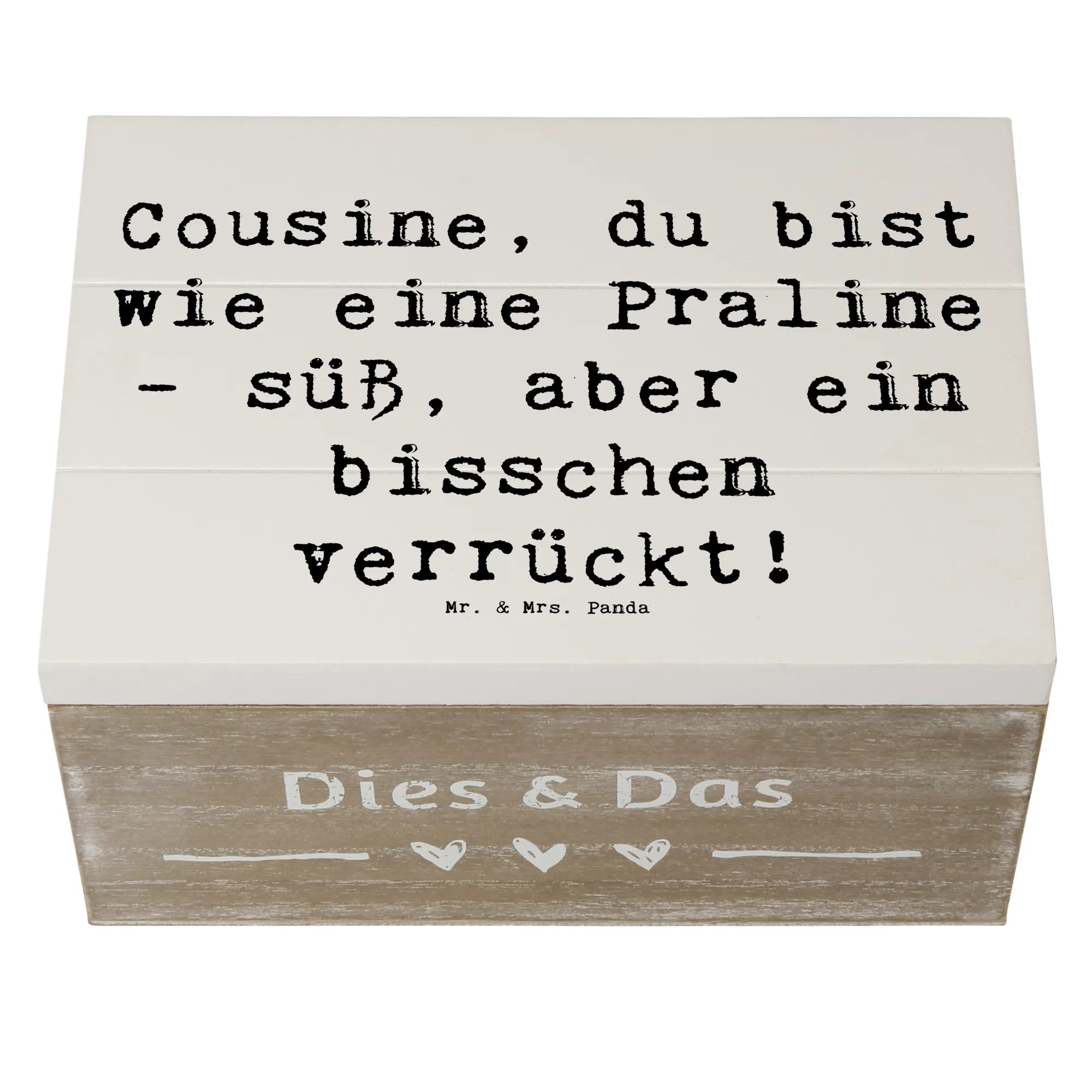 Die wunderschöne Holzkiste von Mr. & Mrs. Panda ist das perfekte Geschenk für Deine liebste Cousine! Mit dem liebevollen Motiv und dem Spruch 'Cousine, du bist wie eine Praline - süß, aber ein bisschen verrückt!' bringt diese Kiste nicht nur einen Hauch von Humor in Eure Beziehung, sondern ist auch ein wunderschöner Aufbewahrungsort für die kostbarsten Erinnerungen.