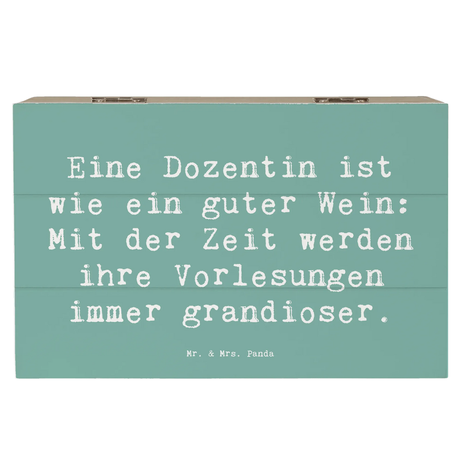 Entdecke unsere bezaubernde Holzkiste mit dem Motto "Eine Dozentin ist wie ein guter Wein: Mit der Zeit werden ihre Vorlesungen immer grandioser." von Mr. & Mrs. Panda! Diese wunderschöne Holzkiste ist der perfekte Aufbewahrungsort für all deine Schätze. Ob persönliche Erinnerungen, besondere Geschenke oder kleine Dekorationen - diese Kiste bietet nicht nur Platz, sondern auch einen charmanten Anblick.