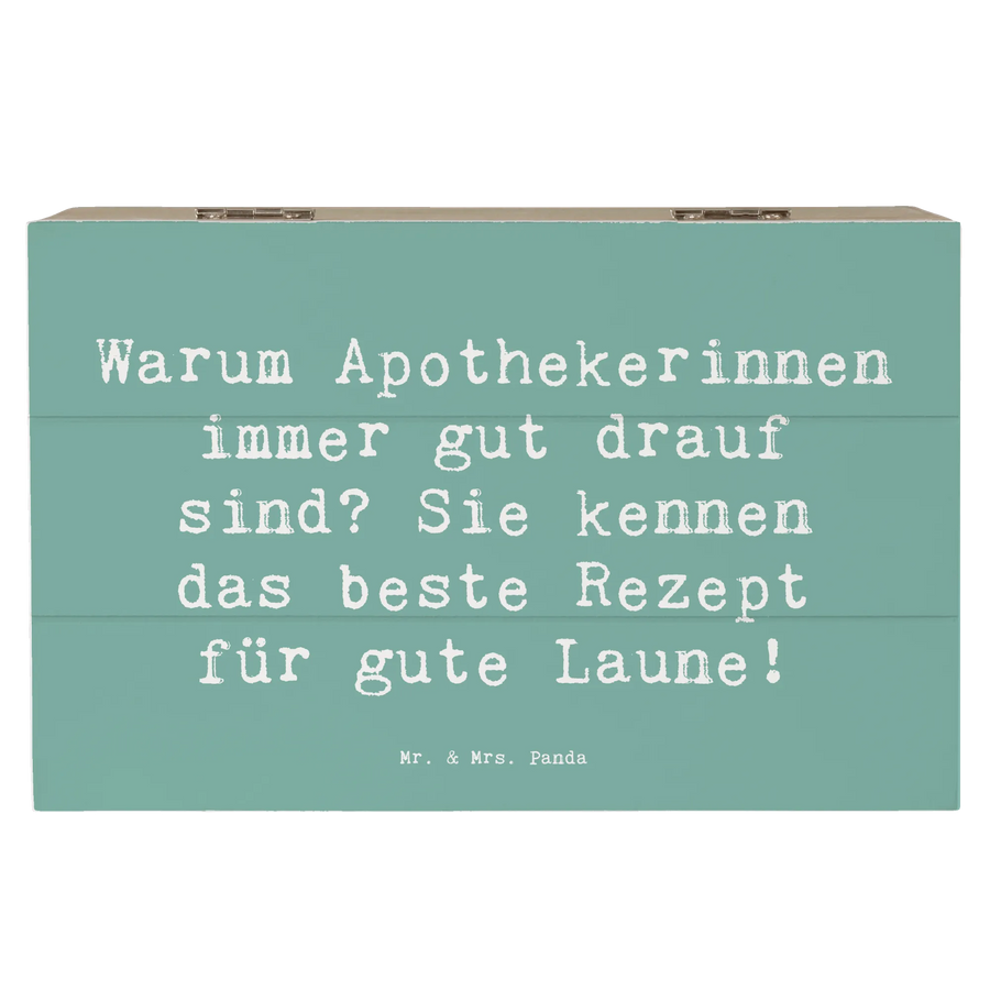 Die wunderschöne Holzkiste von Mr. & Mrs. Panda ist das perfekte Geschenk für alle Apothekerinnen! Mit dem liebevoll gestalteten Motiv "Warum Apothekerinnen immer gut drauf sind? Sie kennen das beste Rezept für gute Laune!" zaubert diese Kiste ein Lächeln in jedes Gesicht.