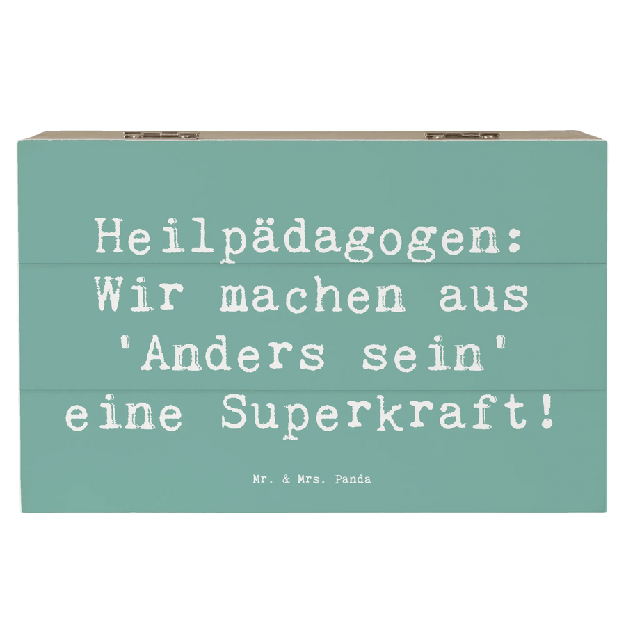 Die wunderschöne Holzkiste für Heilpädagoginnen von Mr. & Mrs. Panda ist das perfekte Geschenk für jede Gelegenheit! Diese liebevoll gestaltete Schatzkiste zeigt nicht nur das einladende Motiv einer Heilpädagogin, sondern trägt auch den motivierenden Slogan: "Heilpädagogen: Wir machen aus 'Anders sein' eine Superkraft!"