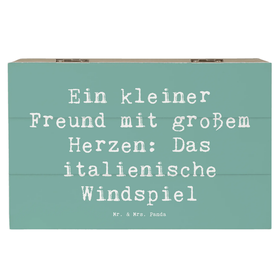 Die Kiste ist mit einem niedlichen Spruch verziert: "Ein kleiner Freund mit großem Herzen: Das italienische Windspiel". Dieses Motiv aus der Hunderassen-Kollektion von Mr. & Mrs. Panda wurde mit viel Liebe handgezeichnet und bringt nicht nur Freude, sondern auch ganz viel Charme in Dein Zuhause.