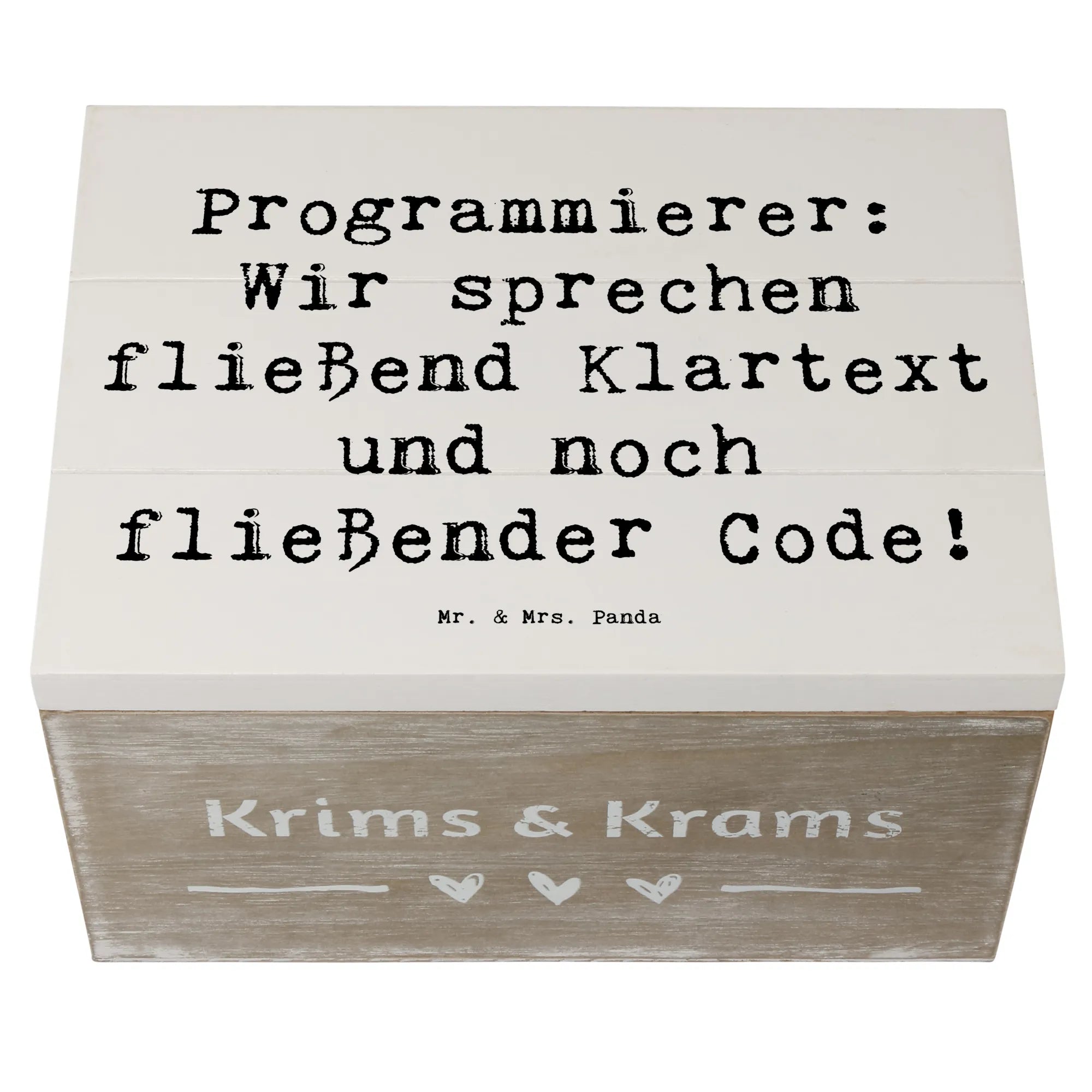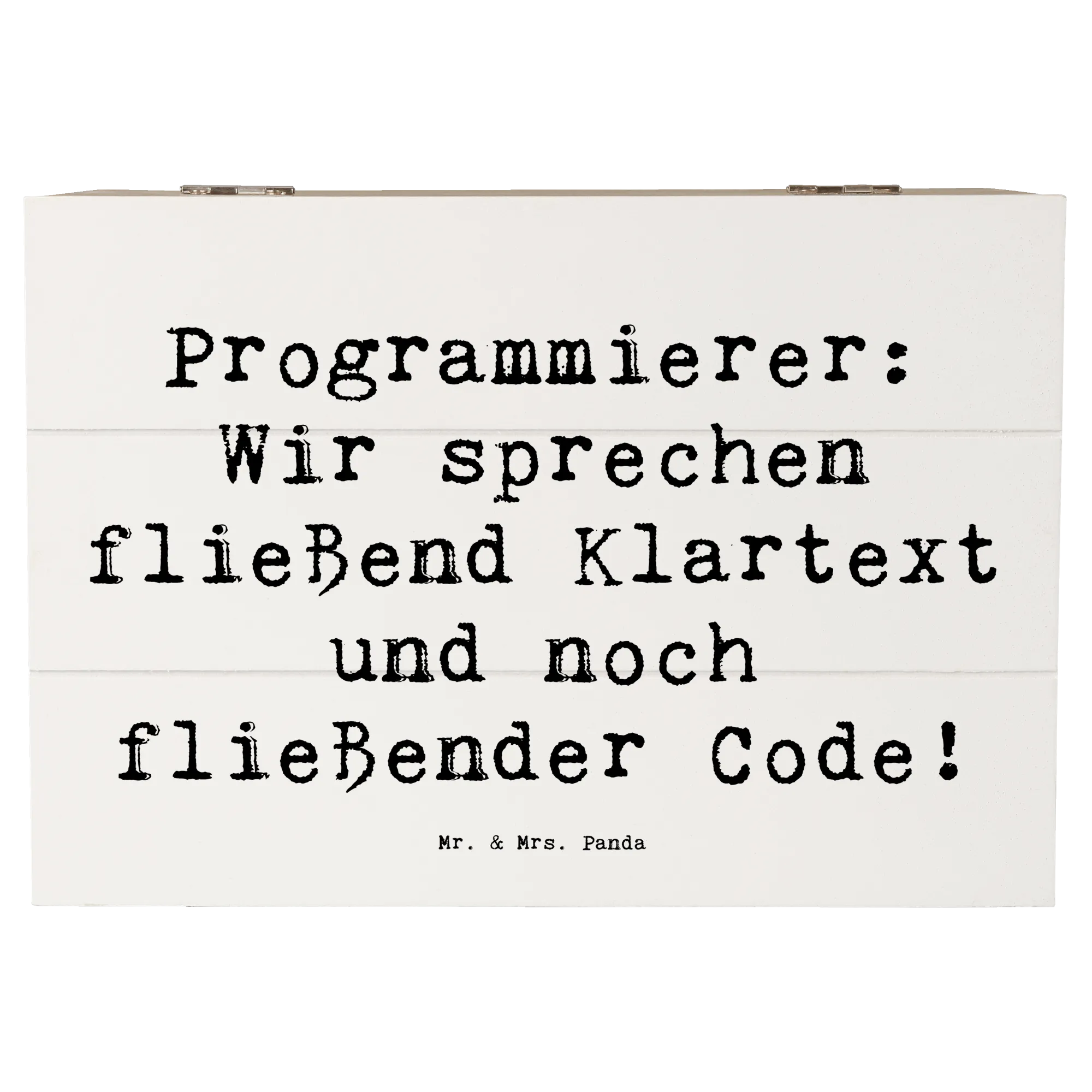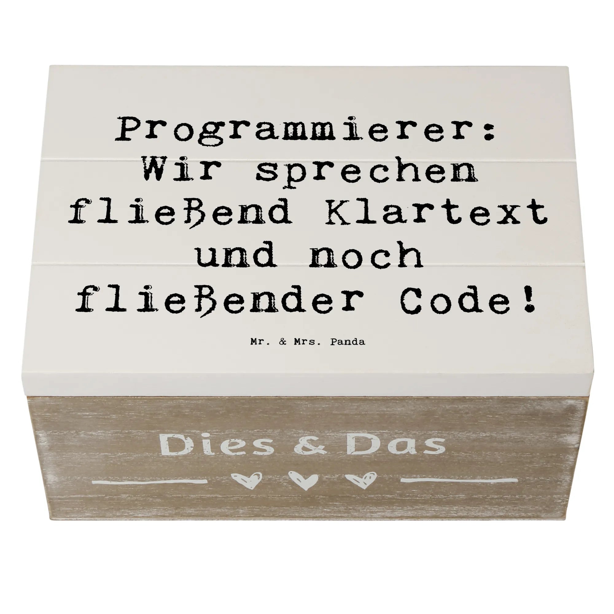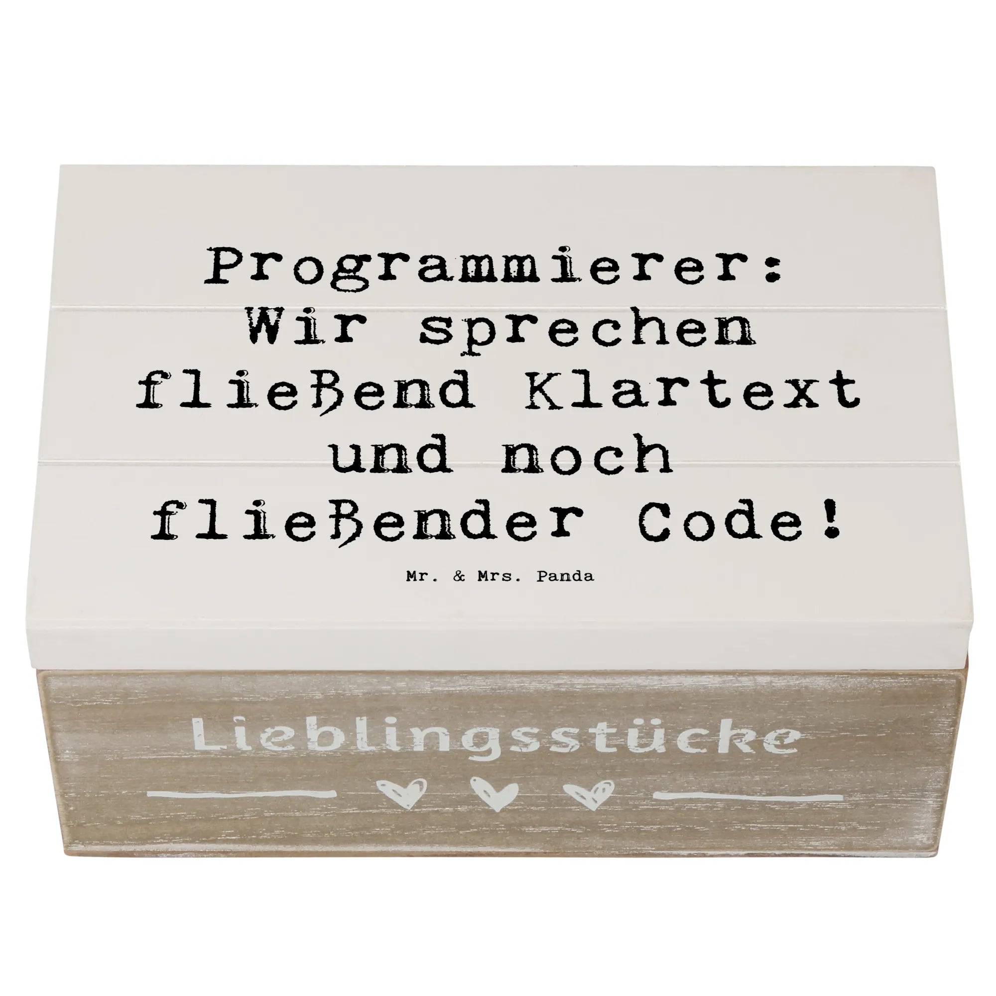 Die wunderschöne Holzkiste von Mr. & Mrs. Panda ist das perfekte Geschenk für alle Programmierer und IT-Profis! Mit ihrem liebevoll gestalteten Motiv und dem inspirierenden Spruch "Programmierer: Wir sprechen fließend Klartext und noch fließender Code!" bringt sie ein Lächeln auf die Gesichter der kreativen Köpfe in der Tech-Welt.