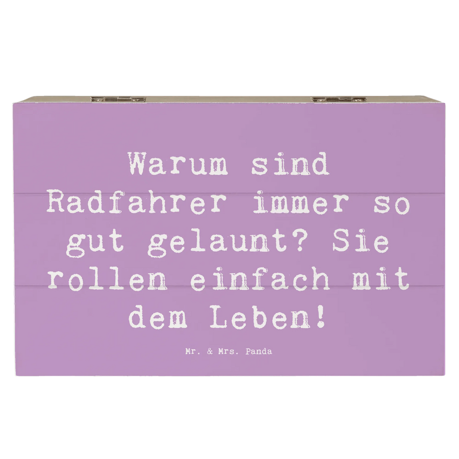 Entdecke die wunderschöne Holzkiste von Mr. & Mrs. Panda, die perfekt für Sportbegeisterte und Radsport-Fans geeignet ist! Diese liebevoll gestaltete Erinnerungskiste ist mit dem witzigen Spruch "Warum sind Radfahrer immer so gut gelaunt? Sie rollen einfach mit dem Leben!" bedruckt und ist ein Muss für jeden Fahrradliebhaber.