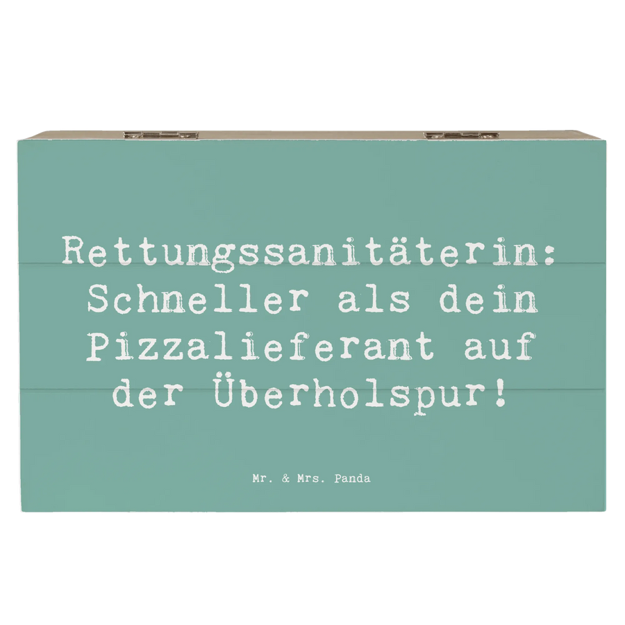 Die wunderschöne Holzkiste von Mr. & Mrs. Panda ist nicht nur ein praktischer Aufbewahrungsort, sondern auch ein liebevolles Geschenk für alle Rettungssanitäterinnen und Rettungssanitäter in deinem Leben. Mit dem witzigen Slogan "Rettungssanitäterin: Schneller als dein Pizzalieferant auf der Überholspur!" wird diese Kiste zum perfekten Ausdruck für den außergewöhnlichen Job dieser heldenhaften Berufe.