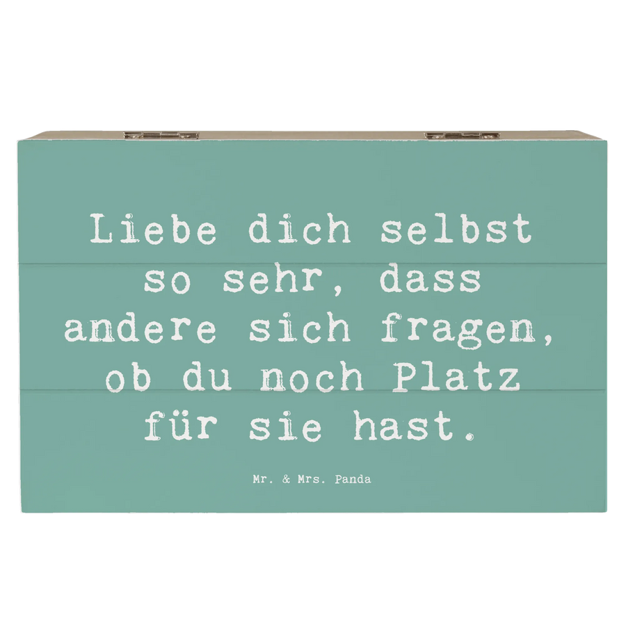 Entdecke die wunderschöne Holzkiste von Mr. & Mrs. Panda, die perfekt für jeden Anlass ist! Diese besondere Kiste mit dem Motiv Selbstakzeptanz und dem inspirierenden Spruch "Liebe dich selbst so sehr, dass andere sich fragen, ob du noch Platz für sie hast" ist nicht nur ein toller Blickfang, sondern auch ein vielseitiges Aufbewahrungsobjekt.