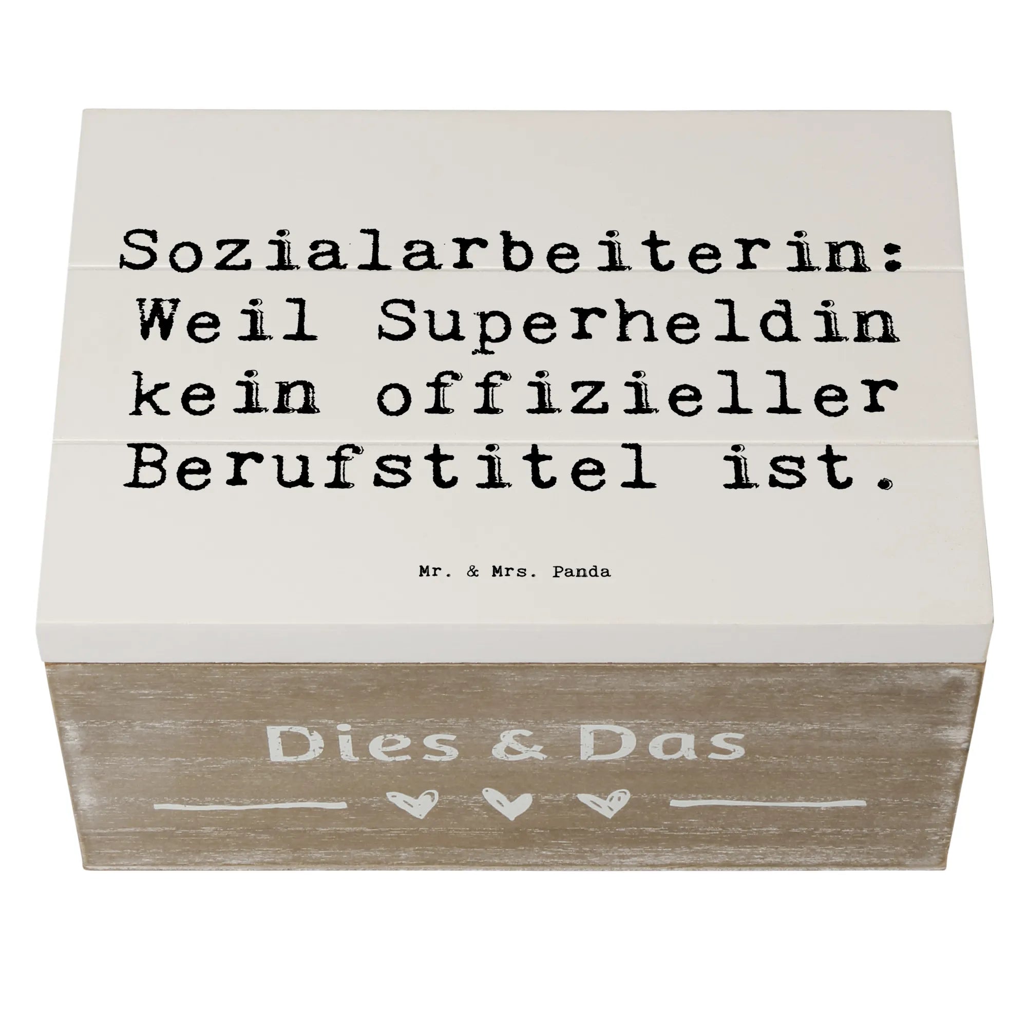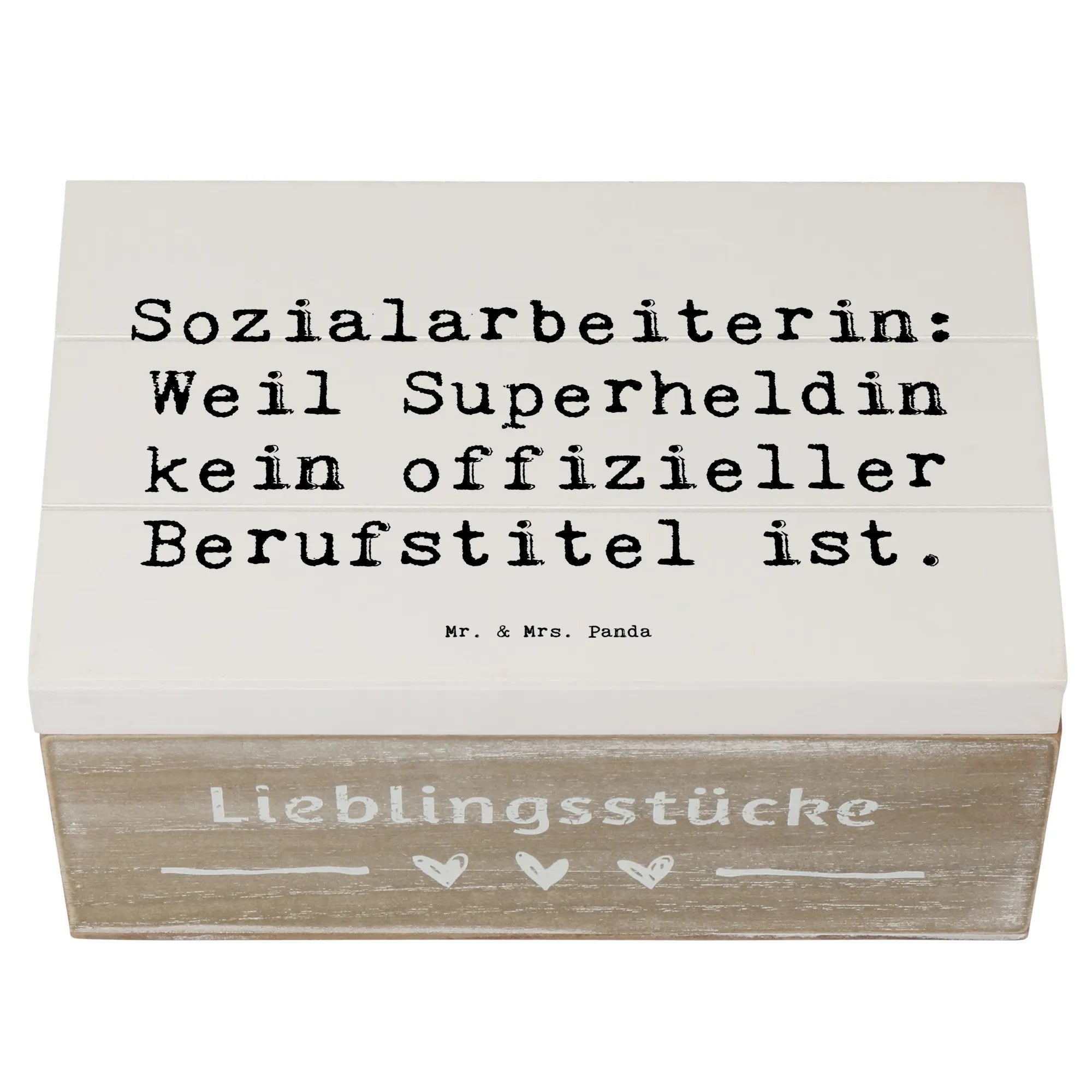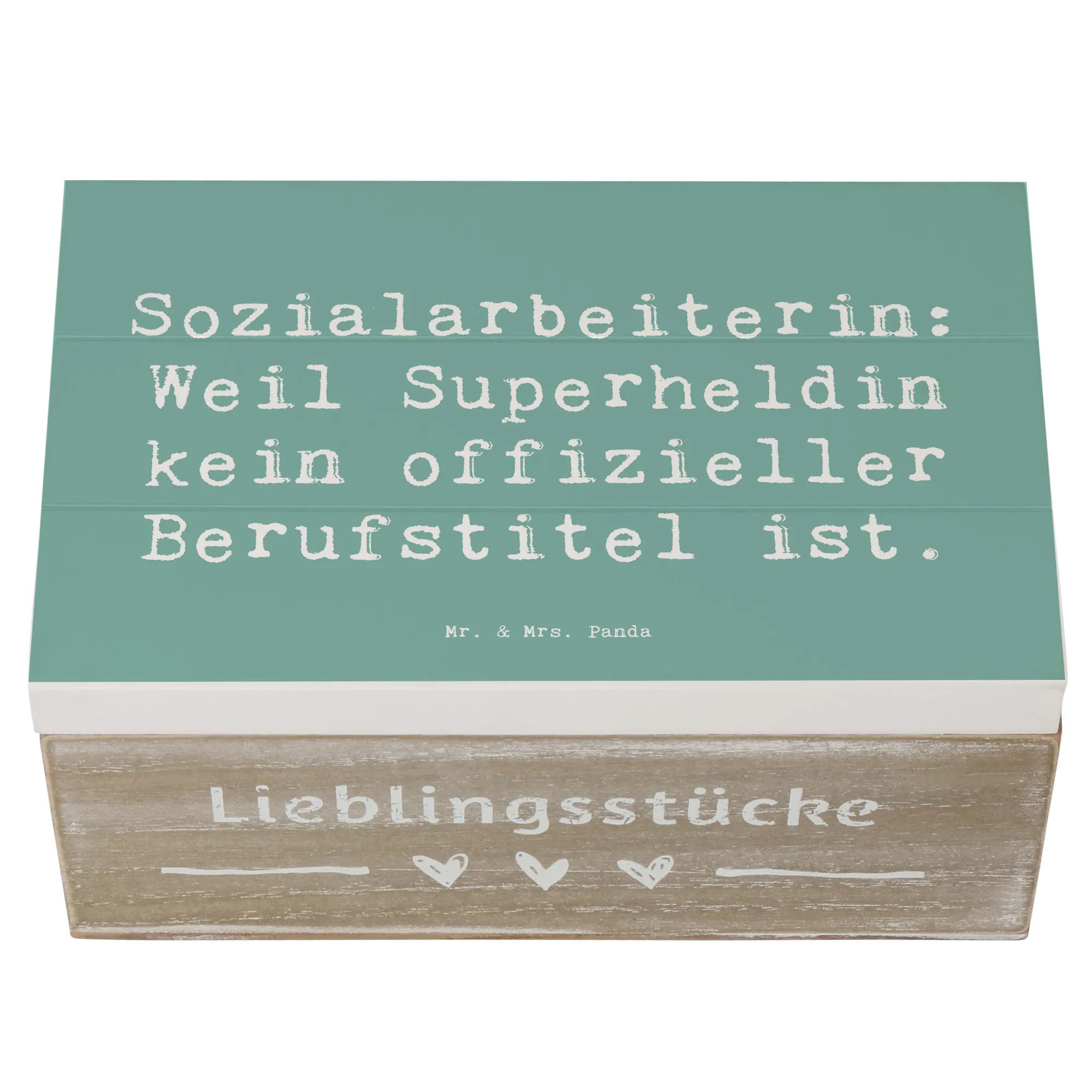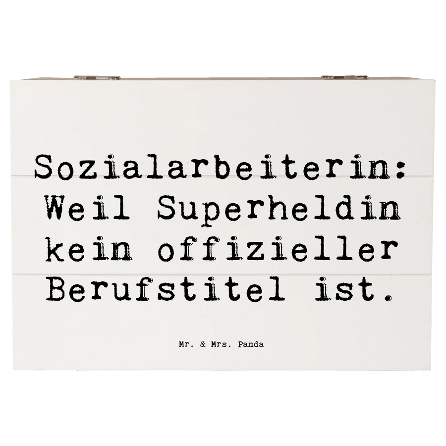 Mr. & Mrs. Panda Holzkiste „Sozialarbeiterin“ – Die perfekte Erinnerungskiste für alle Heldinnen des Sozialwesens. Auf der Vorderseite findest Du den liebevollen Spruch „Sozialarbeiterin: Weil Superheldin kein offizieller Berufstitel ist.“, handgezeichnet im typischen Aquarellstil von Mrs. Panda.