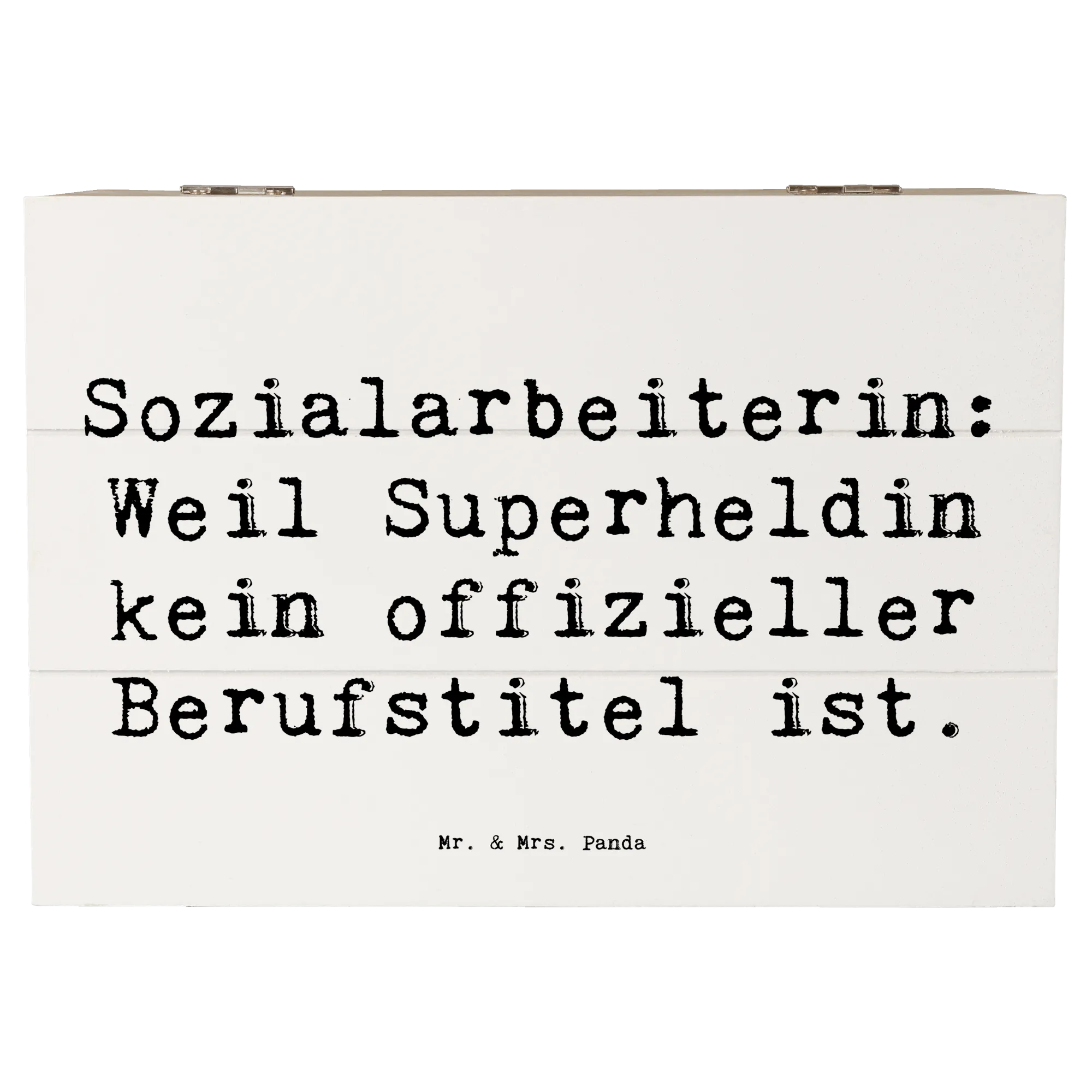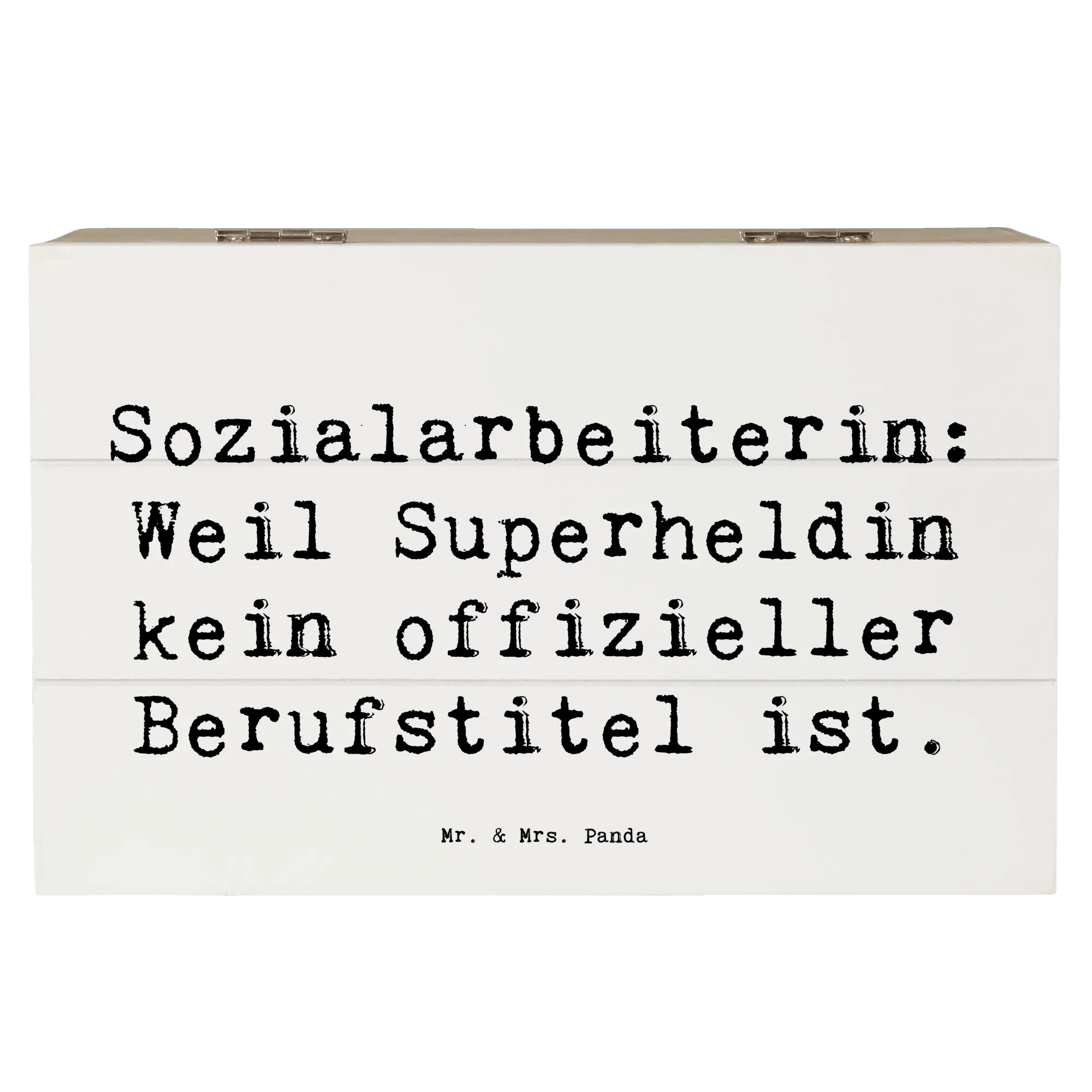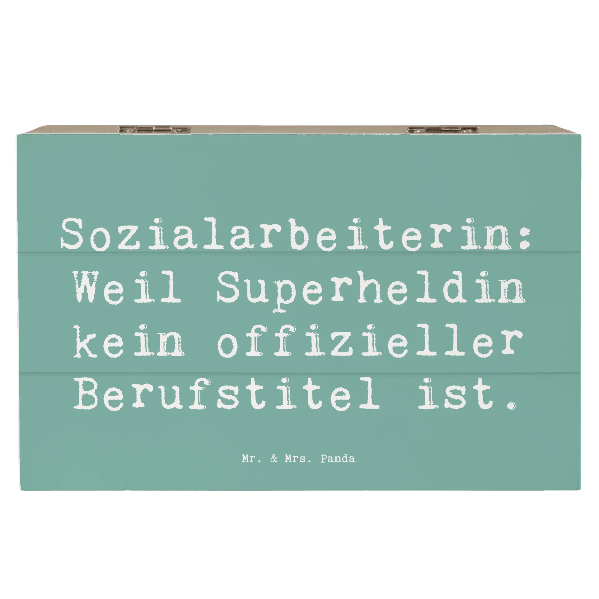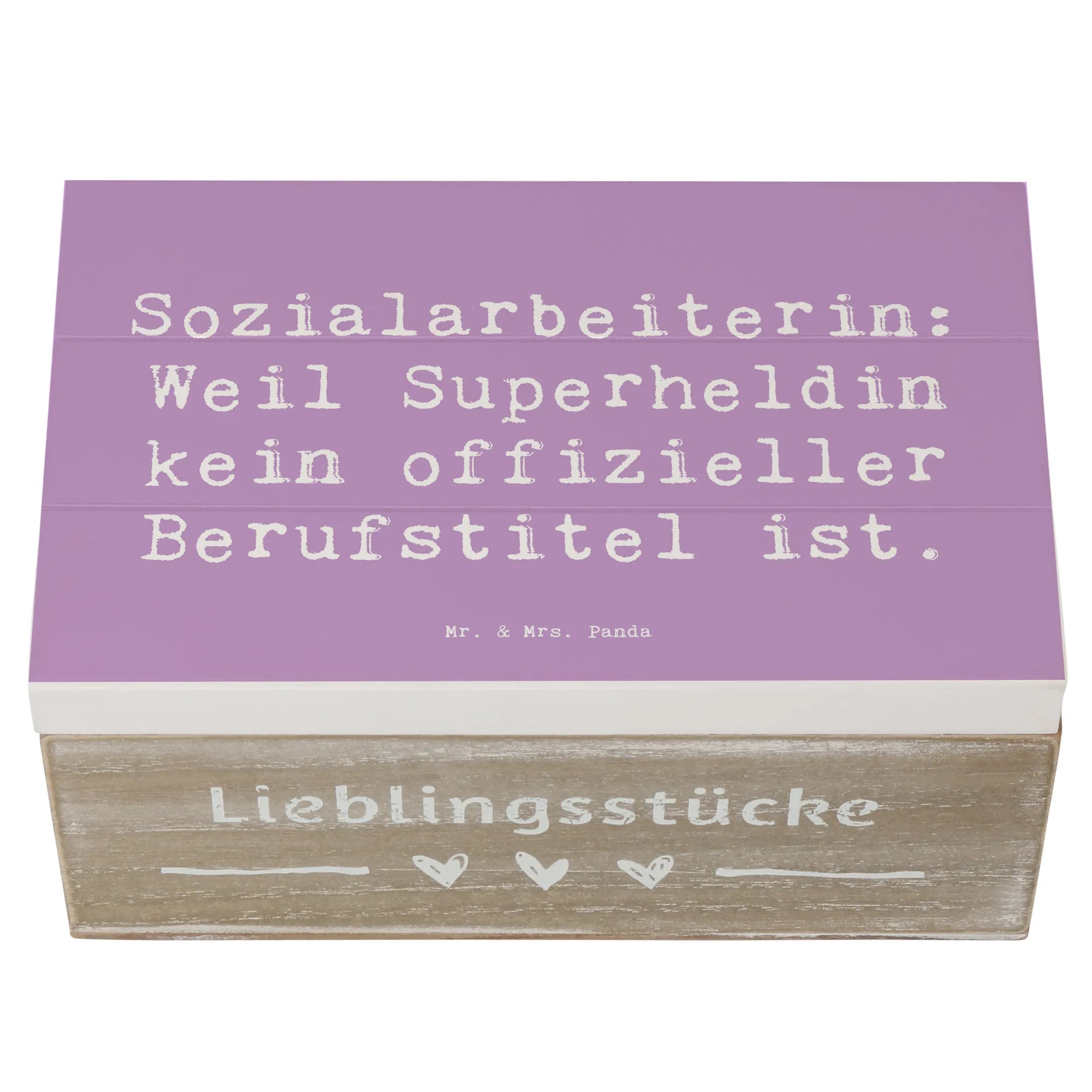 Mr. & Mrs. Panda Holzkiste „Sozialarbeiterin“ – Die perfekte Erinnerungskiste für alle Heldinnen des Sozialwesens. Auf der Vorderseite findest Du den liebevollen Spruch „Sozialarbeiterin: Weil Superheldin kein offizieller Berufstitel ist.“, handgezeichnet im typischen Aquarellstil von Mrs. Panda.