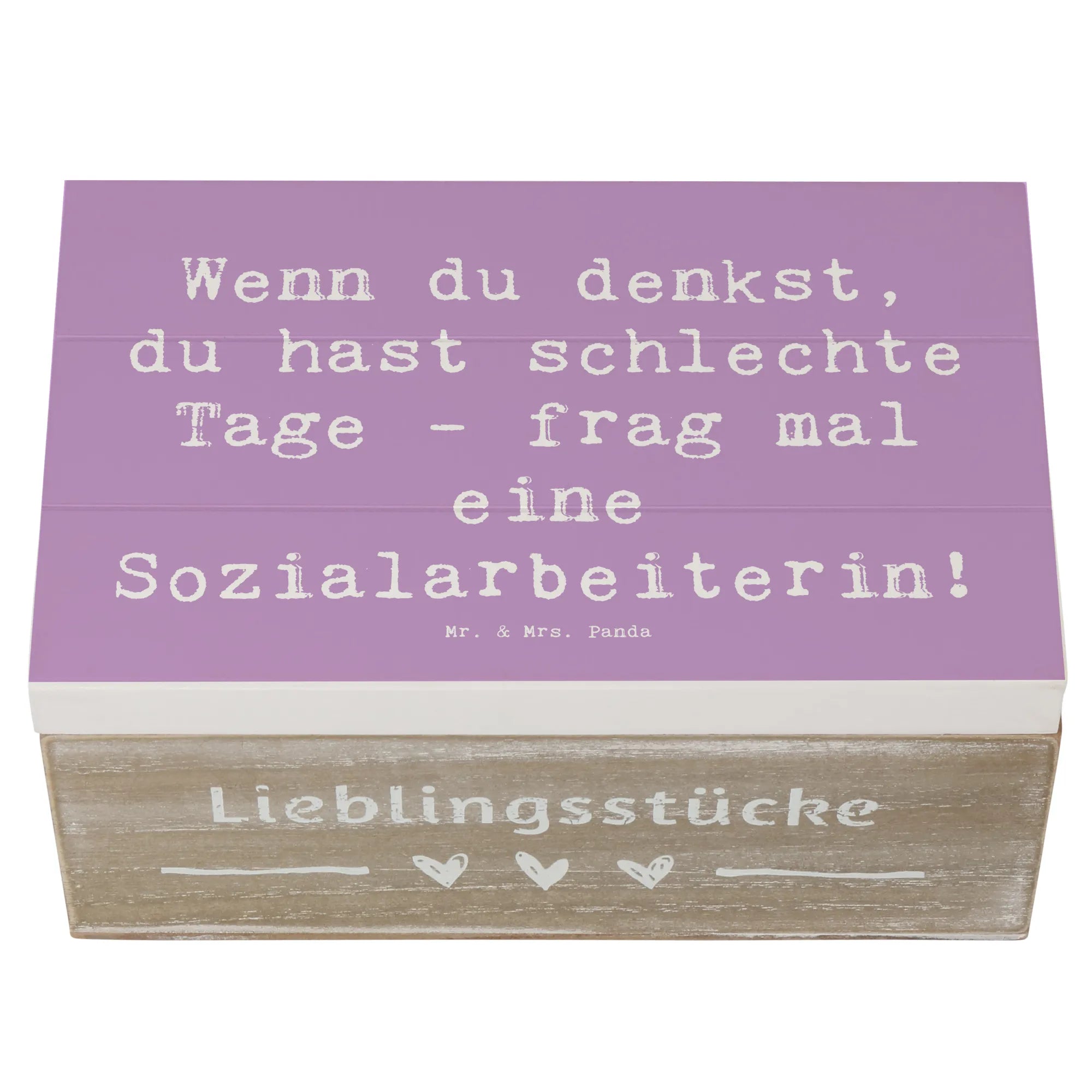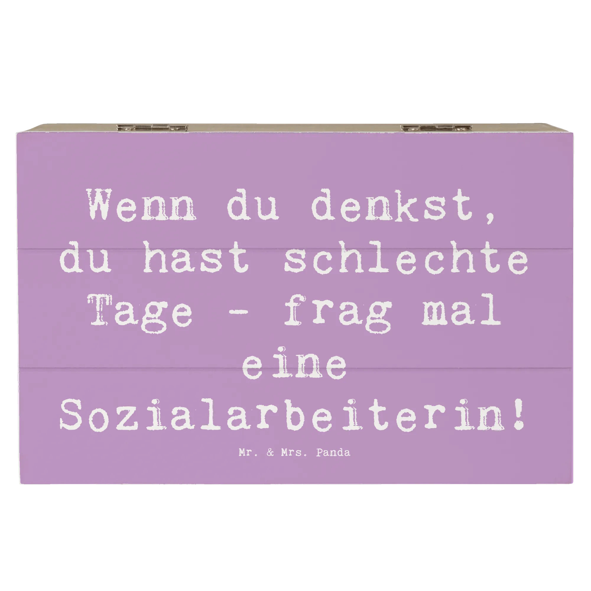 Mr. & Mrs. Panda Holzkiste „Sozialarbeiterin“ – ein Geschenk mit Herz und Haltung. Diese liebevoll gestaltete Aufbewahrungsbox Holz trägt den frechen und warmen Spruch: „Wenn du denkst, du hast schlechte Tage - frag mal eine Sozialarbeiterin!“ Auf einem zarten Lavendeltraum-Hintergrund gedruckt, ist diese Holzbox mit Deckel ideal, um Wertschätzung zu zeigen und zugleich praktisch zu sein.